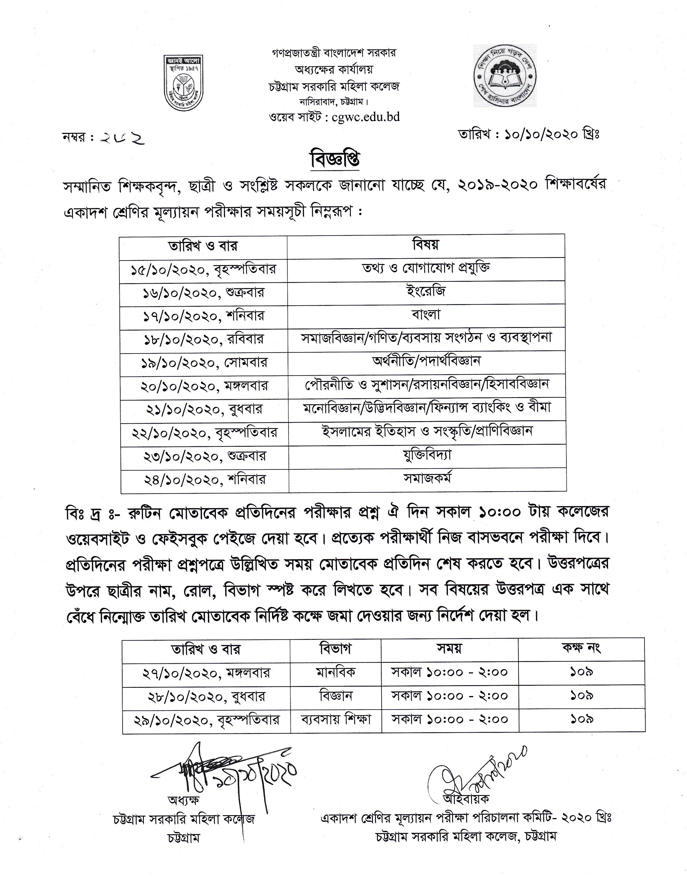২০১৯-২০২০ শিক্ষাবর্ষের একাদশ শ্রেণির মূল্যায়ন পরীক্ষার সময়সূচি প্রকাশ (১০/১০/২০২০ খ্রিঃ)