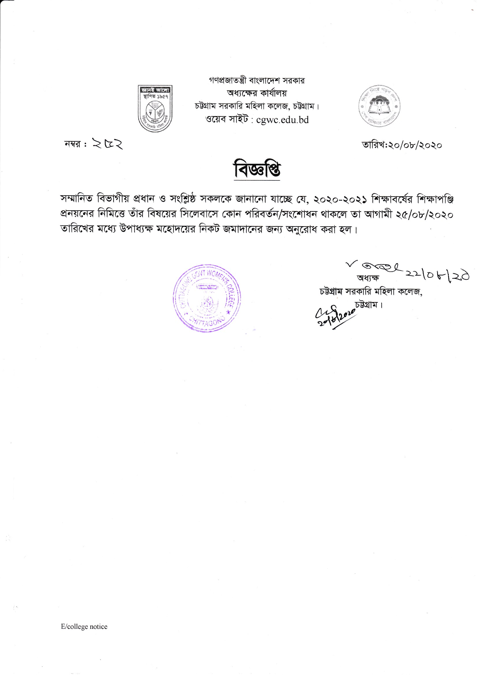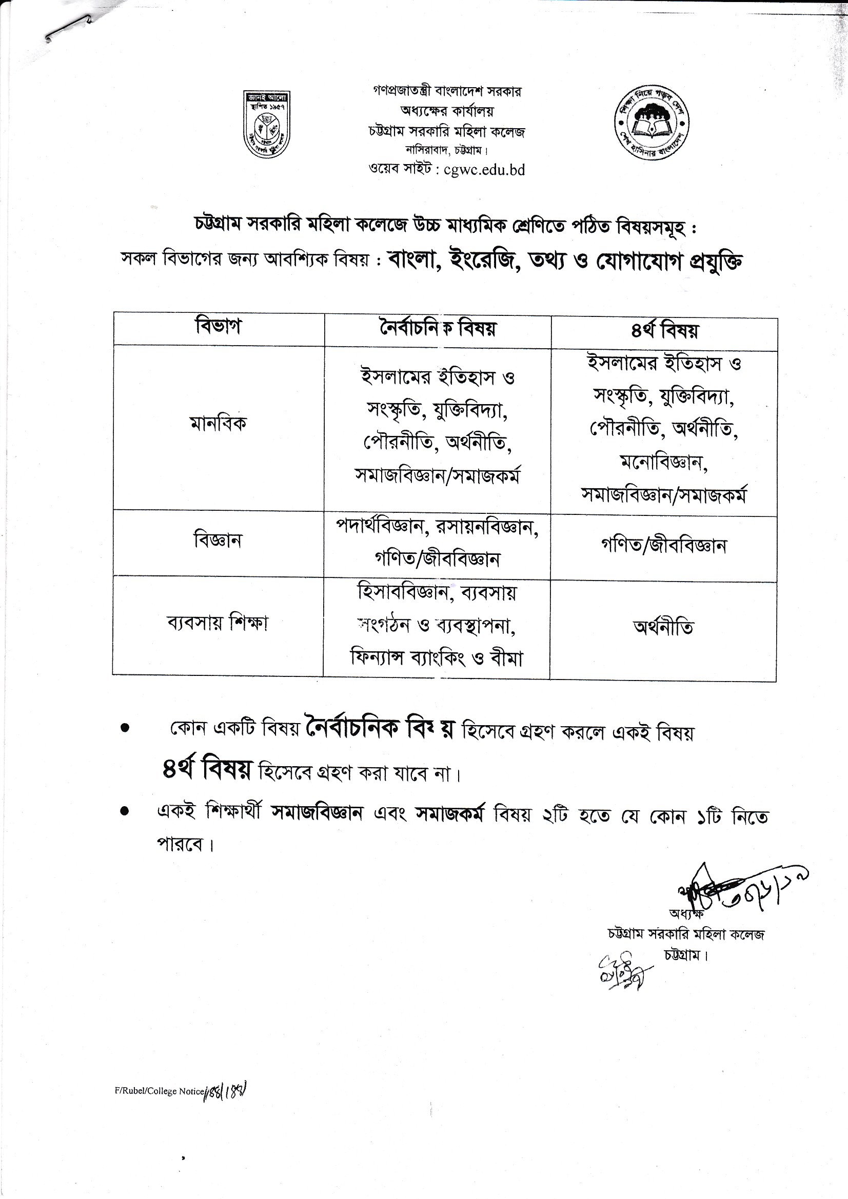 2020-2021 শিক্ষাবর্ষের ছাত্রীদের বিষয় নির্বাচন বিজ্ঞপ্তি
