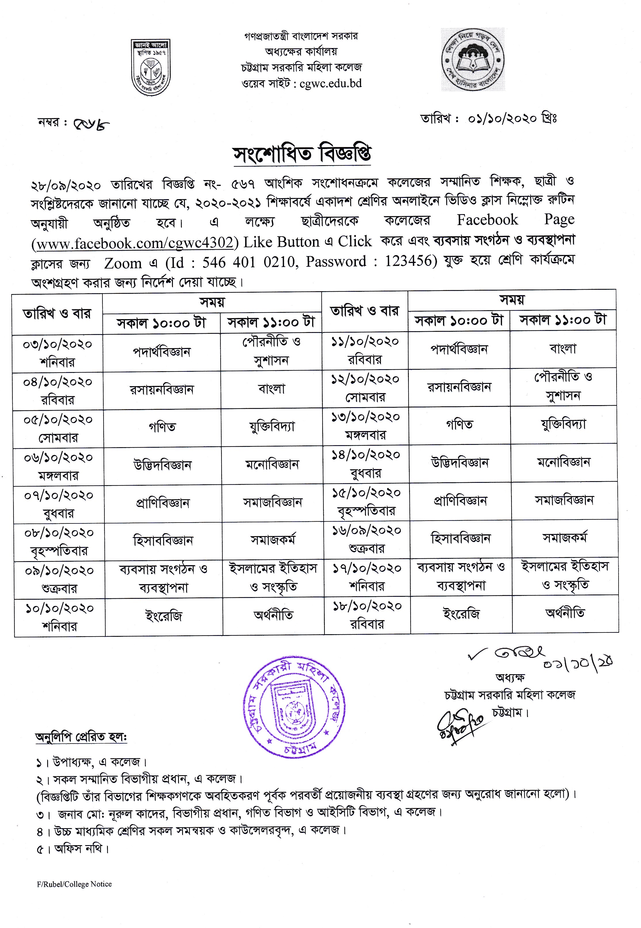 ২০২০-২০২১ শিক্ষাবর্ষে উচ্চ মাধ্যমিক একাদশ শ্রেণির সংশোধিত অনলাইন ক্লাস রুটিন প্রকাশ (০১/১০/২০২০)