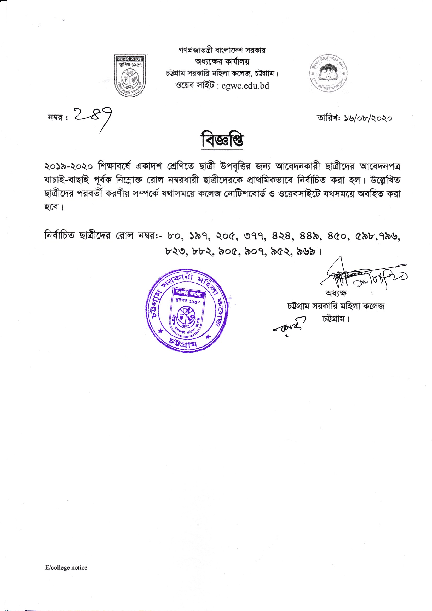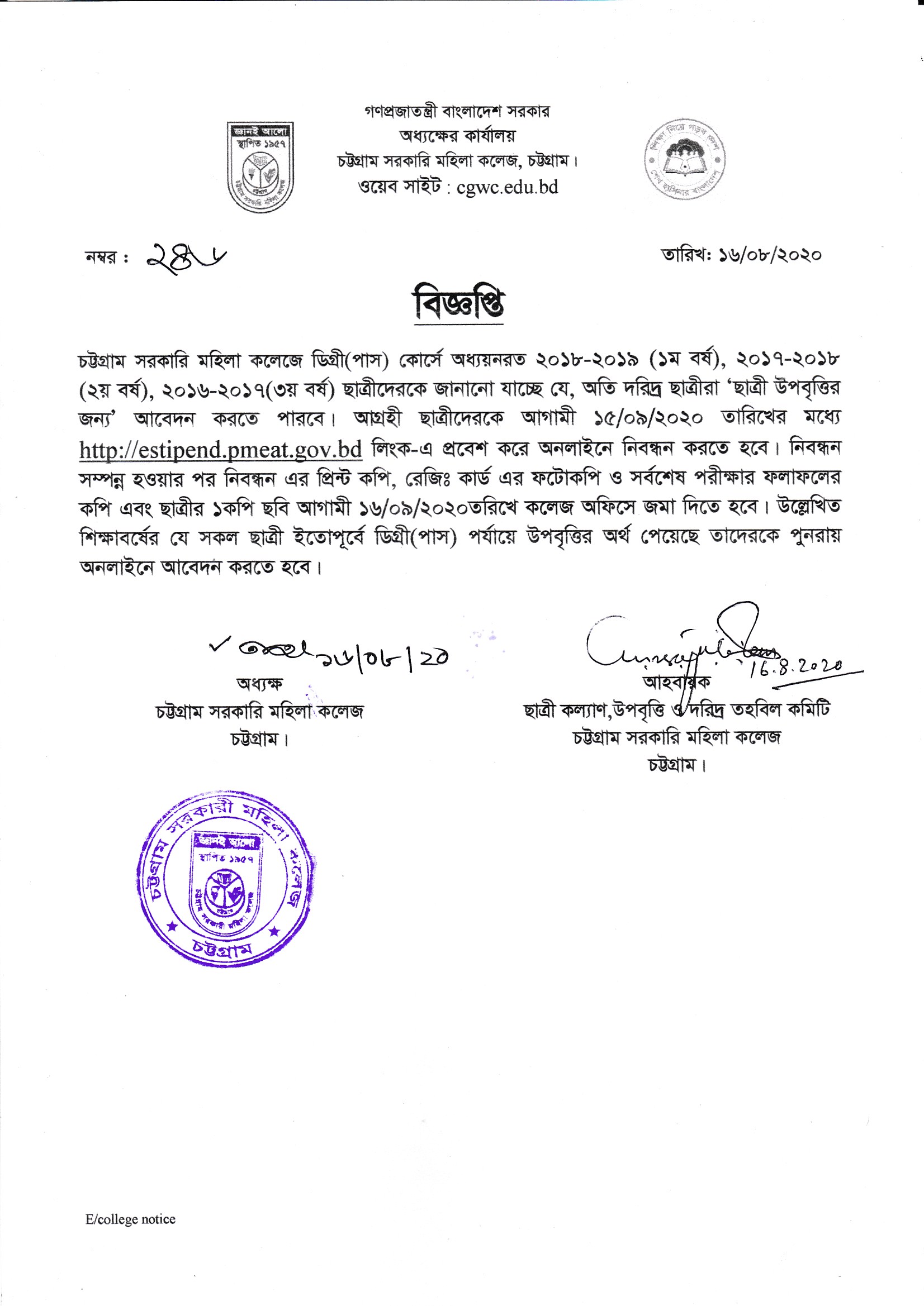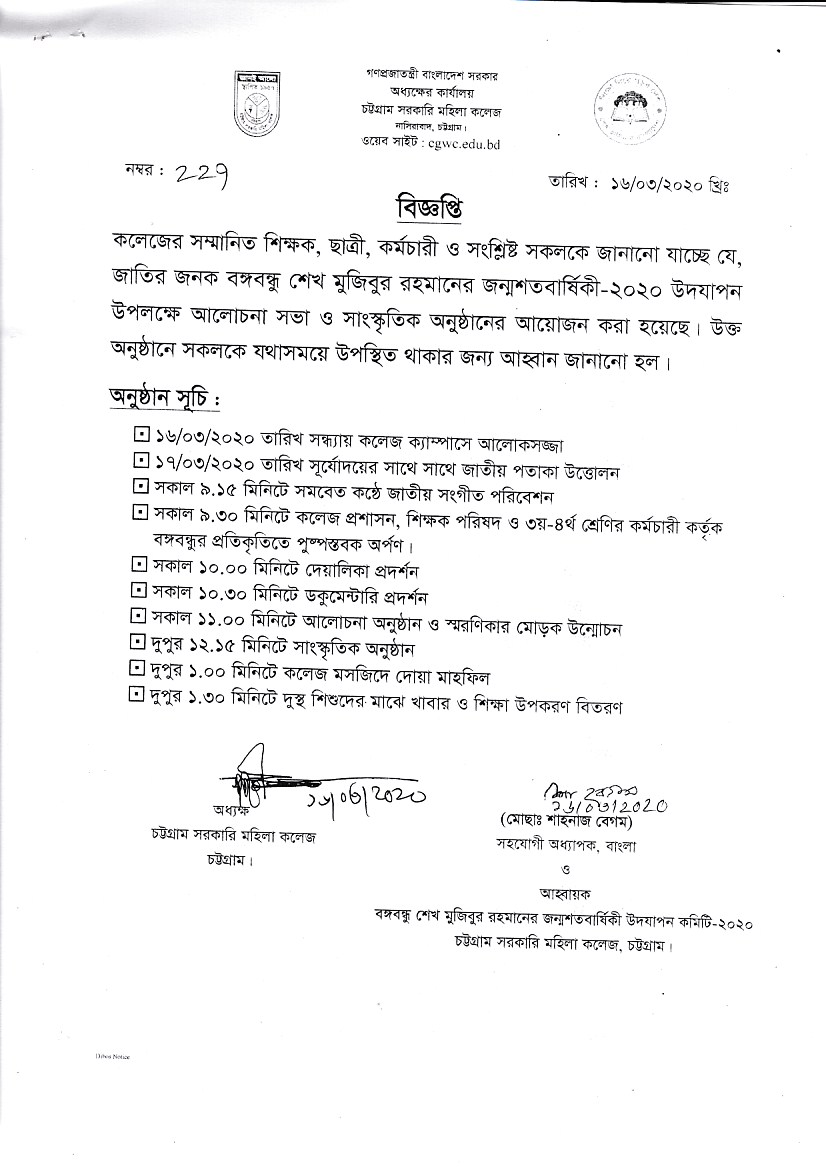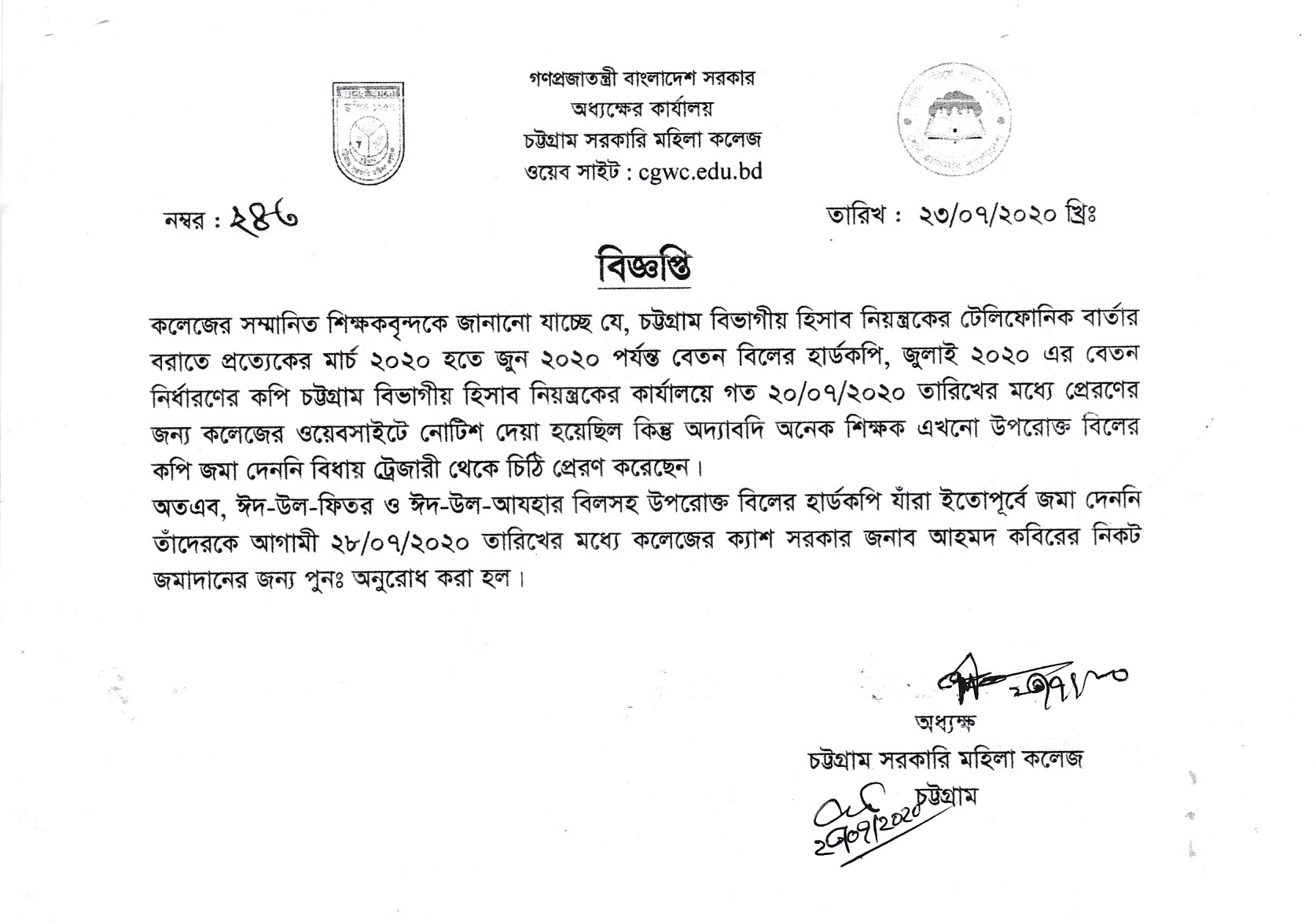 কলেজের সম্মানিত সকল শিক্ষকের মার্চ ২০২০ খ্রিঃ হতে জুন ২০২০ পর্যন্ত বেতন বিল ও বেতন নির্ধারণীর প্রিন্ট কপি কলেজের হিসাব শাখায় প্রেরণ প্রসঙ্গে।