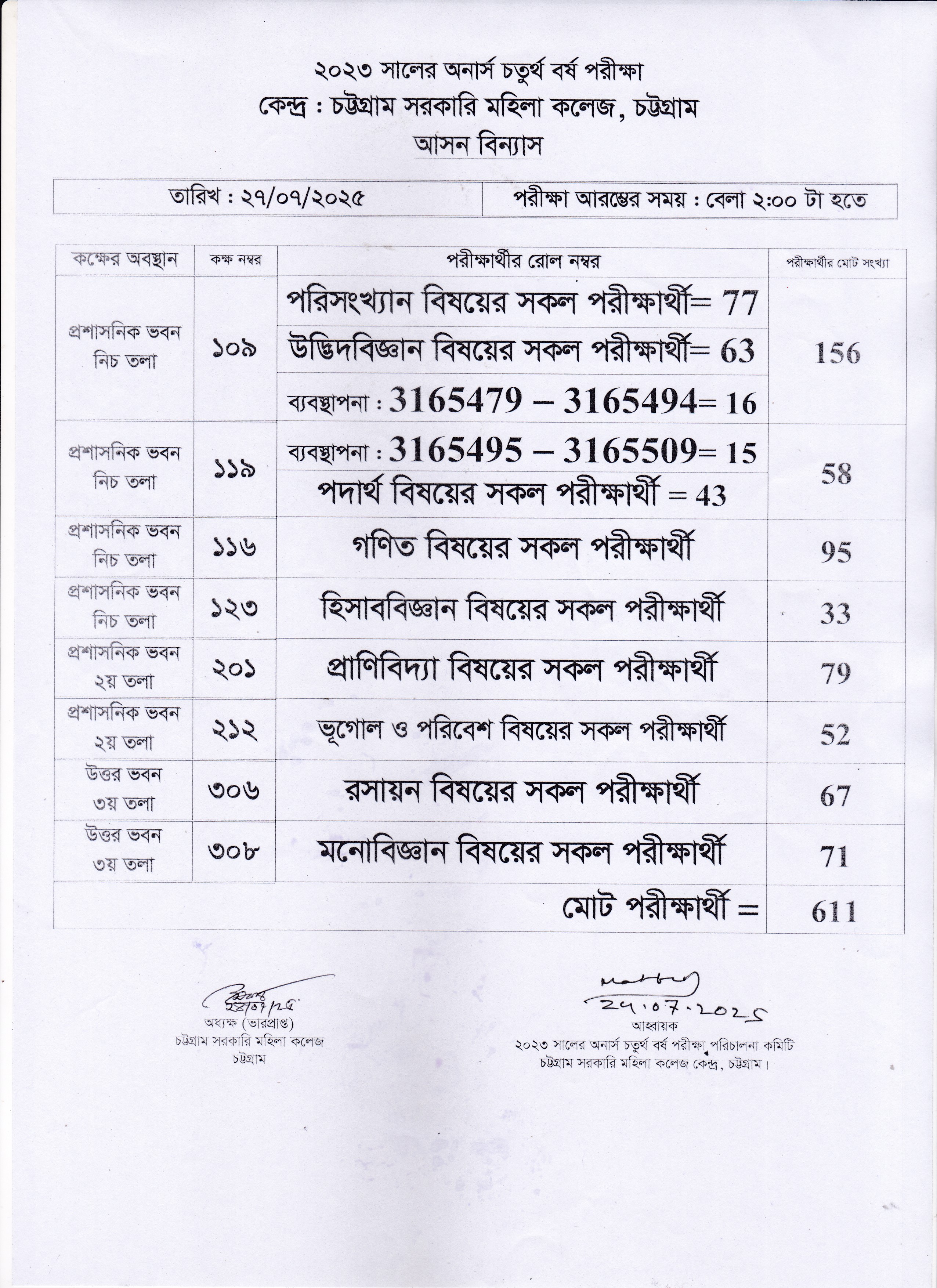আগামী ২৭/০৭/২০২৫ তারিখের ২০২৩ সালের অনার্স ৪র্থ বর্ষ পরীক্ষার আসন বিন্যাস