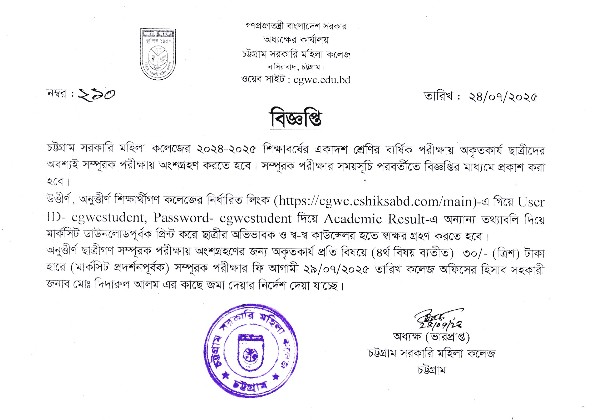 ২০২৪-২০২৫ শিক্ষাবর্ষে স্নাতক (সম্মান) ১ম বর্ষে ভর্তির জন্য ২য় মেধা তালিকায় স্থানপ্রাপ্ত শিক্ষার্থীদের ভর্তি ও ১ম মেধা তালিকায় ভর্তিকৃত শিক্ষার্থীদের বিষয় পরিবর্তন সংক্রান্ত বিজ্ঞপ্তি