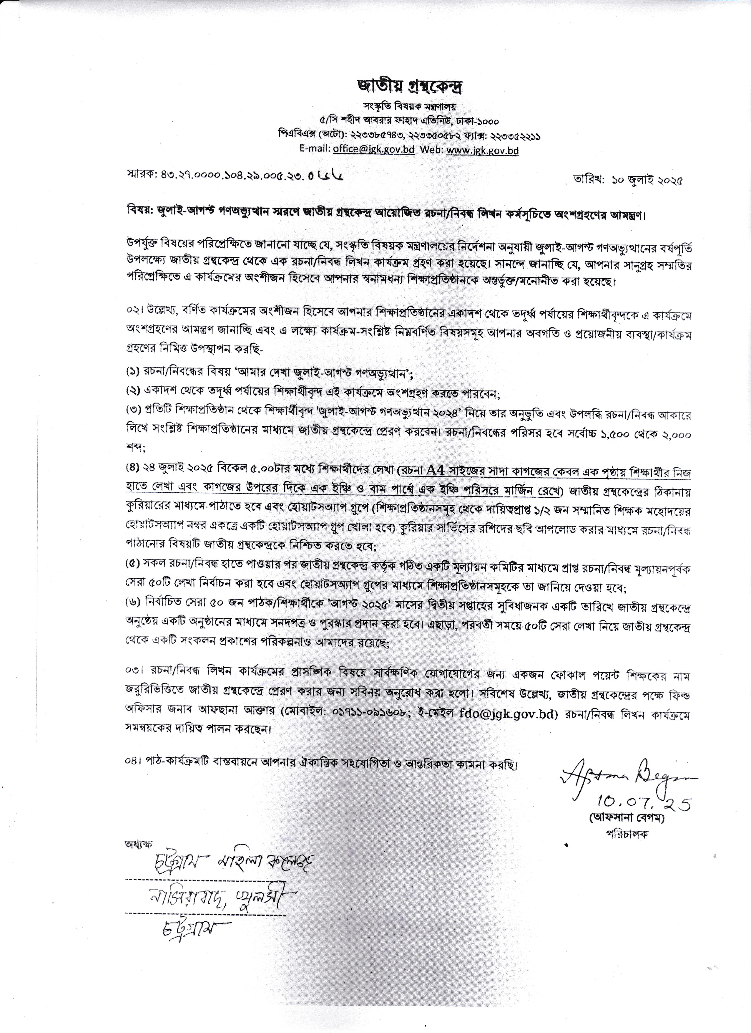 জুলাই-আগস্ট গণঅভ্যুত্থান স্মরণে জাতীয় গ্রন্থকেন্দ্র আয়োজিত রচনা/নিবন্ধ লিখন কর্মসূচিতে অংশগ্রহণ আগামী ৩১/০৭/২০২৫ তারিখ পর্যন্ত করা যাবে।