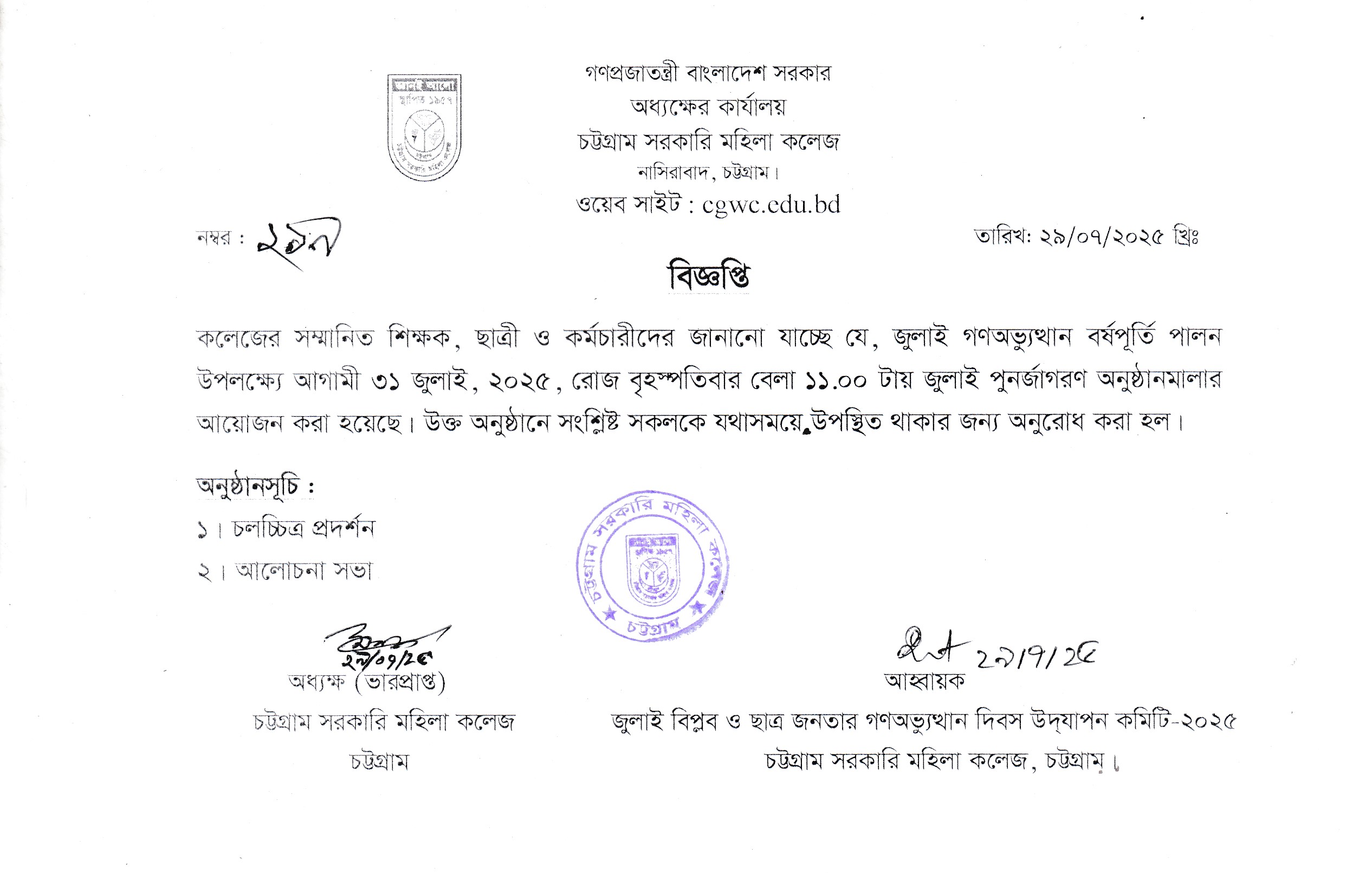 জুলাই গণঅভ্যুত্থান বর্ষপূর্তি পালন সংক্রান্ত বিজ্ঞপ্তি