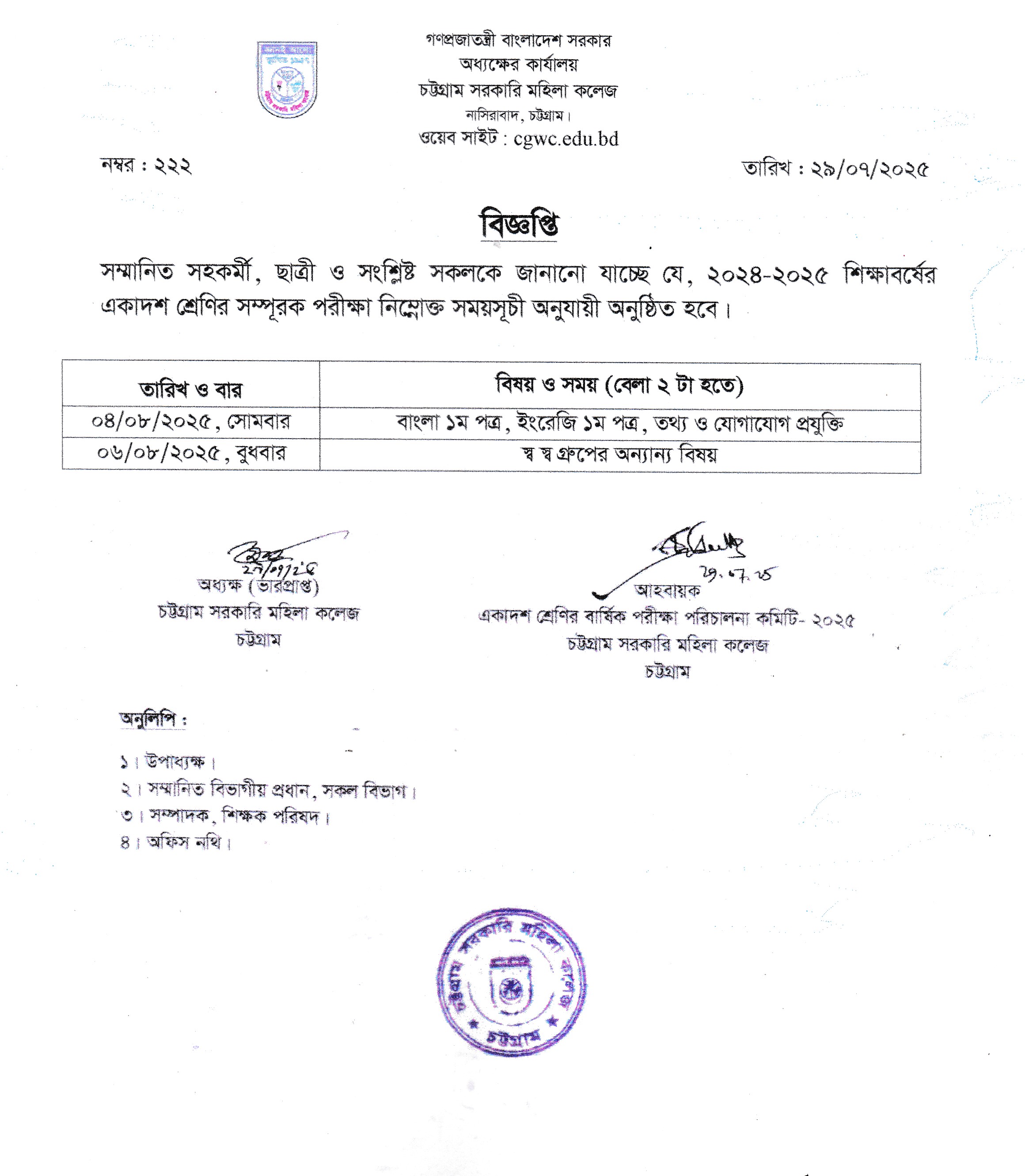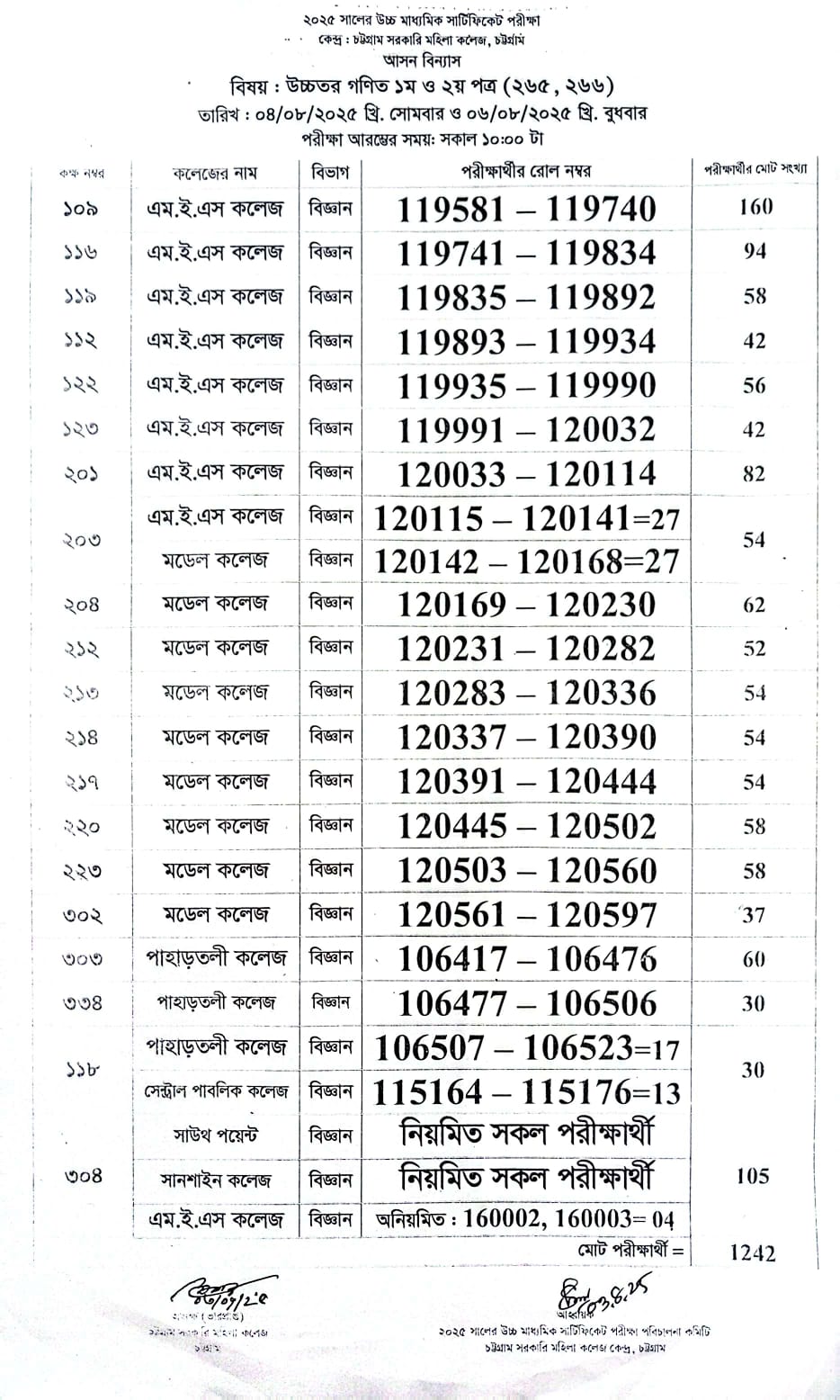 ২০২৫ সালের এইচএসসি পরীক্ষার আগামী ৩১/০৭/২০২৫ ও ০৩/০৮/২০২৫ তারিখের পরীক্ষার আসন বিন্যাস