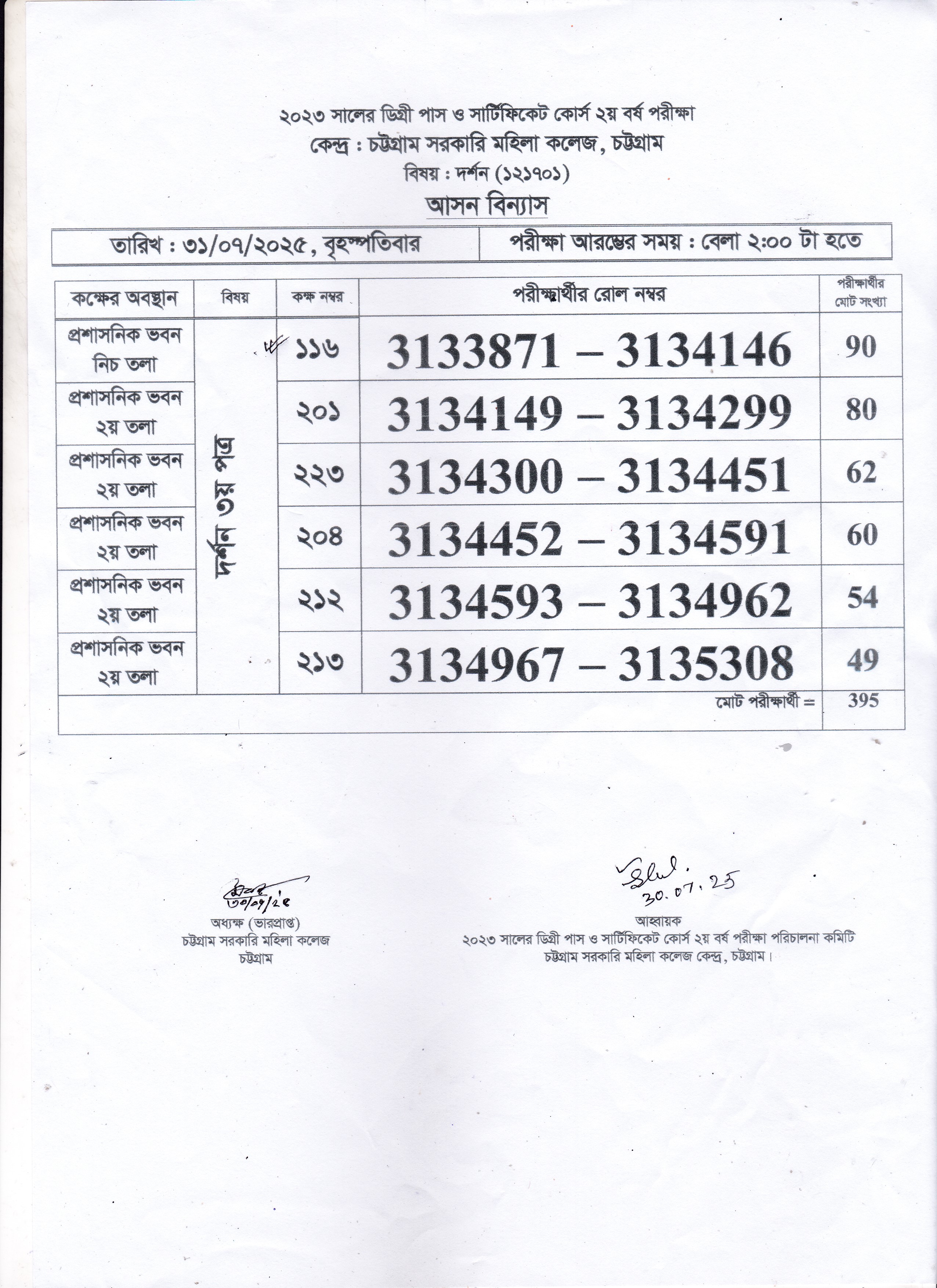 ২০২৩ সালের ডিগ্রি (পাস) ২য় বর্ষ পরীক্ষার আগামী ৩১/০৭/২০২৫ তারিখের পরীক্ষার আসন বিন্যাস