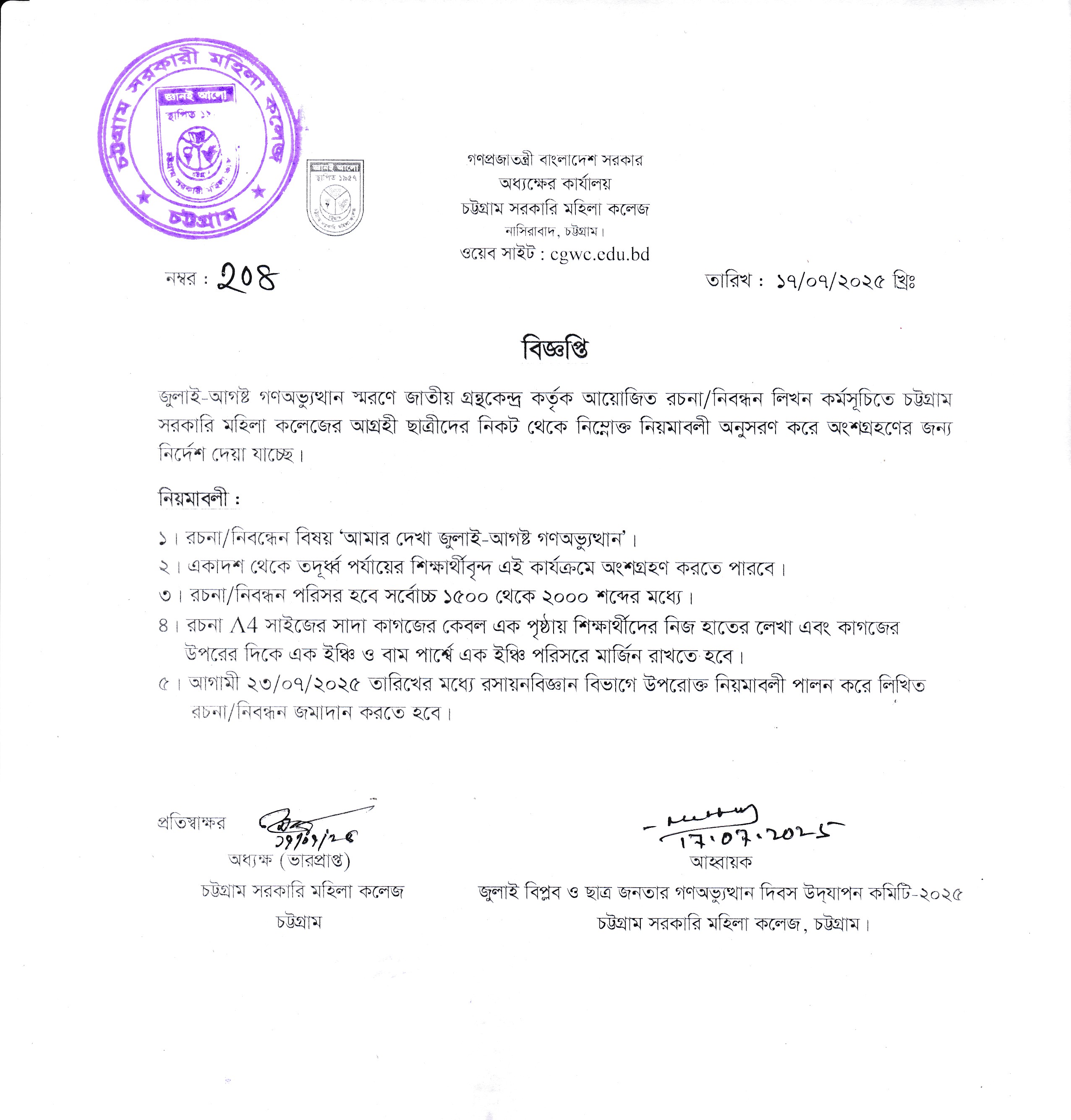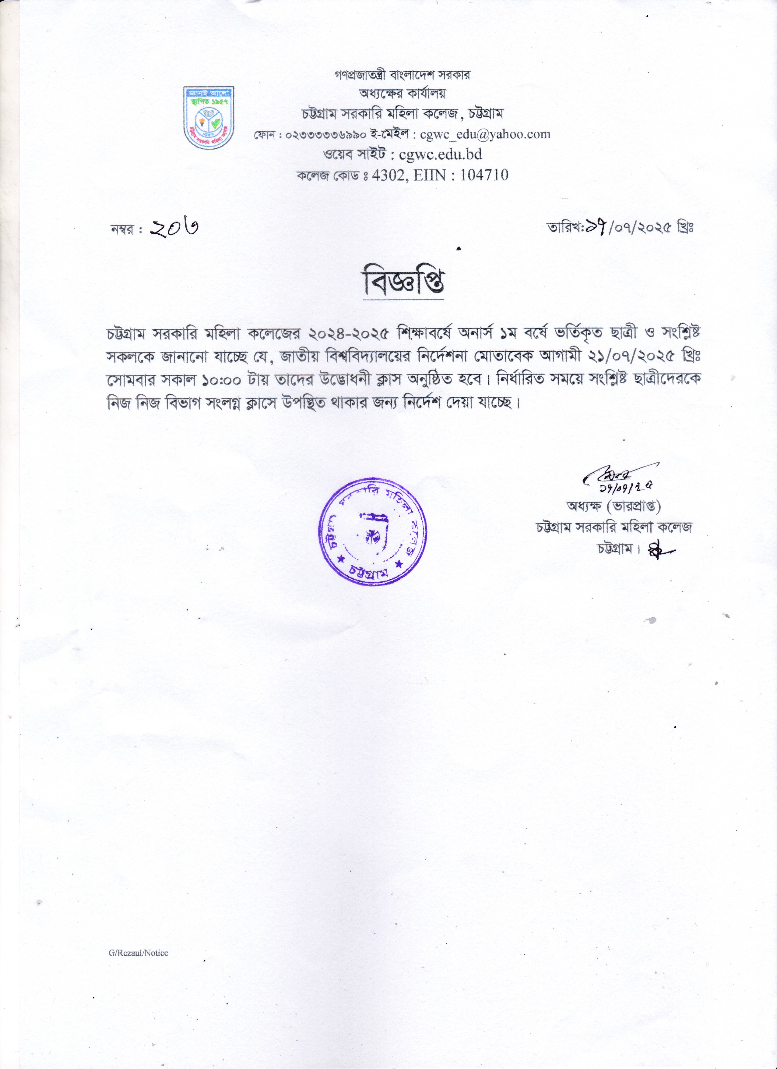 ২০২৪-২০২৫ শিক্ষাবর্ষে অনার্স ১ম বর্ষে ভর্তিকৃত ছাত্রীদের উদ্ভোধনী ক্লাস সংক্রান্ত বিজ্ঞপ্তি (১৭/০৭/২০২৫)