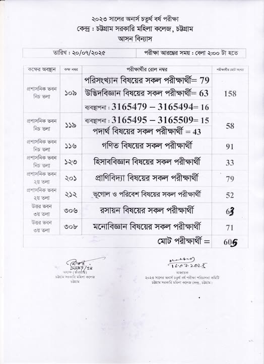 আগামী ২০/০৭/২০২৫ তারিখের ২০২৩ সালের অনার্স ৪র্থ বর্ষ পরীক্ষার আসন বিন্যাস