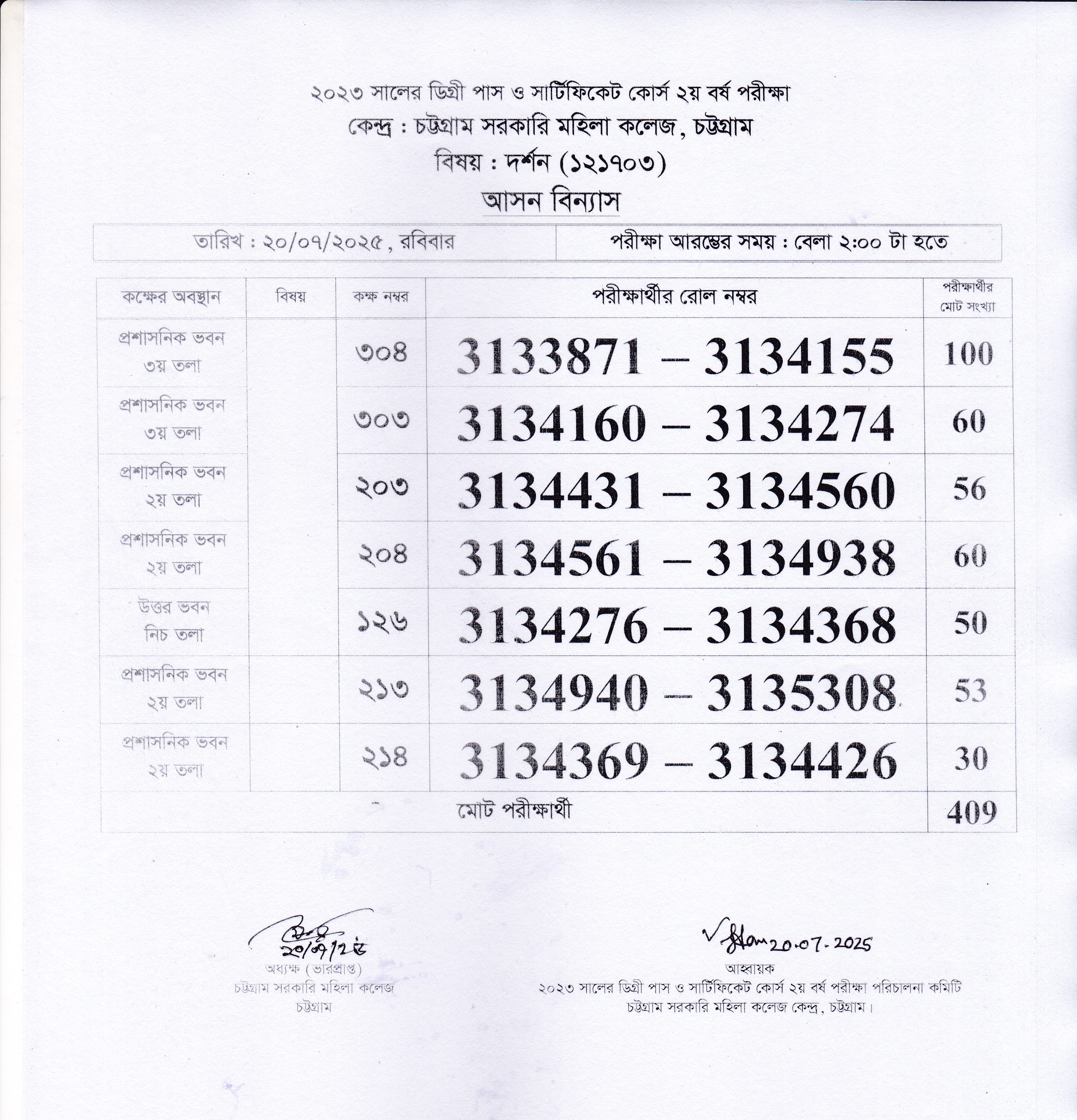 আগামী ২০/০৭/২০২৫ তারিখের ২০২৩ সালের ডিগ্রী পাস ২য় বর্ষ পরীক্ষার আসন বিন্যাস