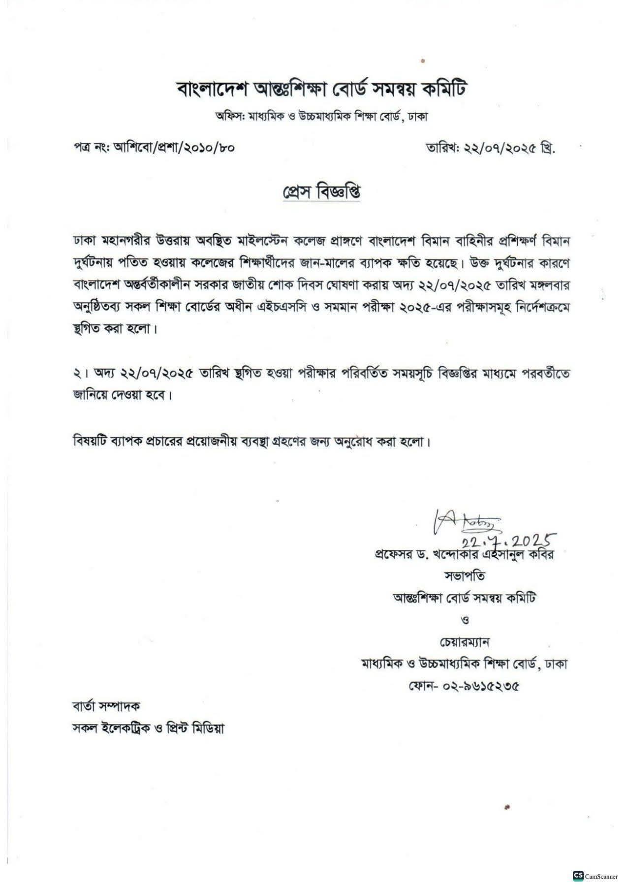 আগামী ২৪/০৭/২০২৫ তারিখের ২০২৫ সালের এইচএসসি পরীক্ষা স্থগিত সংক্রান্ত বিজ্ঞপ্তি