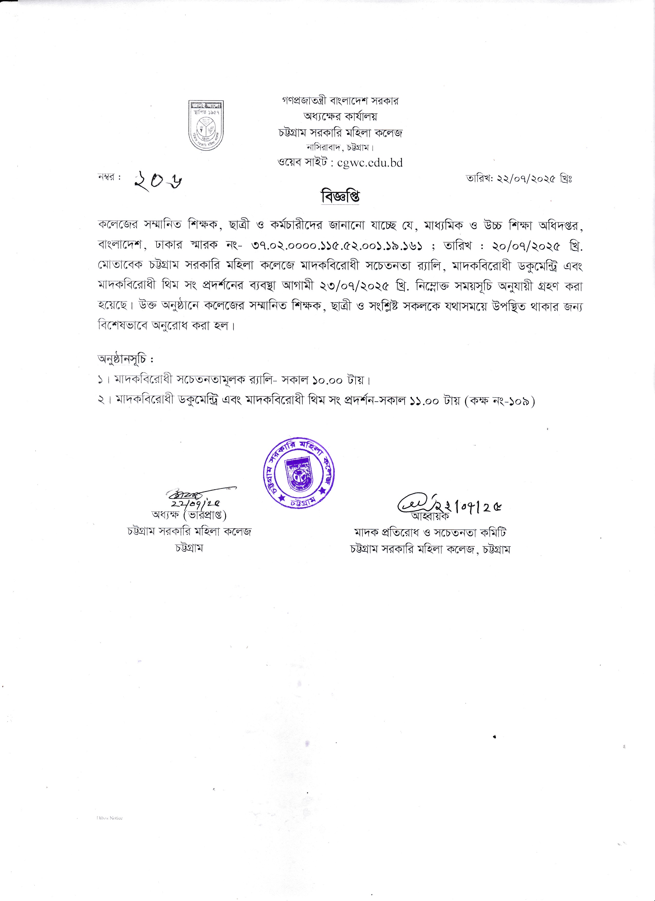 মাদকবিরোধী সচেতনতামূলক অনুষ্ঠান সংক্রান্ত বিজ্ঞপ্তি