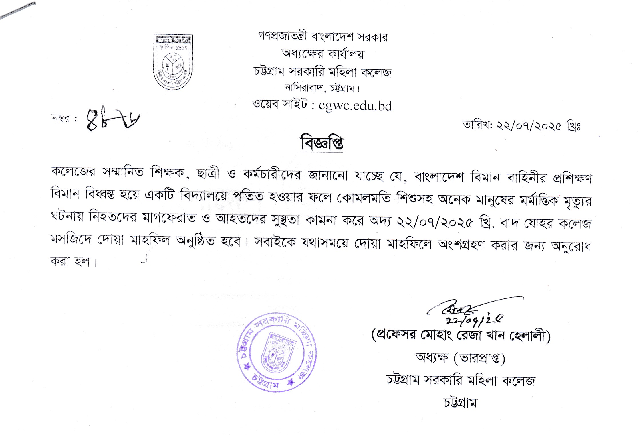 অদ্য ২২/০৭/২০২৫ তারিখ বাদ যোহর কলেজ মসজিদে দোয়া মাহফিল অনুষ্ঠিত হওয়া সংক্রান্ত বিজ্ঞপ্তি
