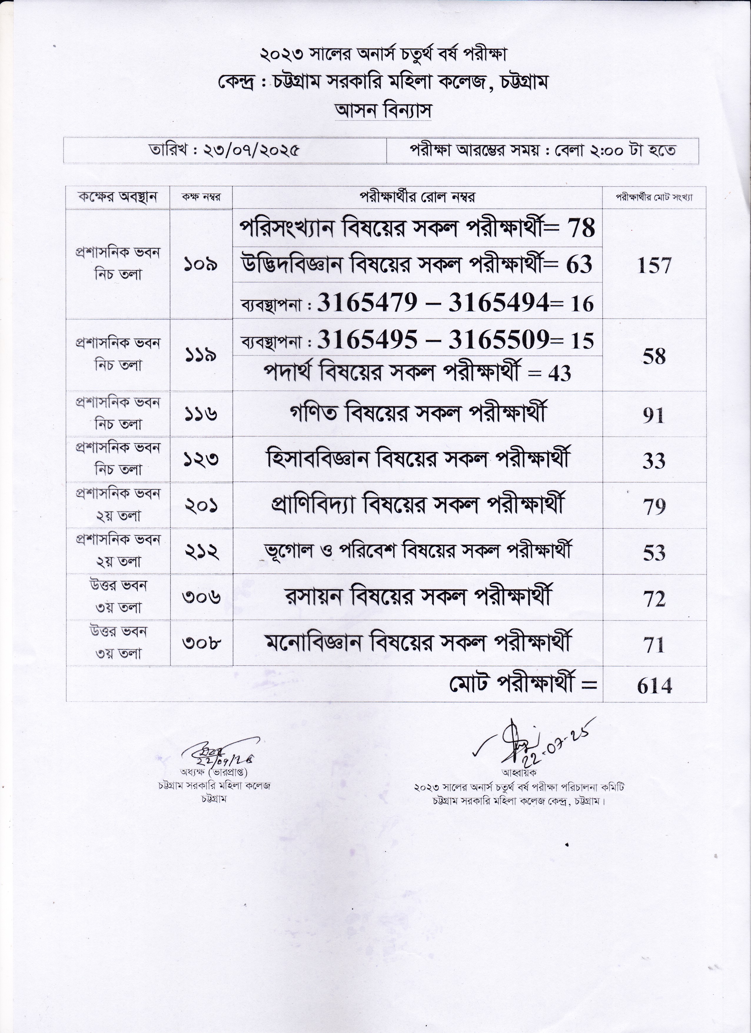 আগামী ২৩/০৭/২০২৫ তারিখের ২০২৩ সালের অনার্স ৪র্থ বর্ষ পরীক্ষার আসন বিন্যাস