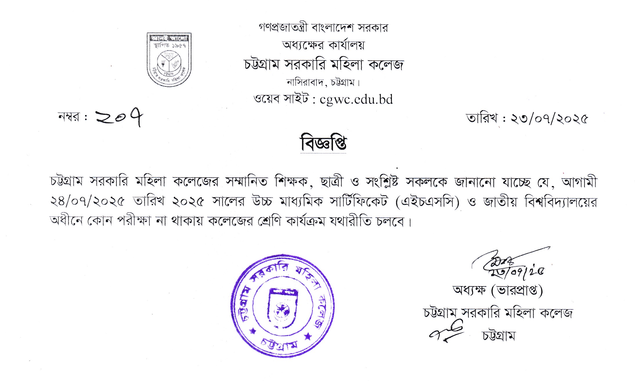 আগামী ২৪/০৭/২০২৫ তারিখ কলেজের সকল শ্রেণি কার্যক্রম চালু হওয়া প্রসঙ্গে।