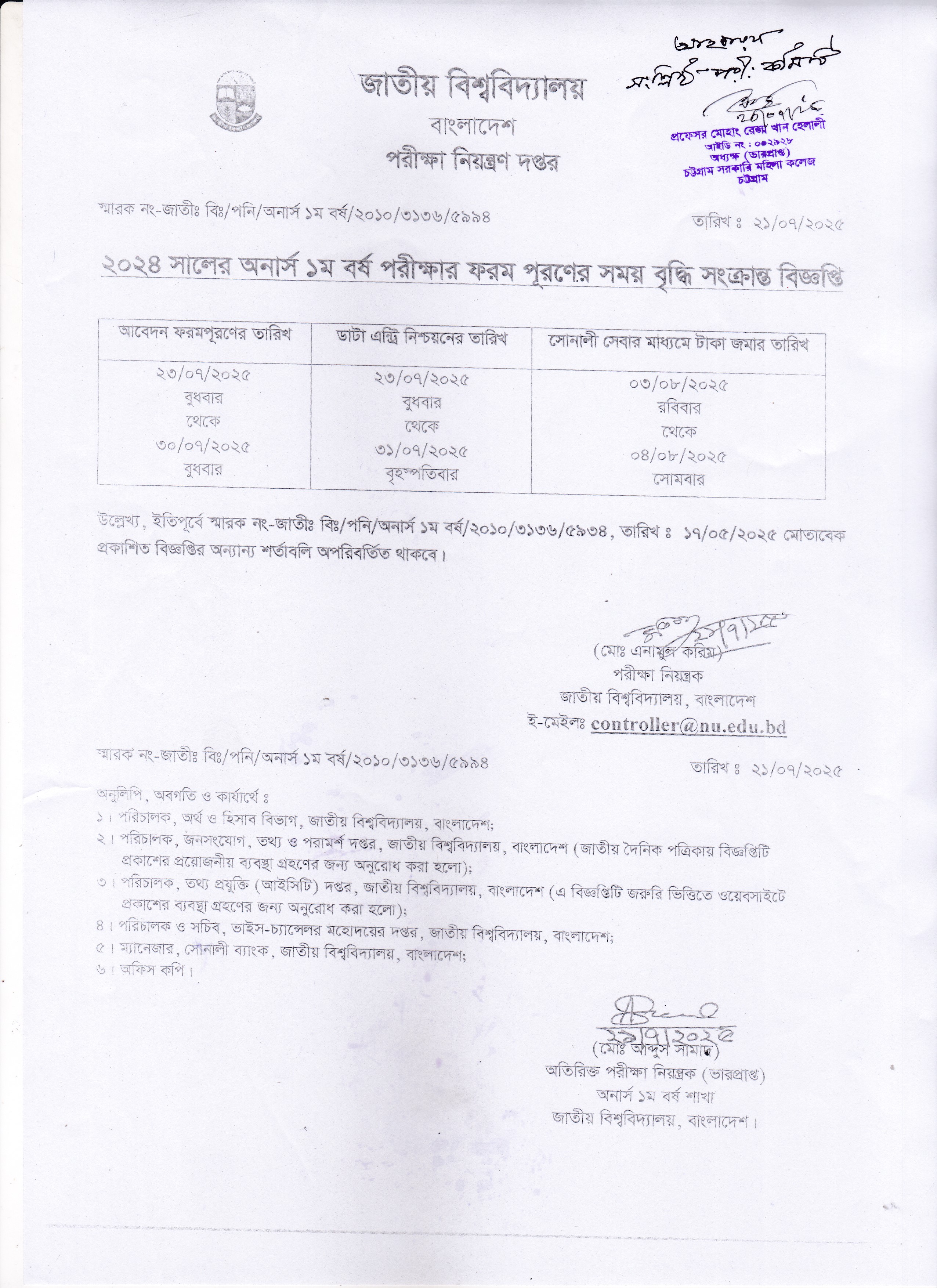২০২৪ সালের অনার্স ১ম বর্ষ পরীক্ষার ফরম পূরণের সময় বৃদ্ধি সংক্রান্ত বিজ্ঞপ্তি