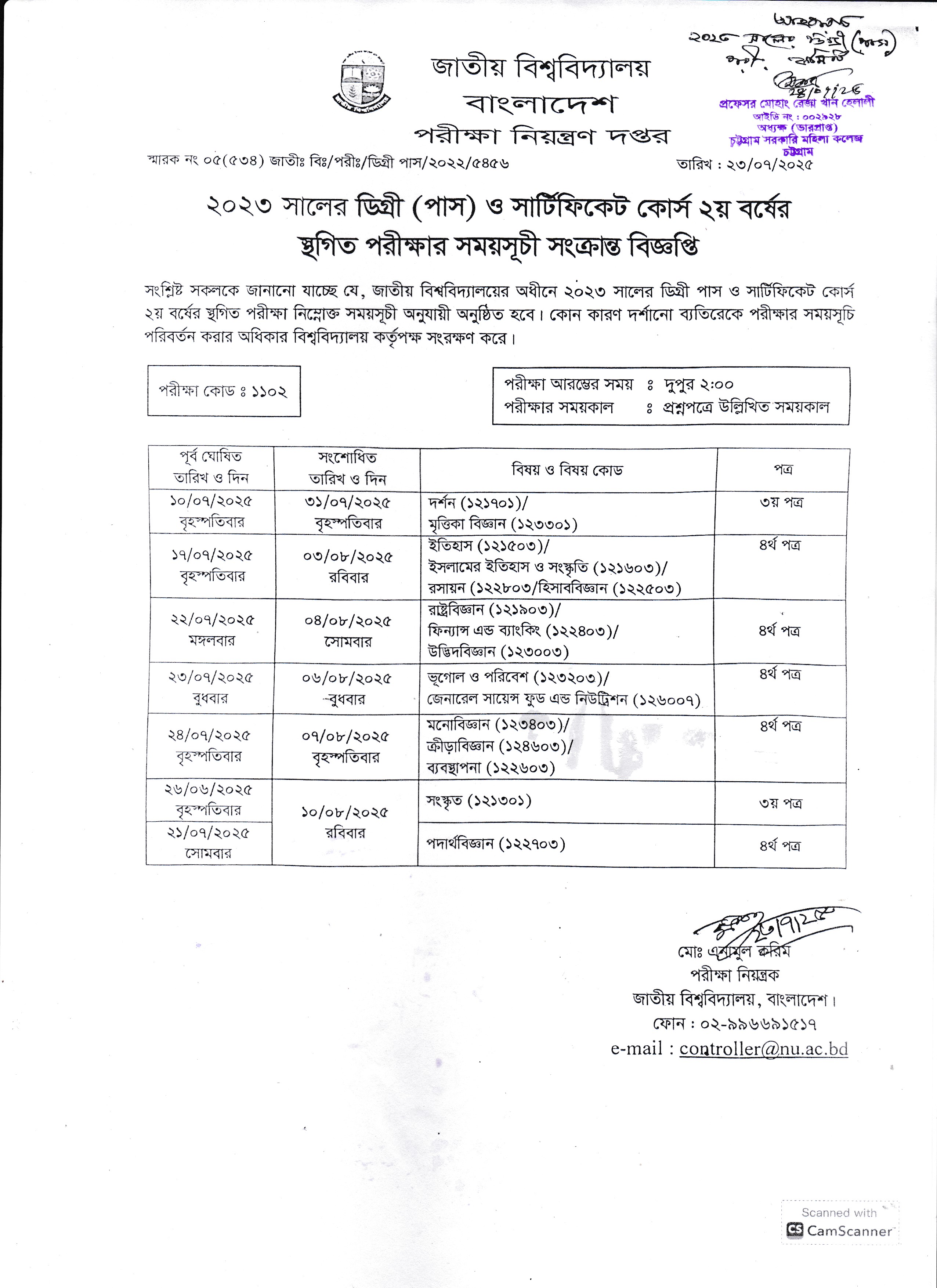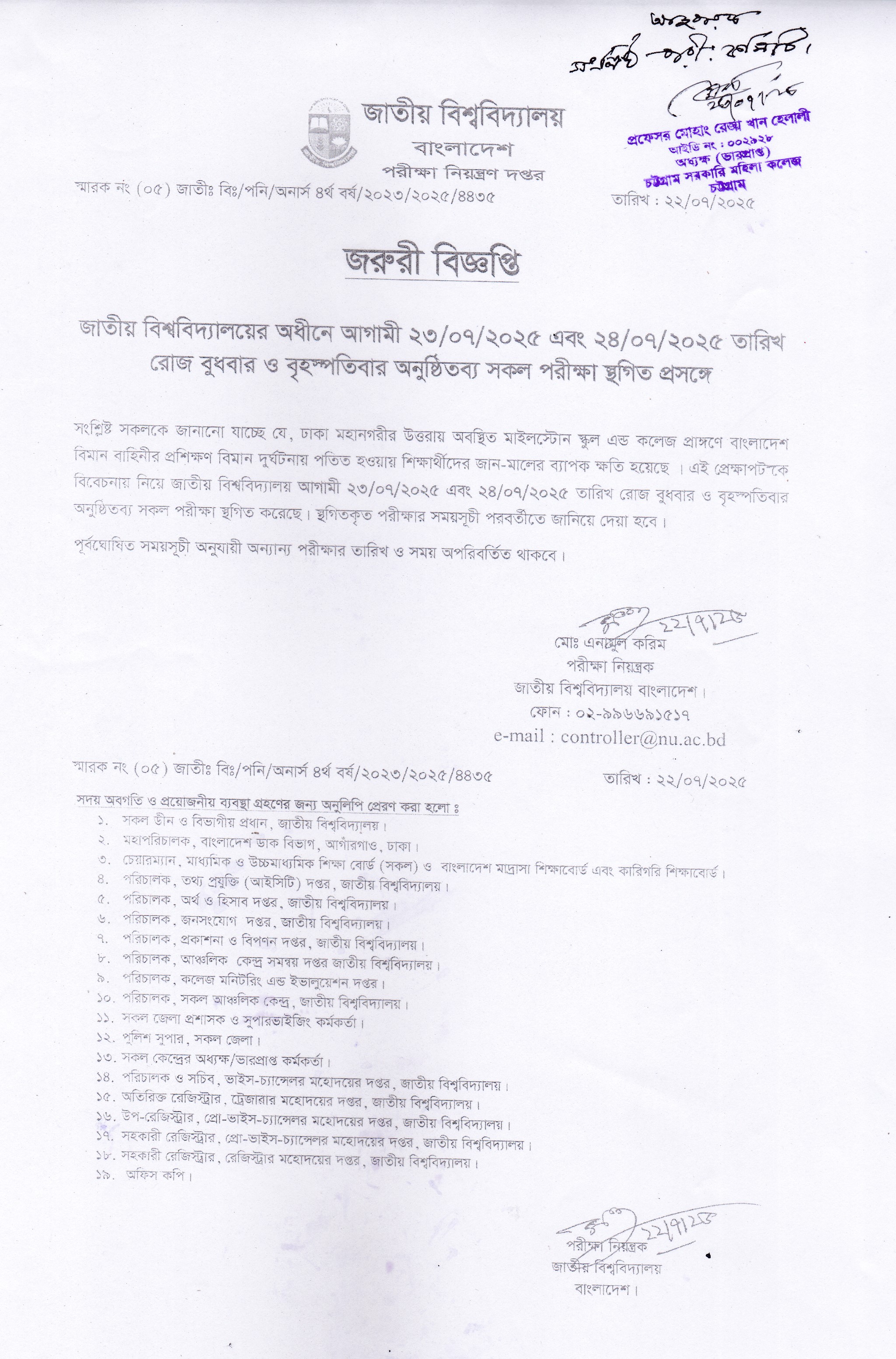 জাতীয় বিশ্ববিদ্যালয়ের অধীনে ২৩/০৭/২০২৫ ও ২৪/০৭/২০২৫ তারিখের সকল পরীক্ষা স্থগিত সংক্রান্ত বিজ্ঞপ্তি