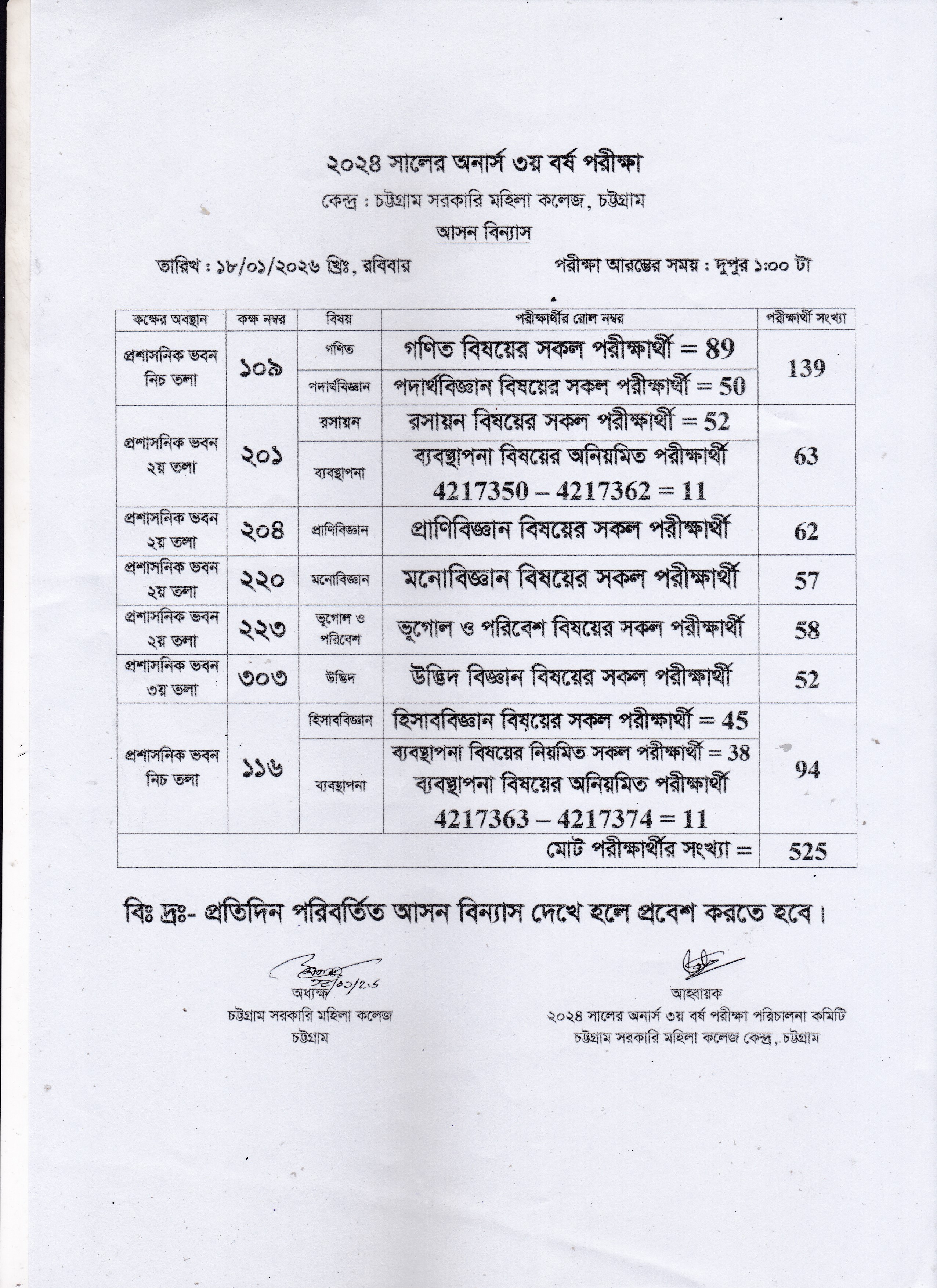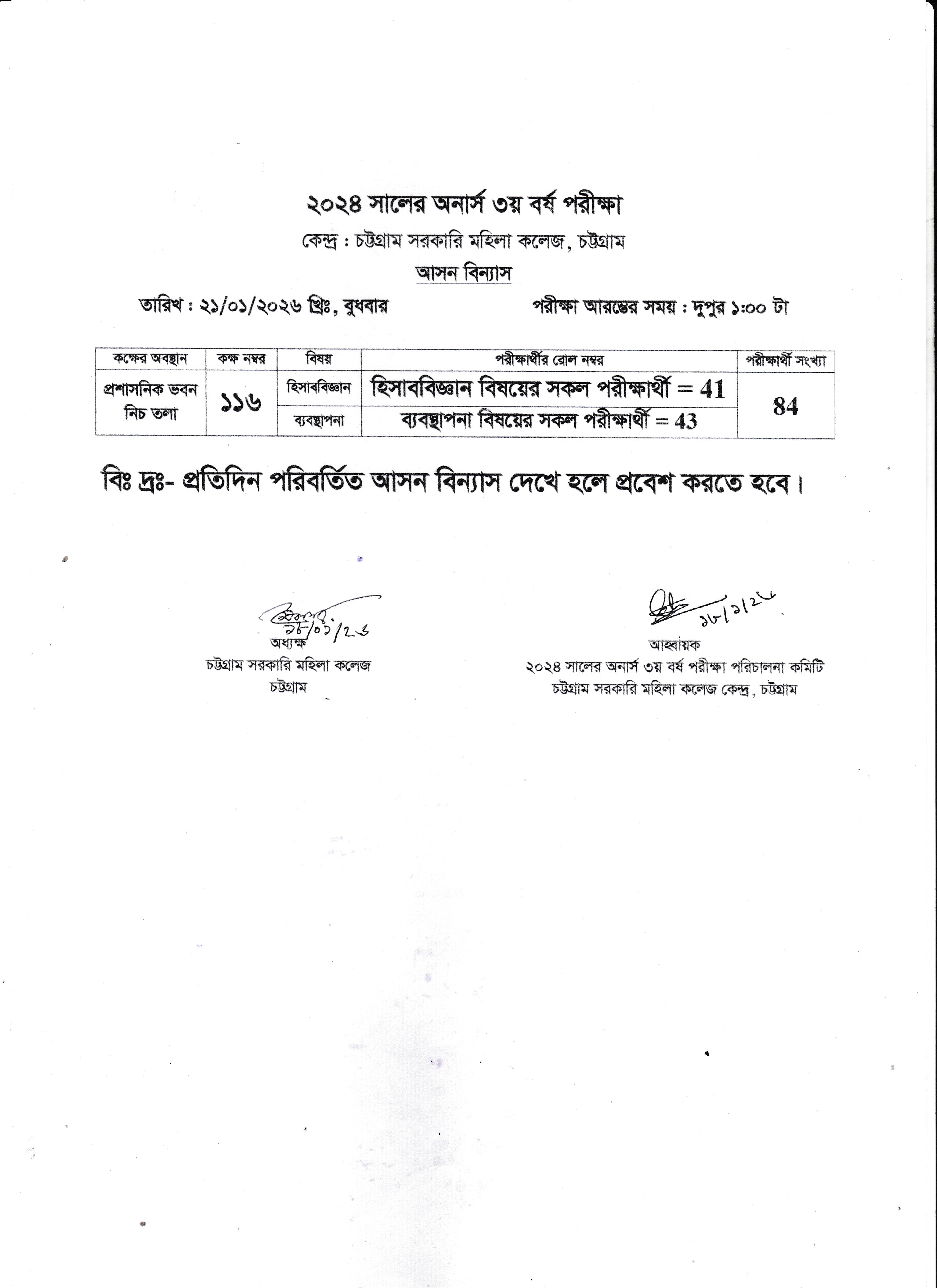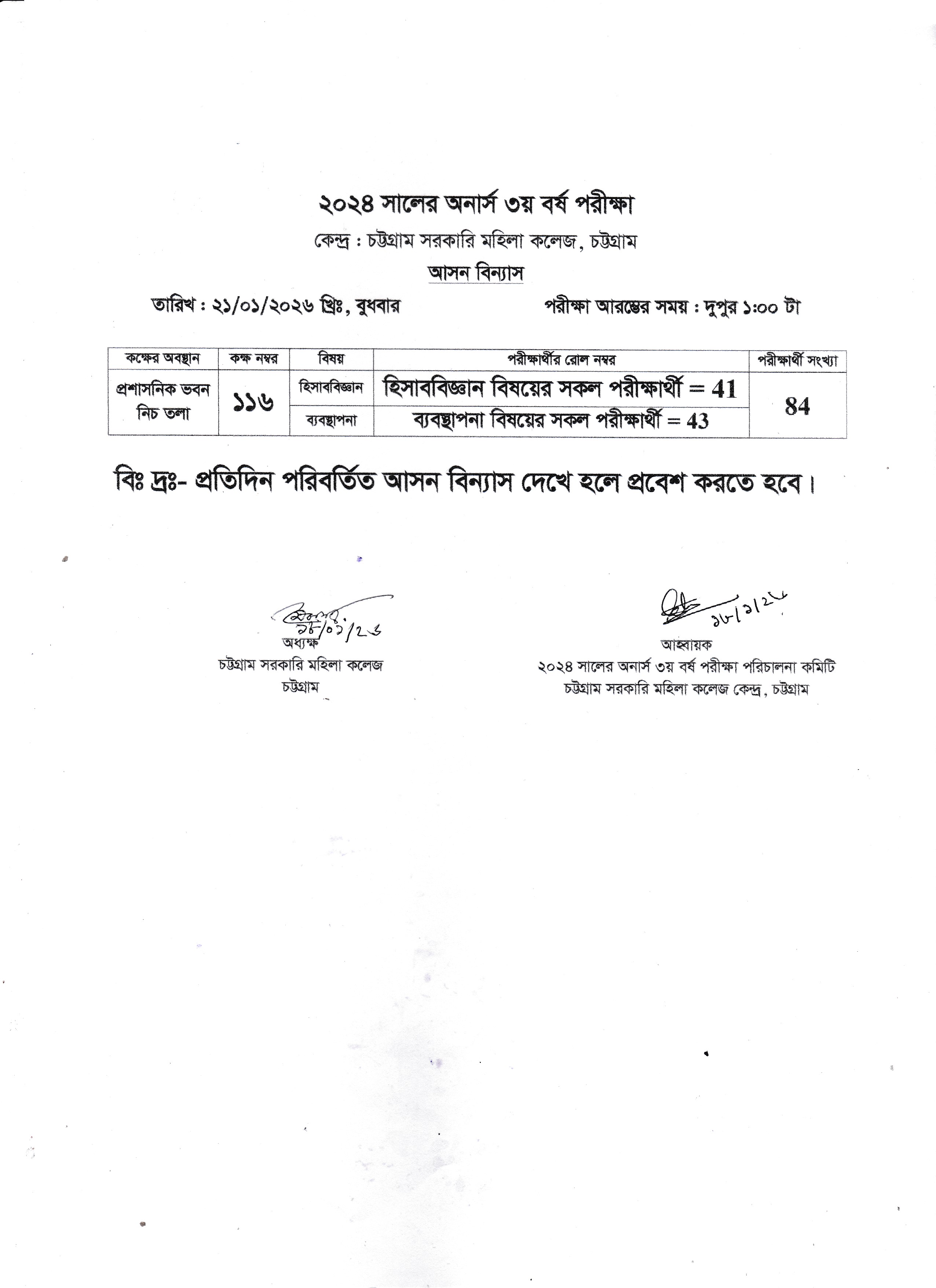 ২০২৪ সালের অনার্স ৩য় বর্ষ পরীক্ষার আগামী ২১/০১/২০২৬ তারিখের আসন বিন্যাস।