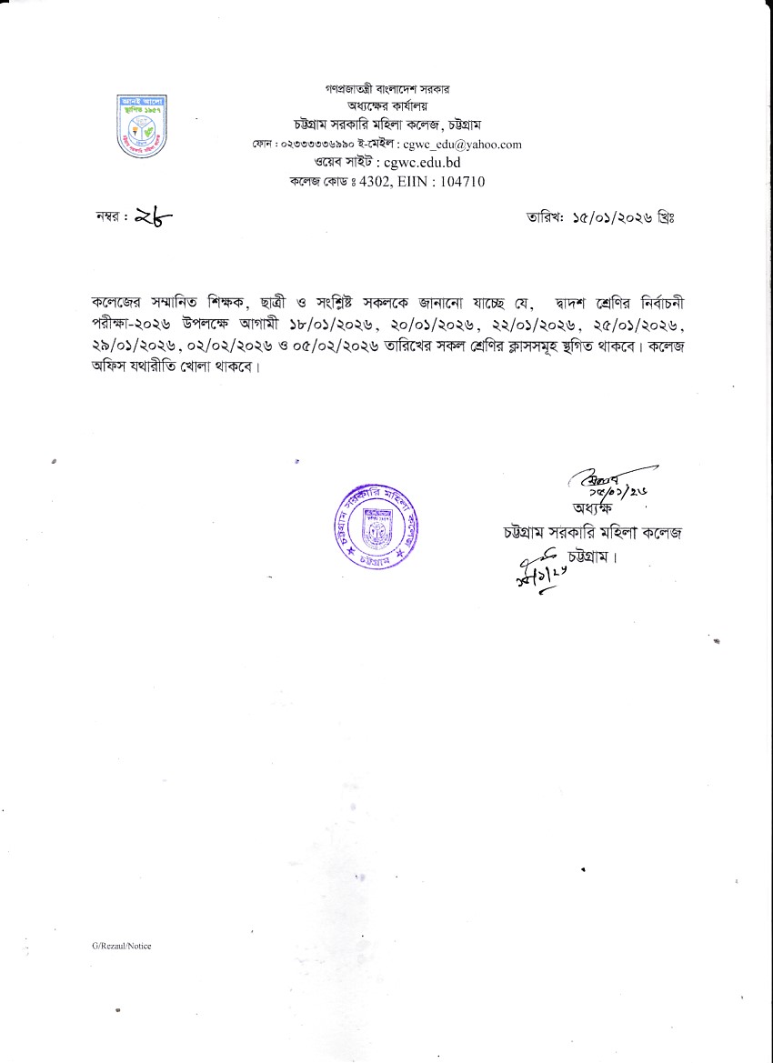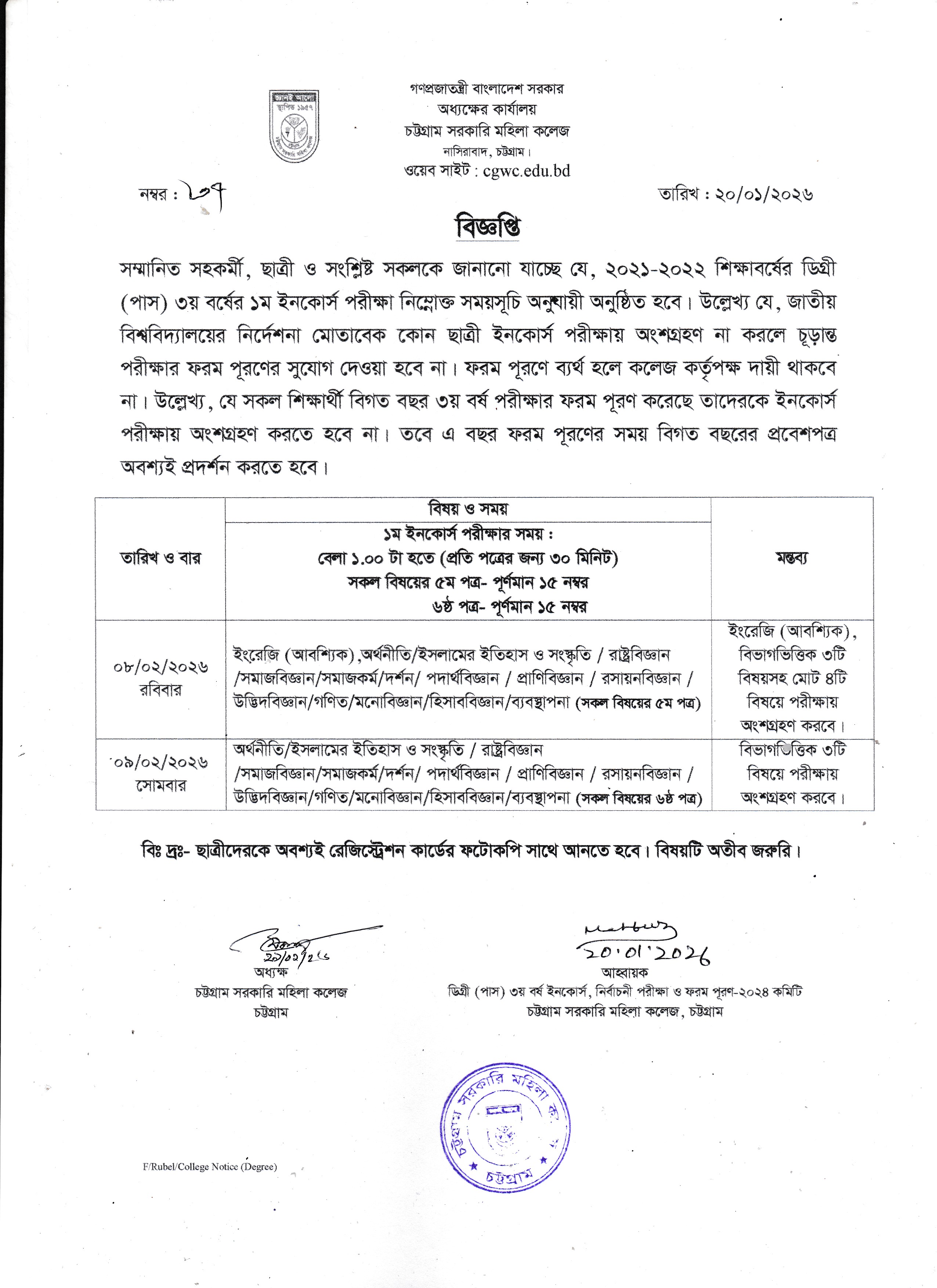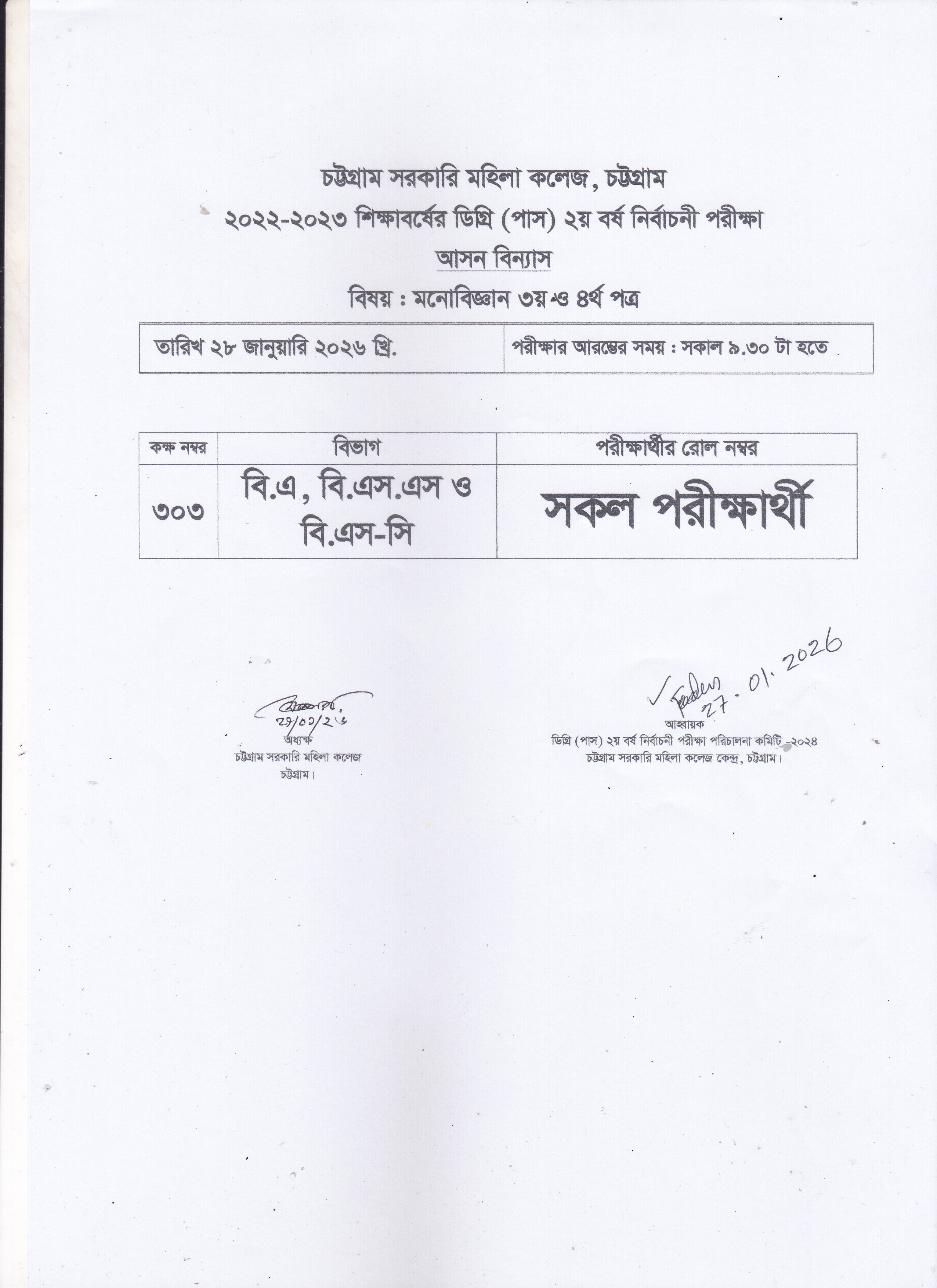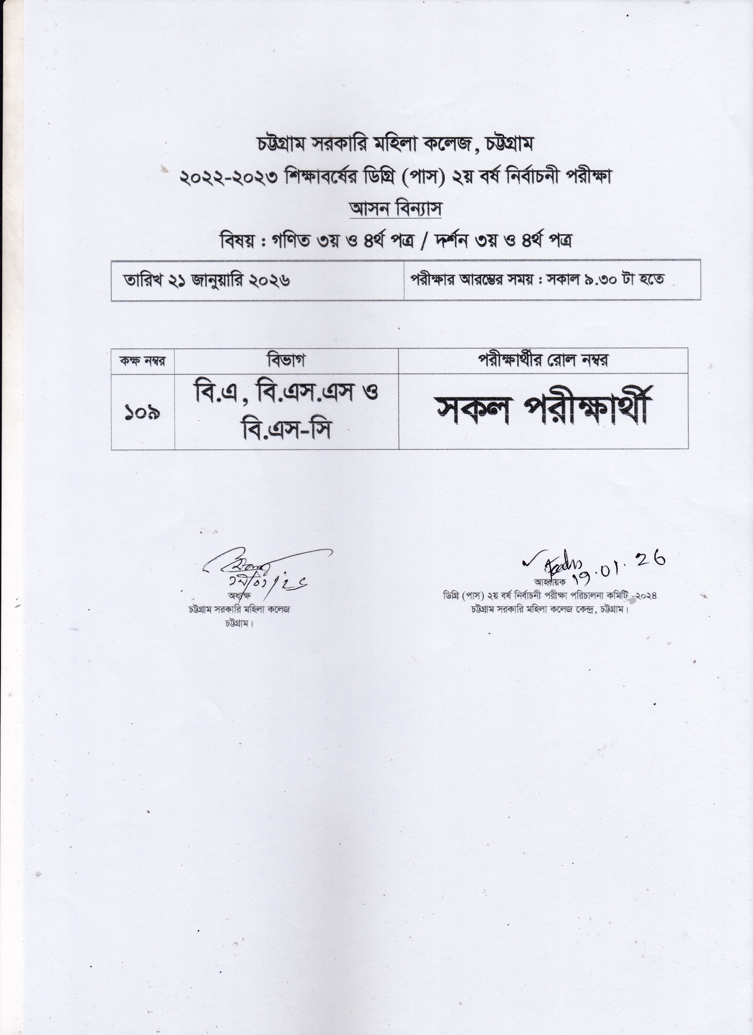 ডিগ্রি (পাস) ২য় বর্ষের নির্বাচনী পরীক্ষার আগামী ২১/০১/২০২৬ তারিখের আসন বিন্যাস।