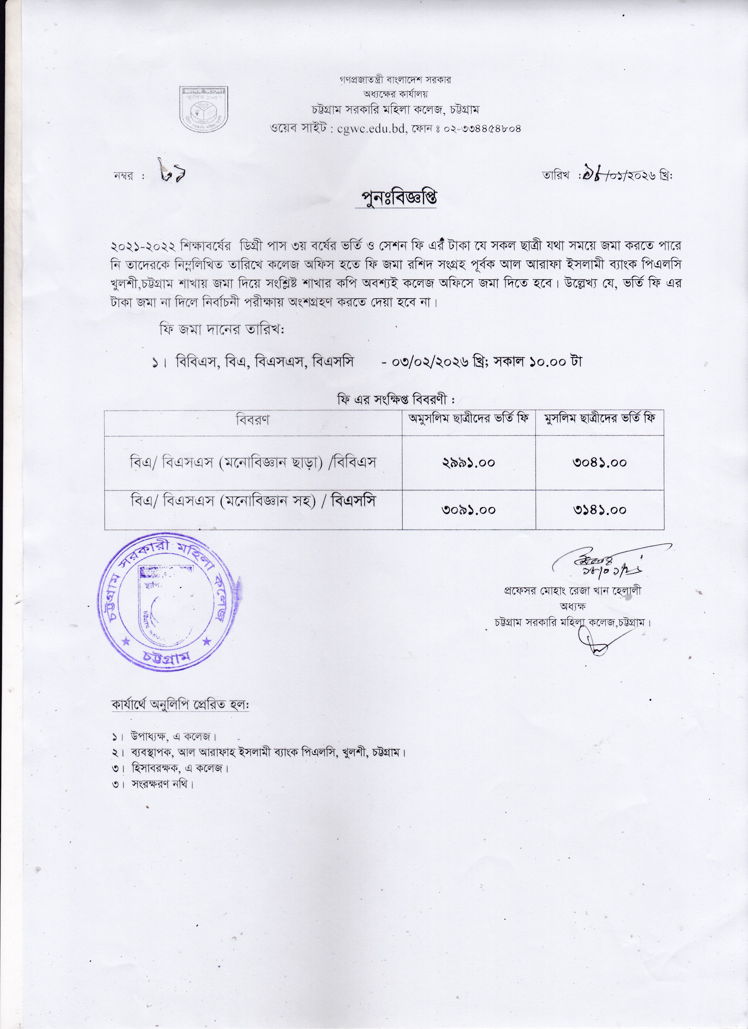 ২০২১-২০২২ শিক্ষাবর্ষে ডিগ্রি (পাস) ৩য় বর্ষের ছাত্রীদের ভর্তি ও সেশন ফি জমাদান সংক্রান্ত বিজ্ঞপ্তি।