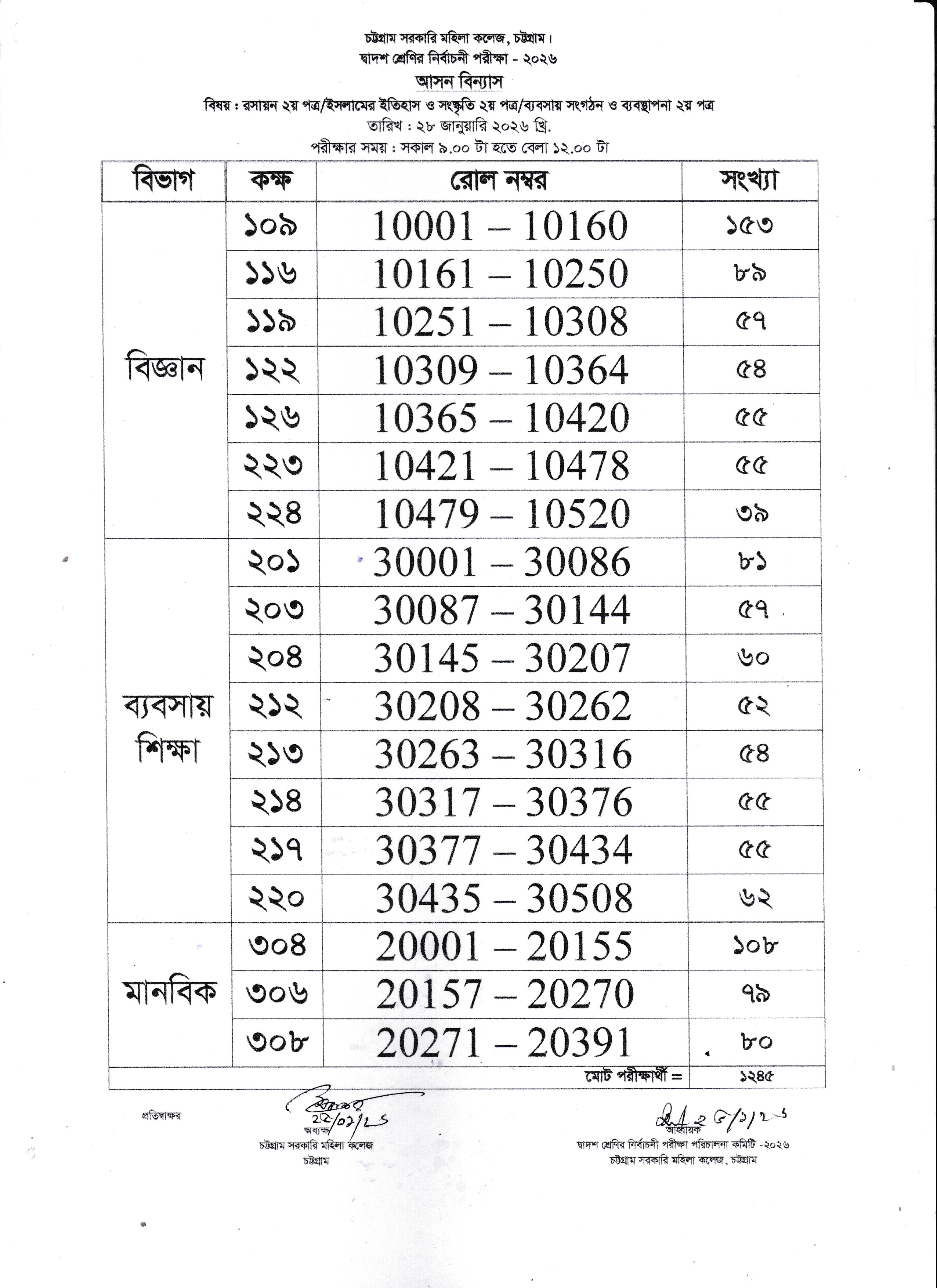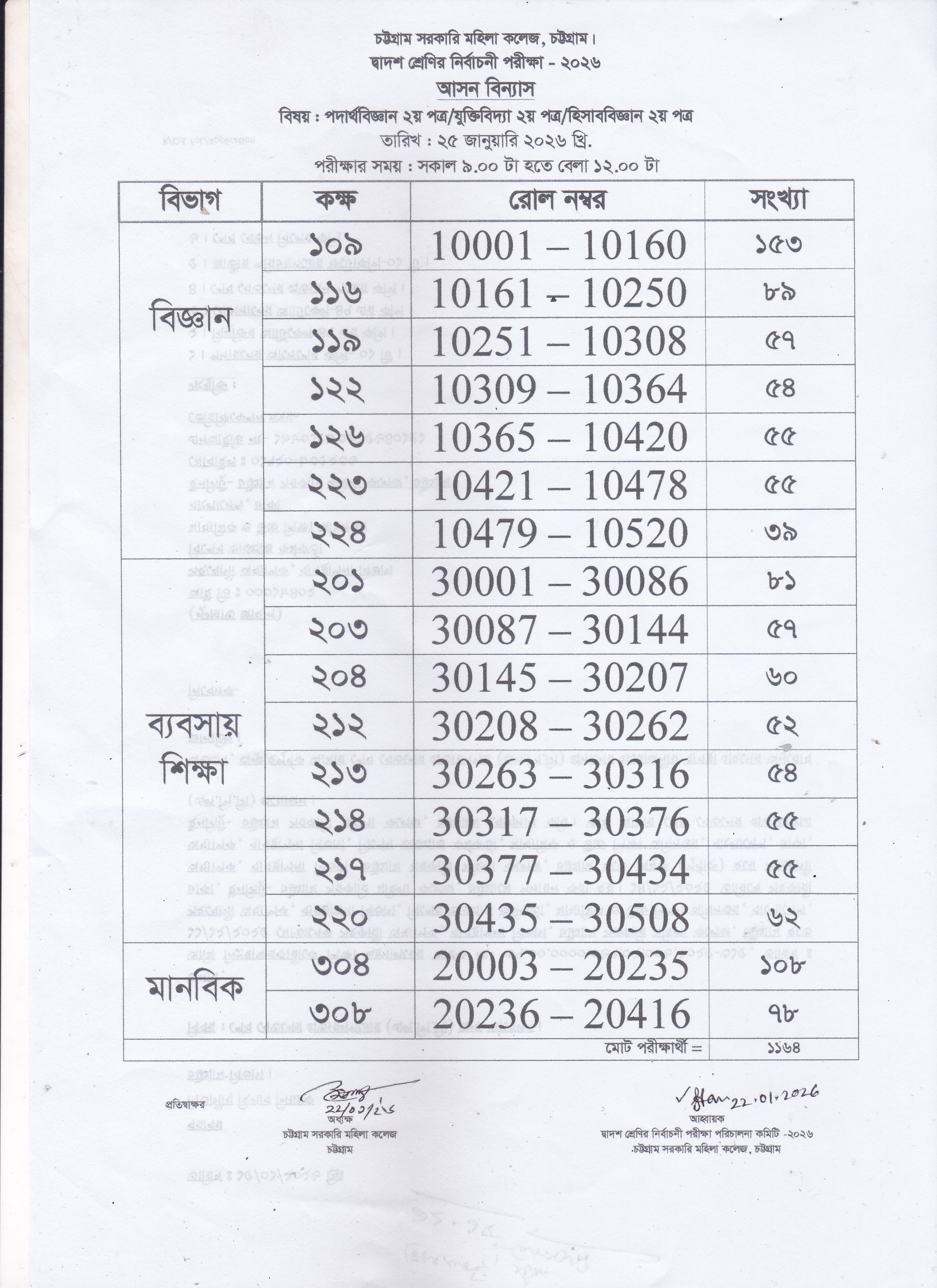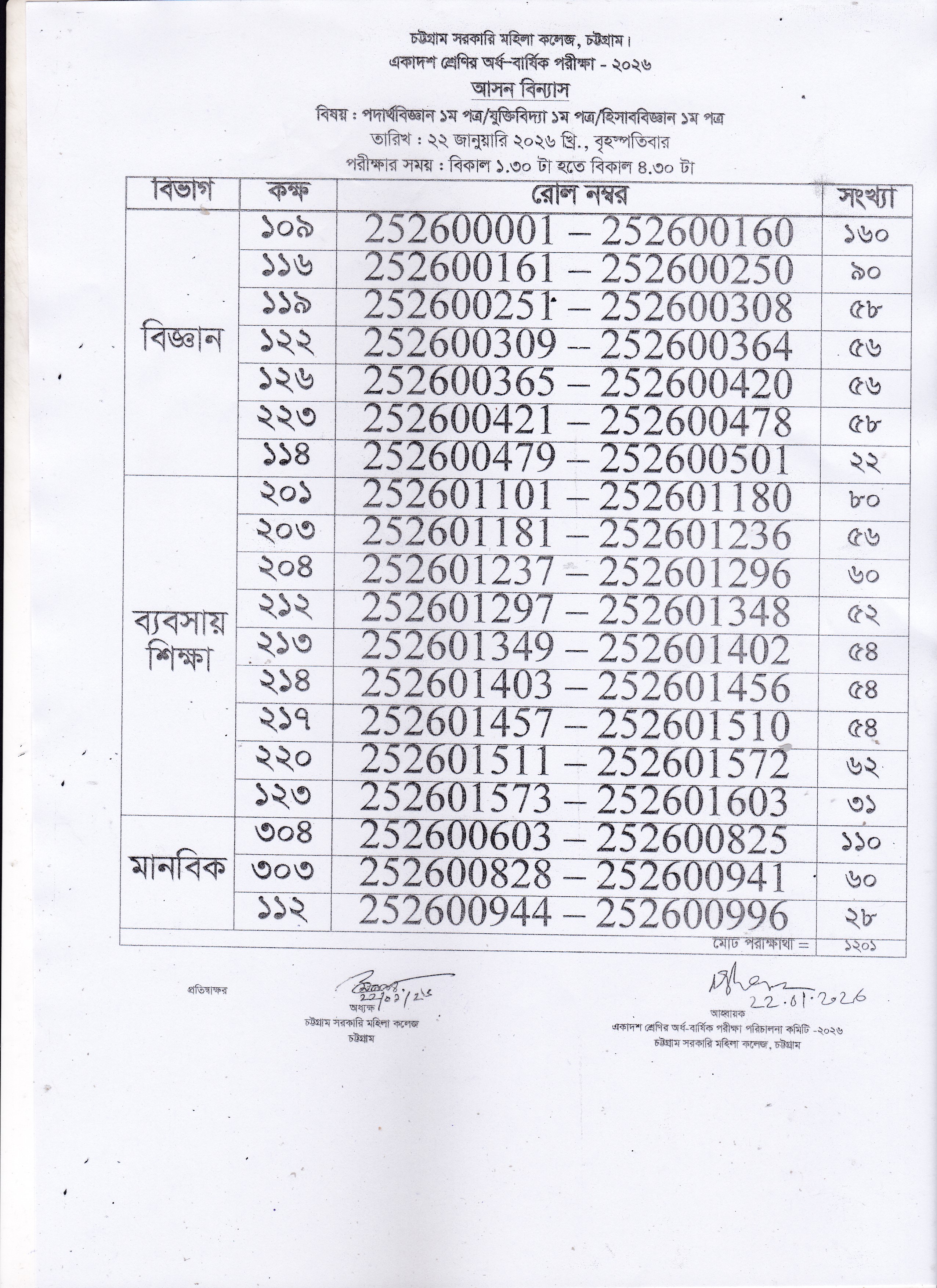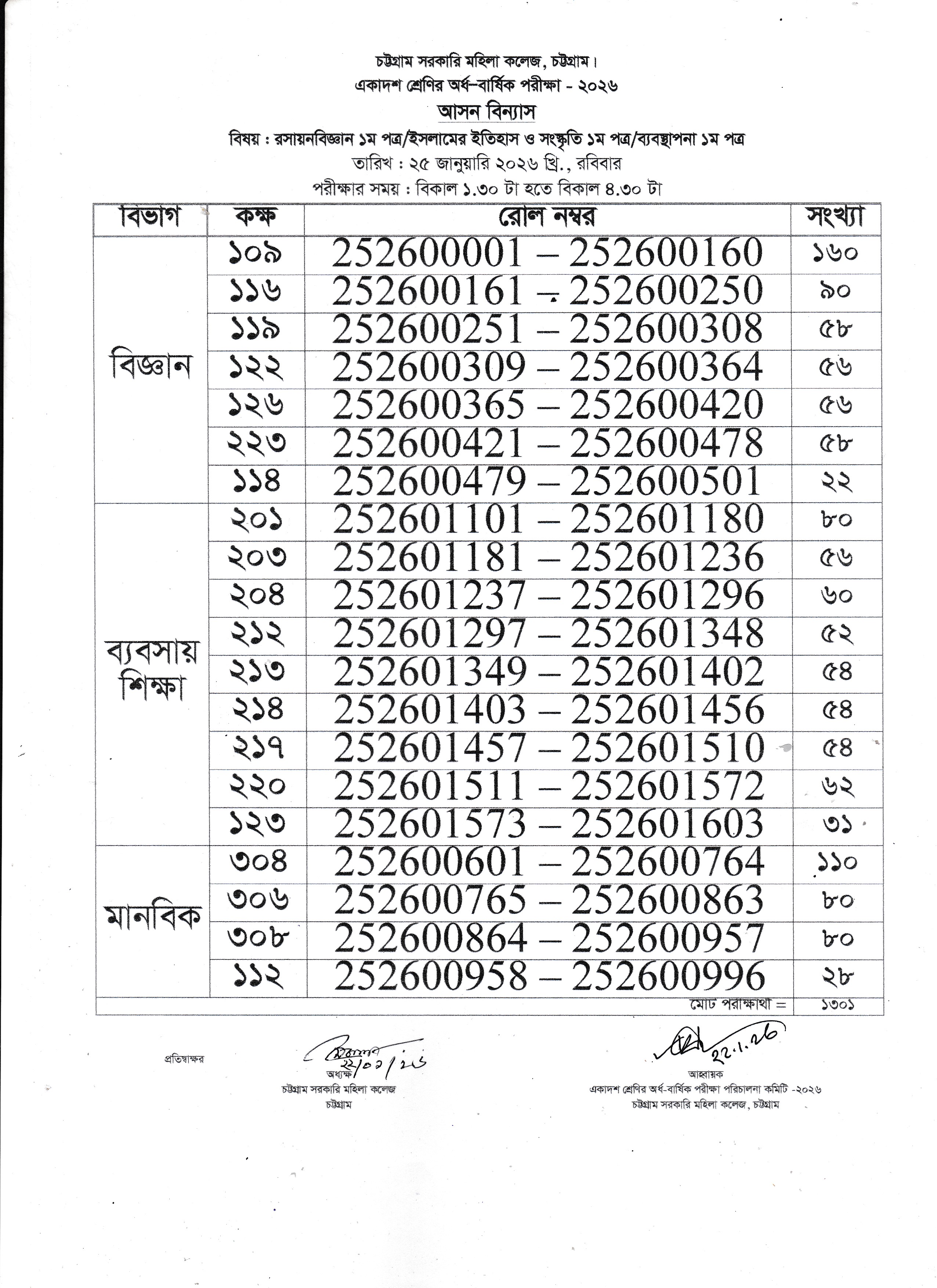 একাদশ শ্রেণির অর্ধ-বার্ষিক পরীক্ষার ২২/০১/২০২৬ তারিখের আসন বিন্যাস