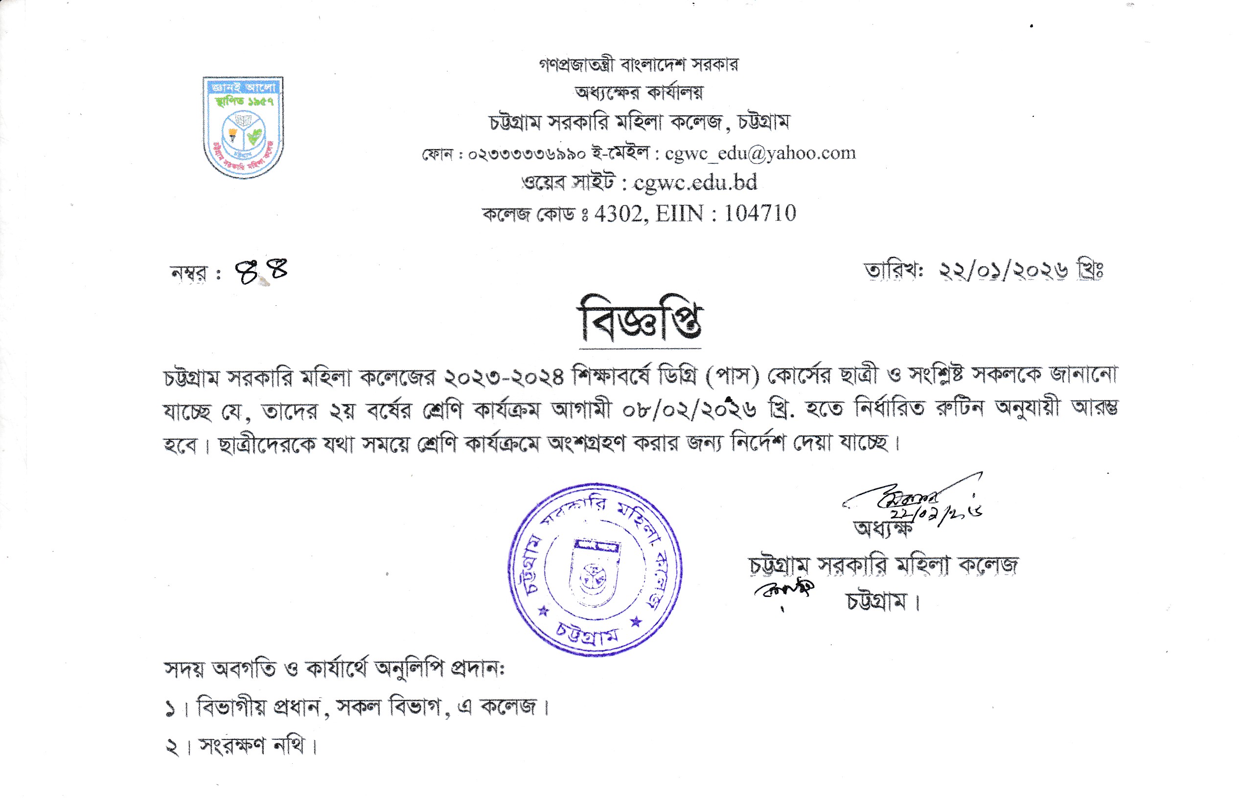 ডিগ্রি (পাস) ২য় বর্ষের শ্রেণি কার্যক্রম আরম্ভ সংক্রান্ত বিজ্ঞপ্তি।
