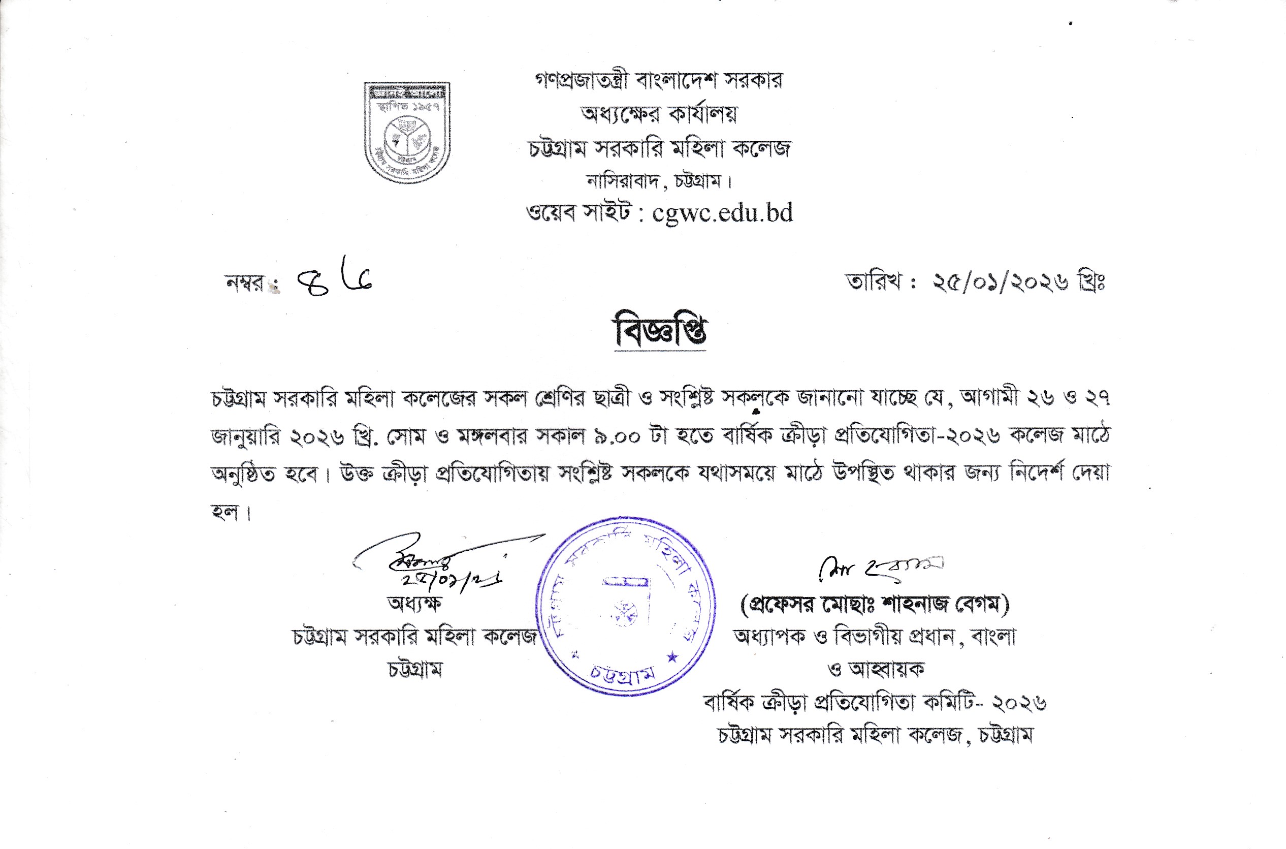 বার্ষিক ক্রীড়া প্রতিযোগিতা-২০২৬ সংক্রান্ত বিজ্ঞপ্তি