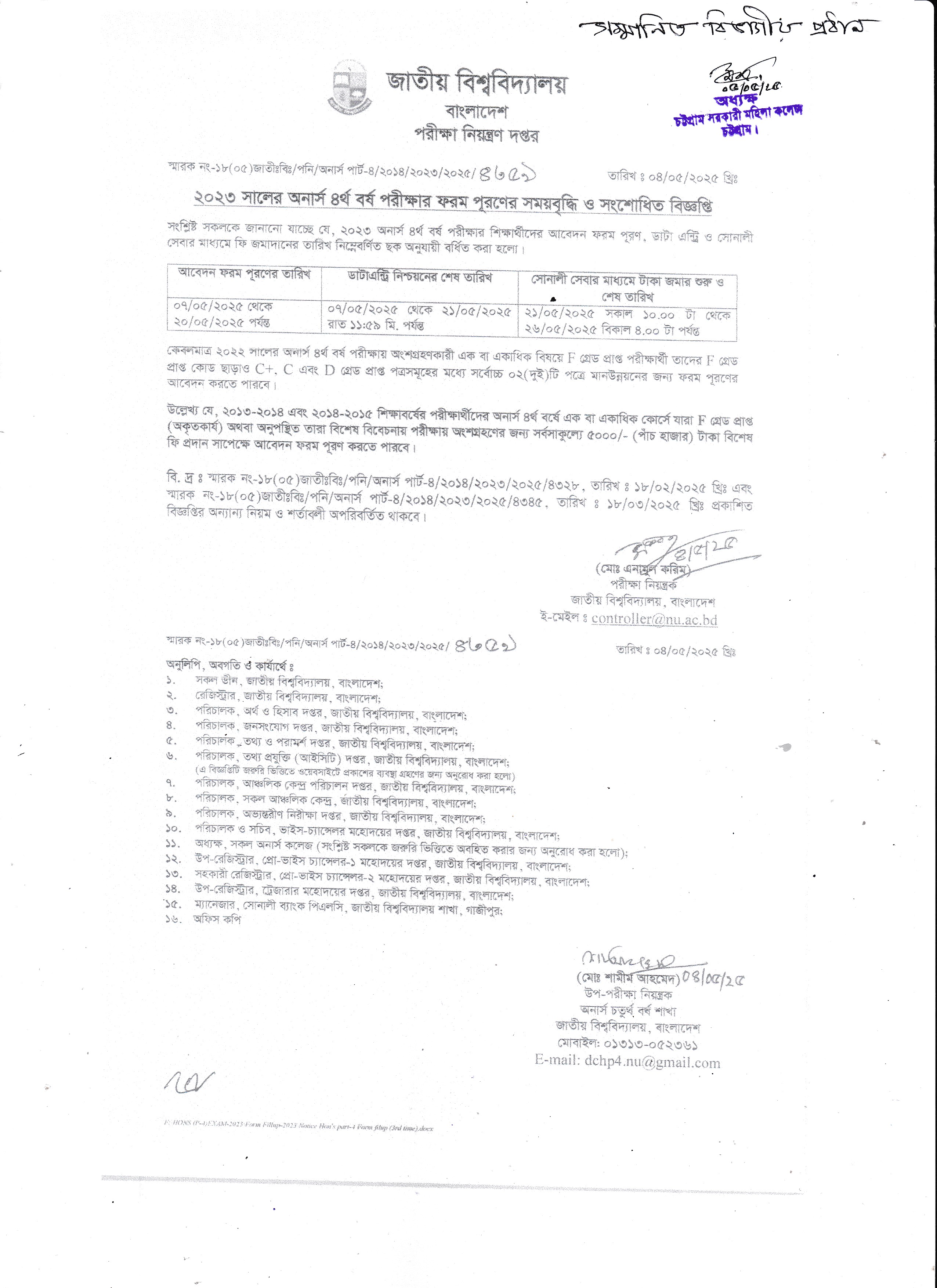 ২০২৩ সালের অনার্স ৪র্থ বর্ষের ফরম পূরণের সময় বৃদ্ধি সংক্রান্ত বিজ্ঞপ্তি