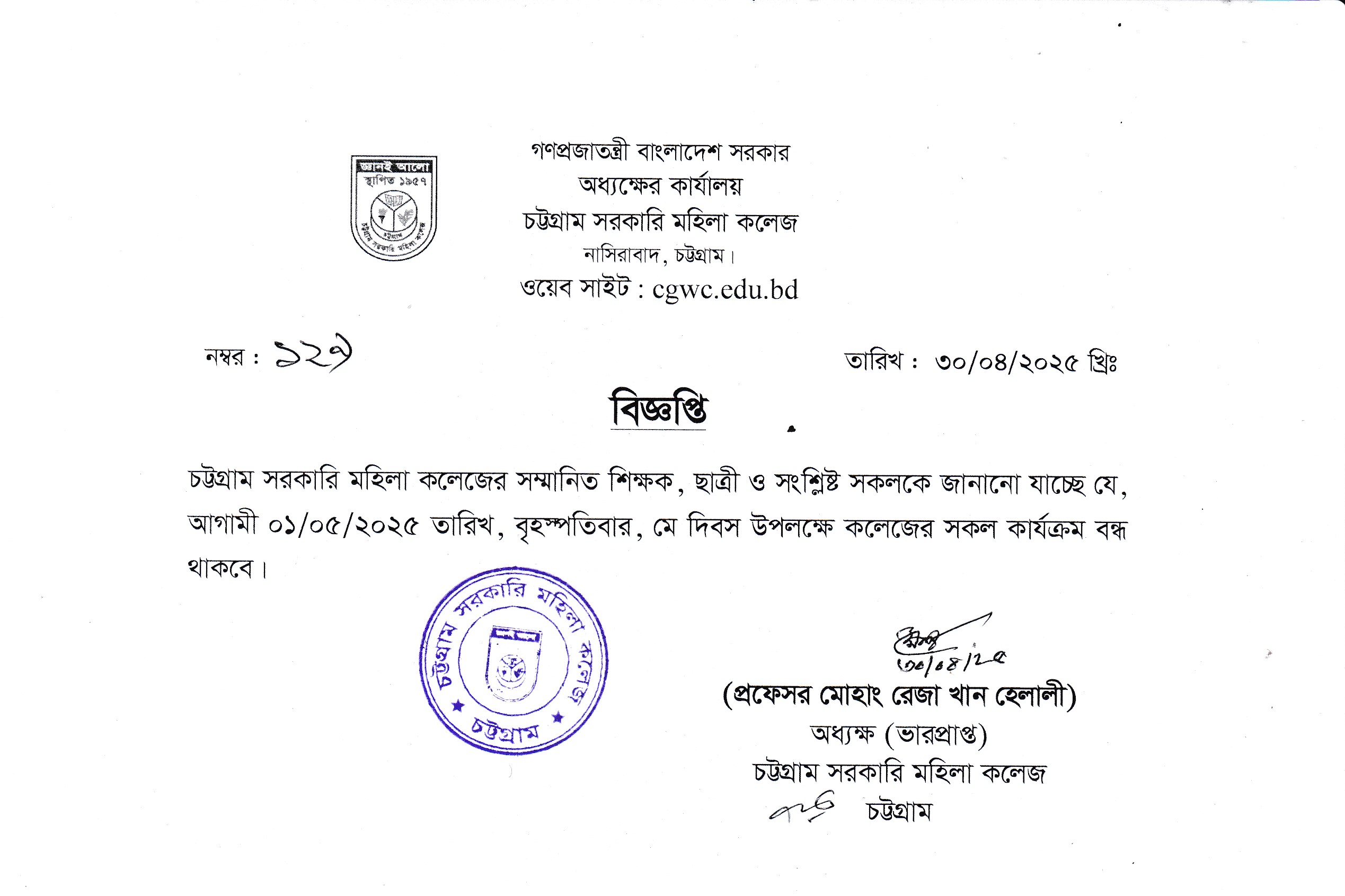 কলেজ বন্ধের বিজ্ঞপ্তি (৩০/০৪/২০২৫)