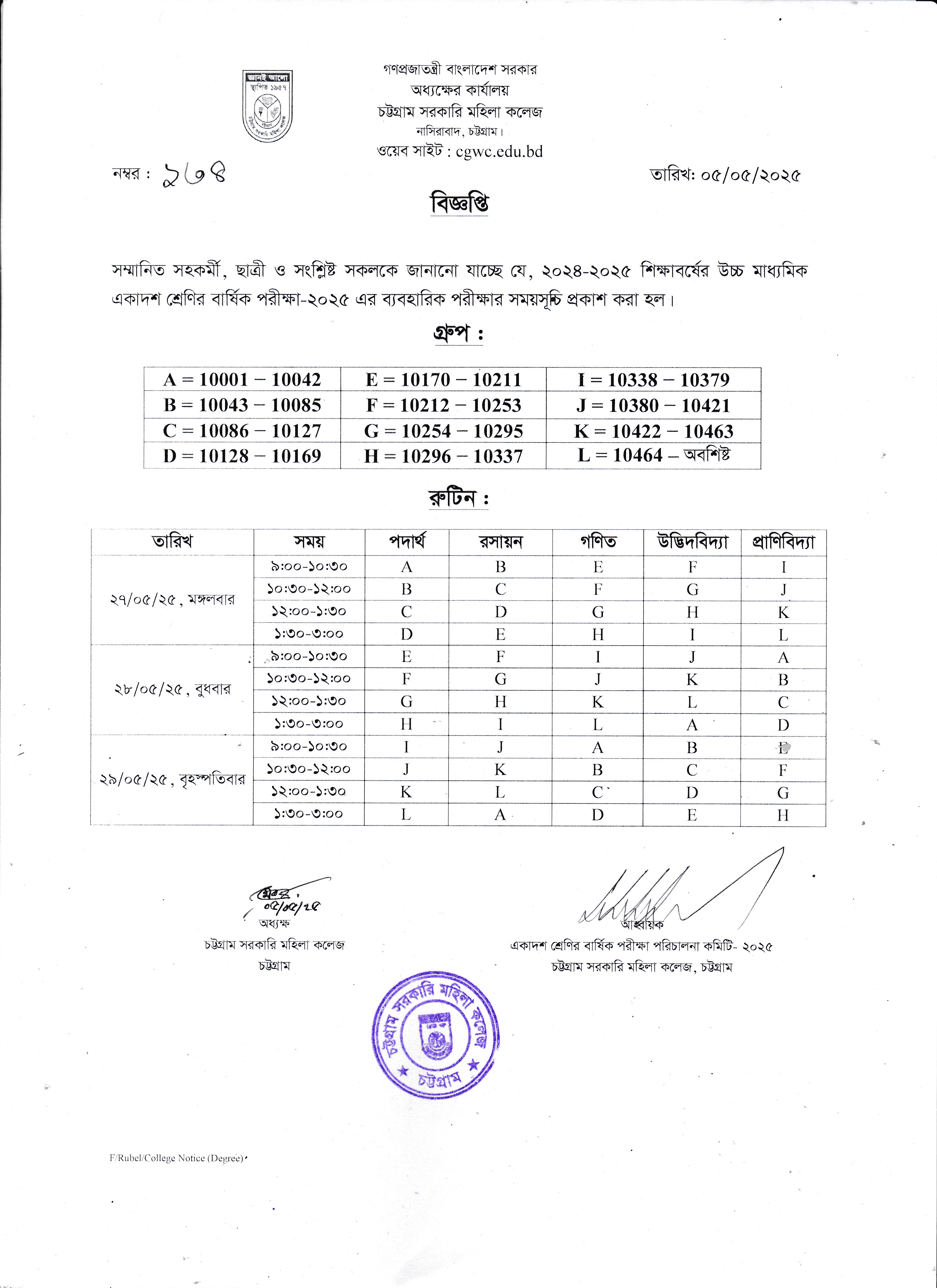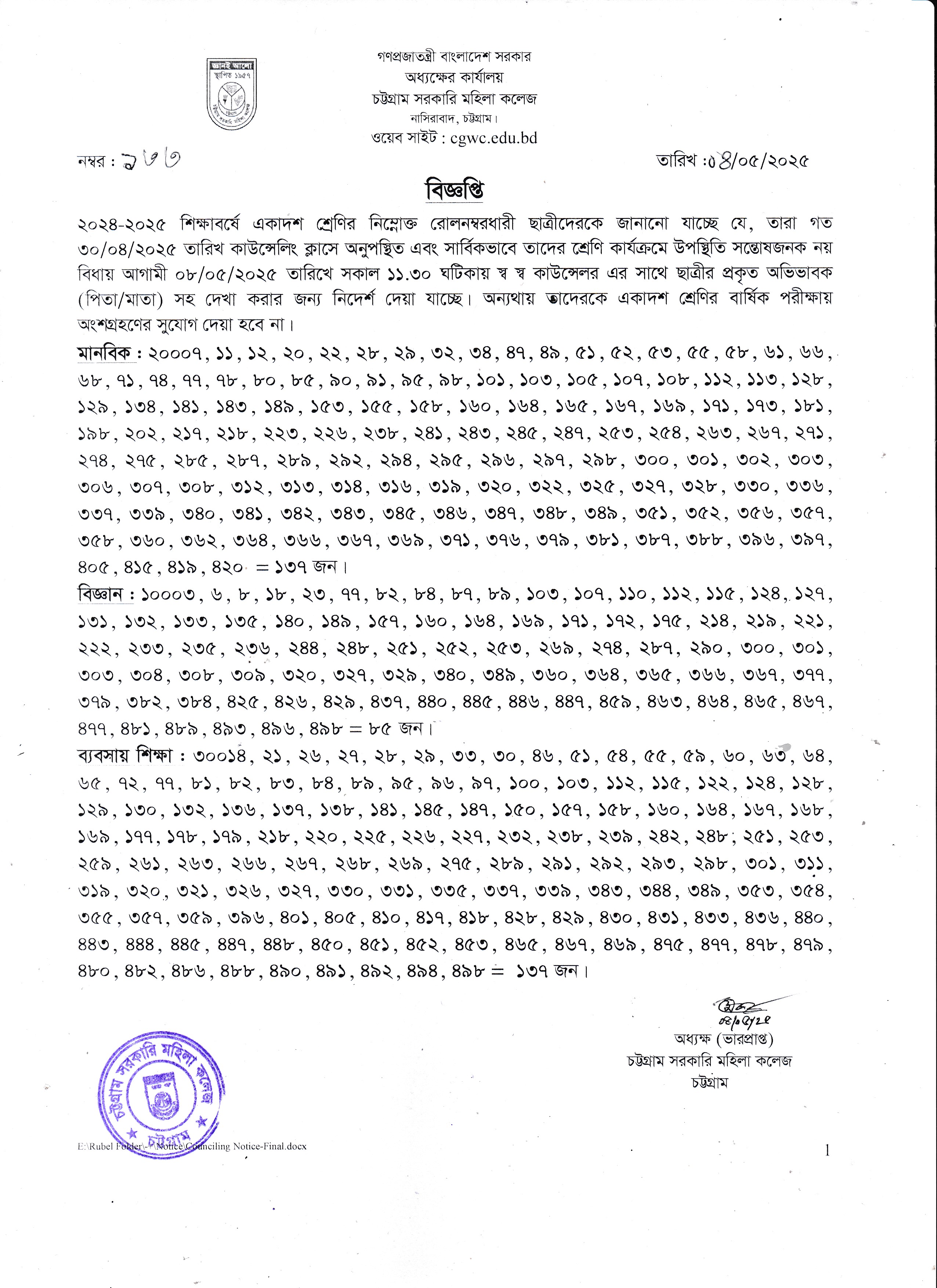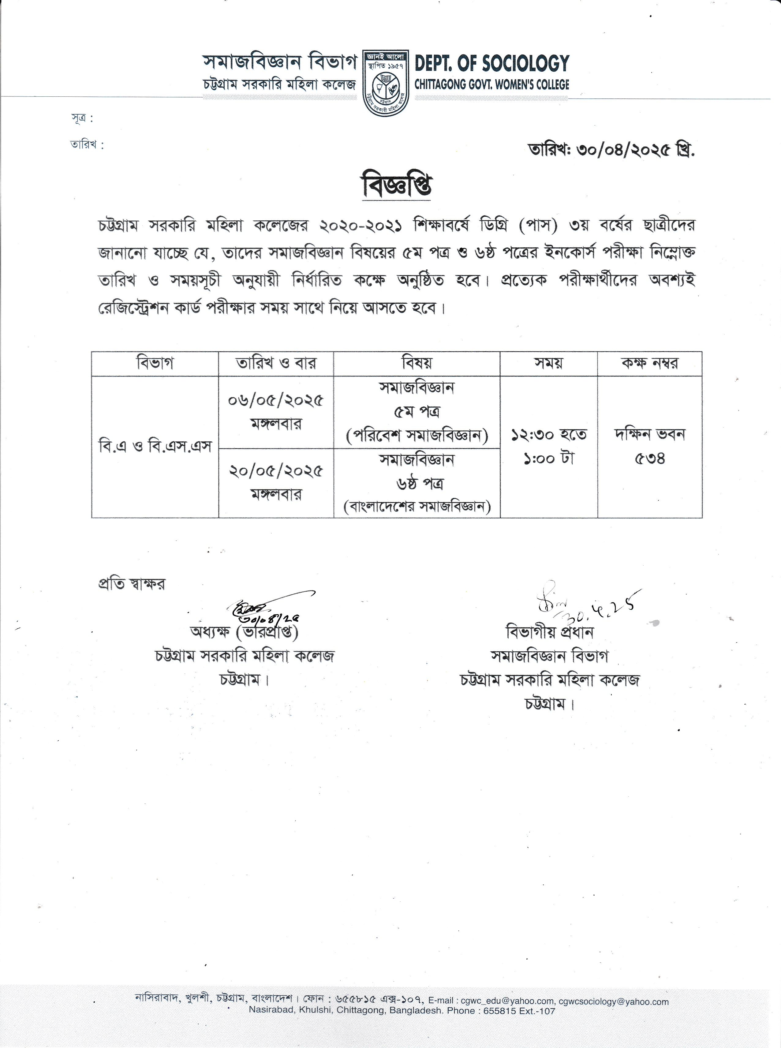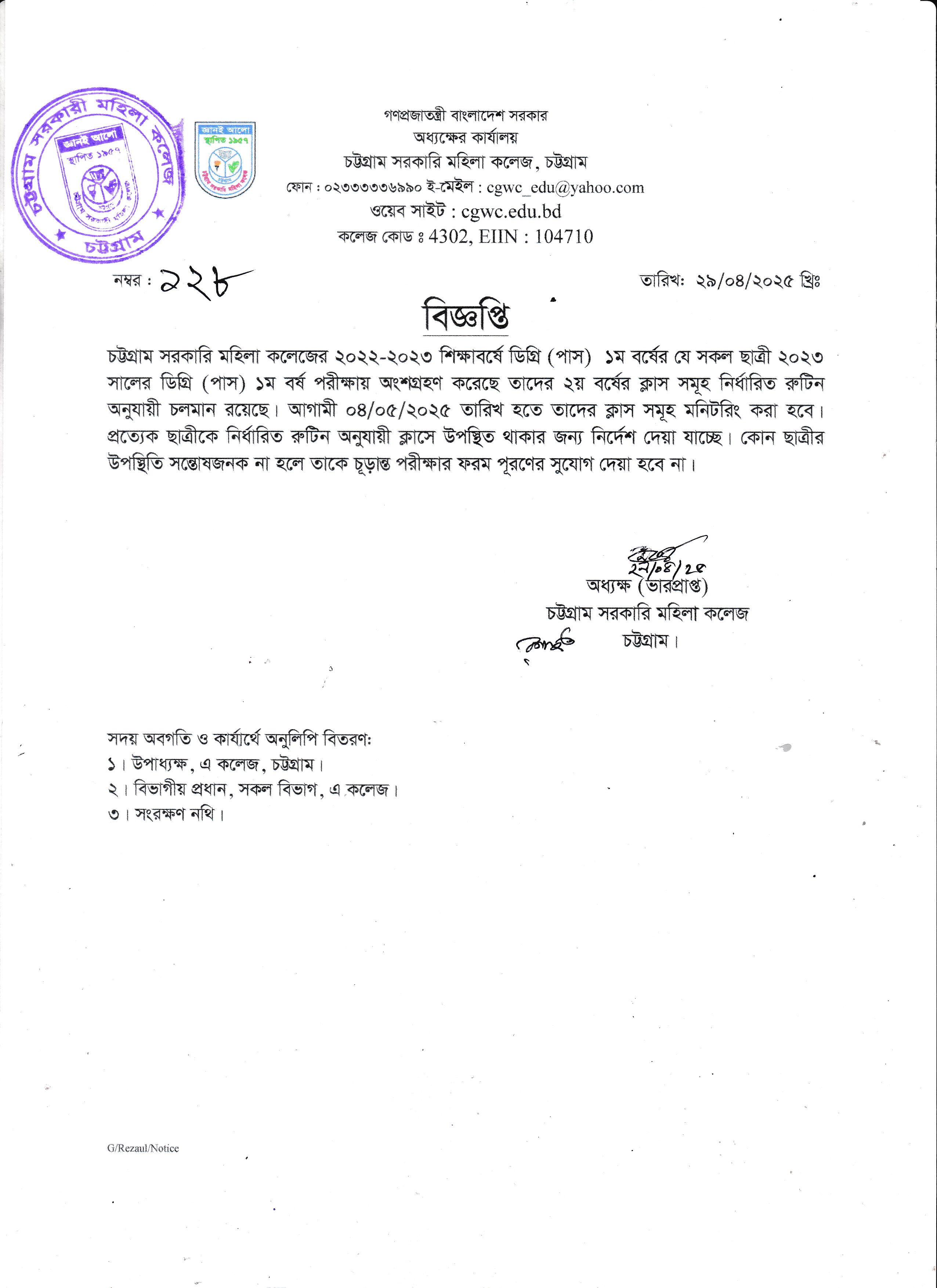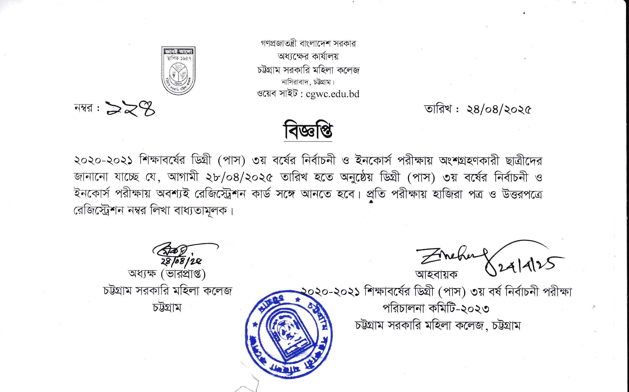 ২০২৩ সালের ডিগ্রি (পাস) ১ম বর্ষ পরীক্ষায় অংশগ্রহণকারী ছাত্রীদের ২য় বর্ষের শ্রেণি কার্যক্রম সংক্রান্ত বিজ্ঞপ্তি (২৯/০৪/২০২৫)