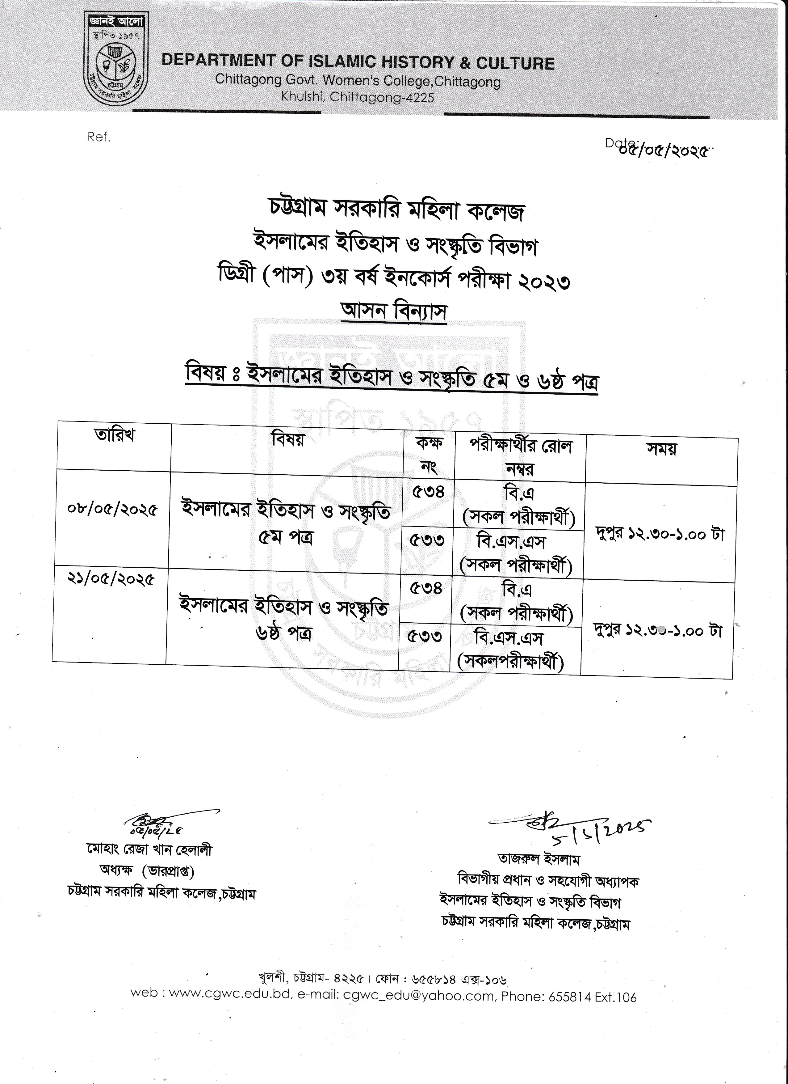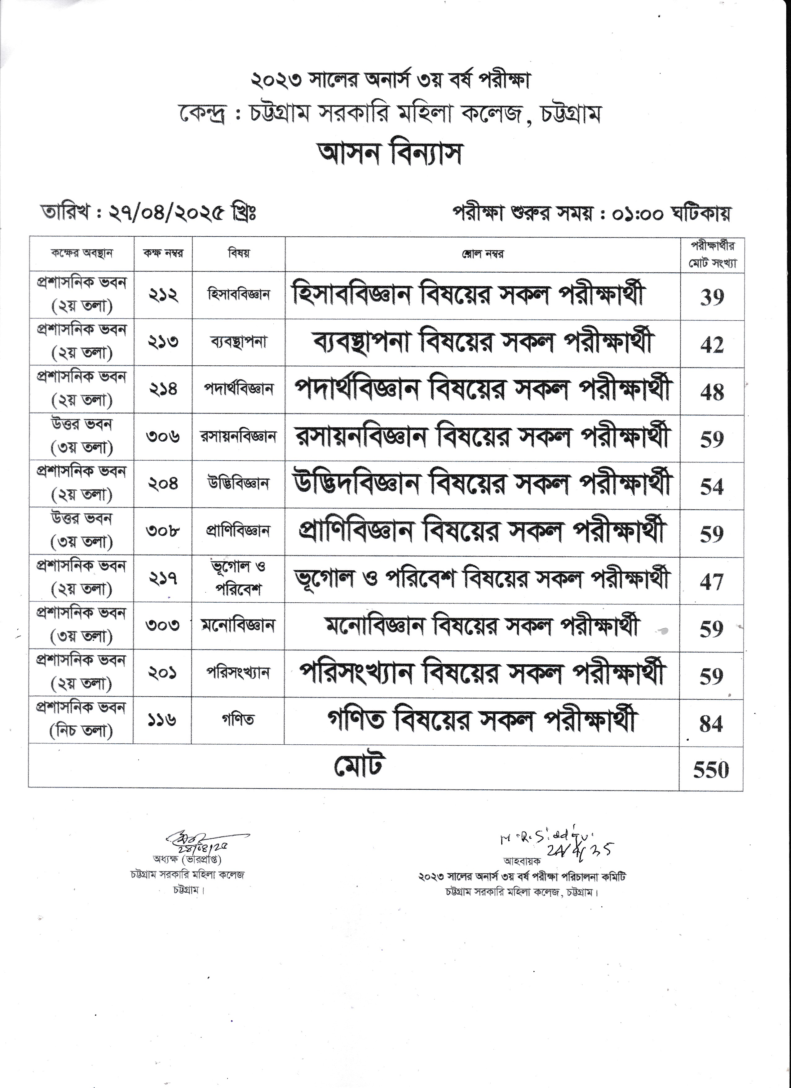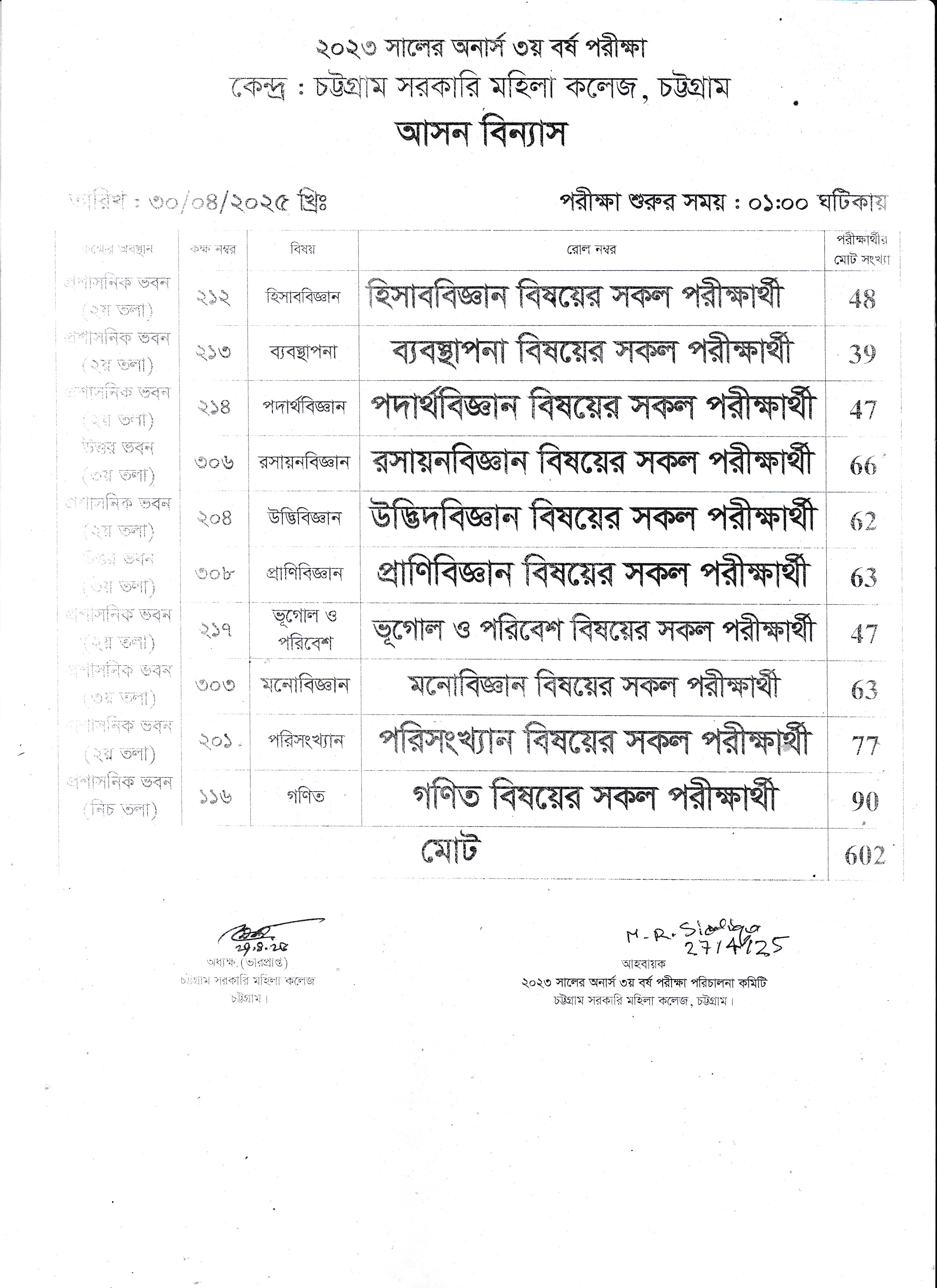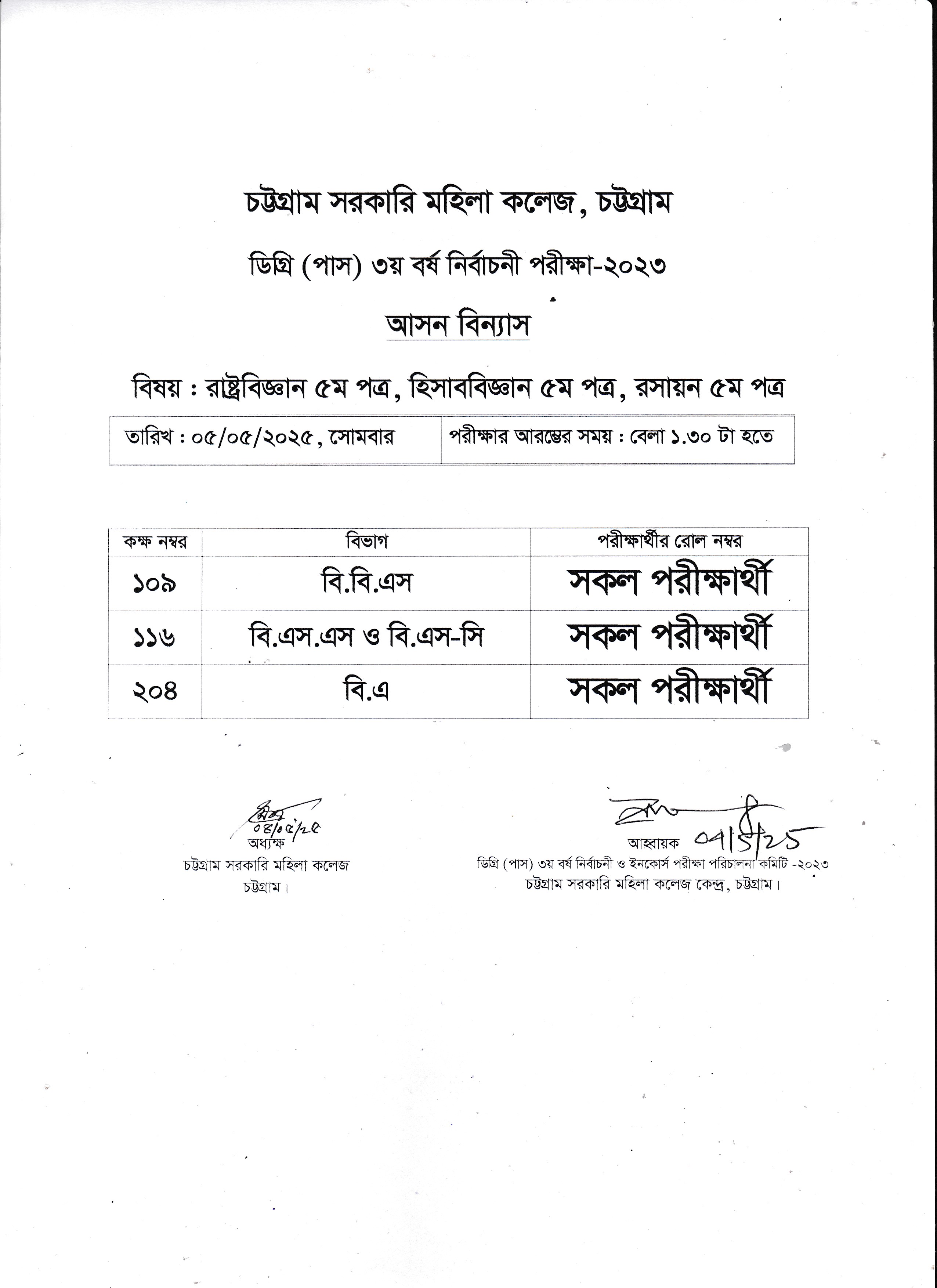 ২০২৩ সালের অনার্স ৩য় বর্ষ পরীক্ষা ৩০/০৪/২০২৫ তারিখের আসন বিন্যাস