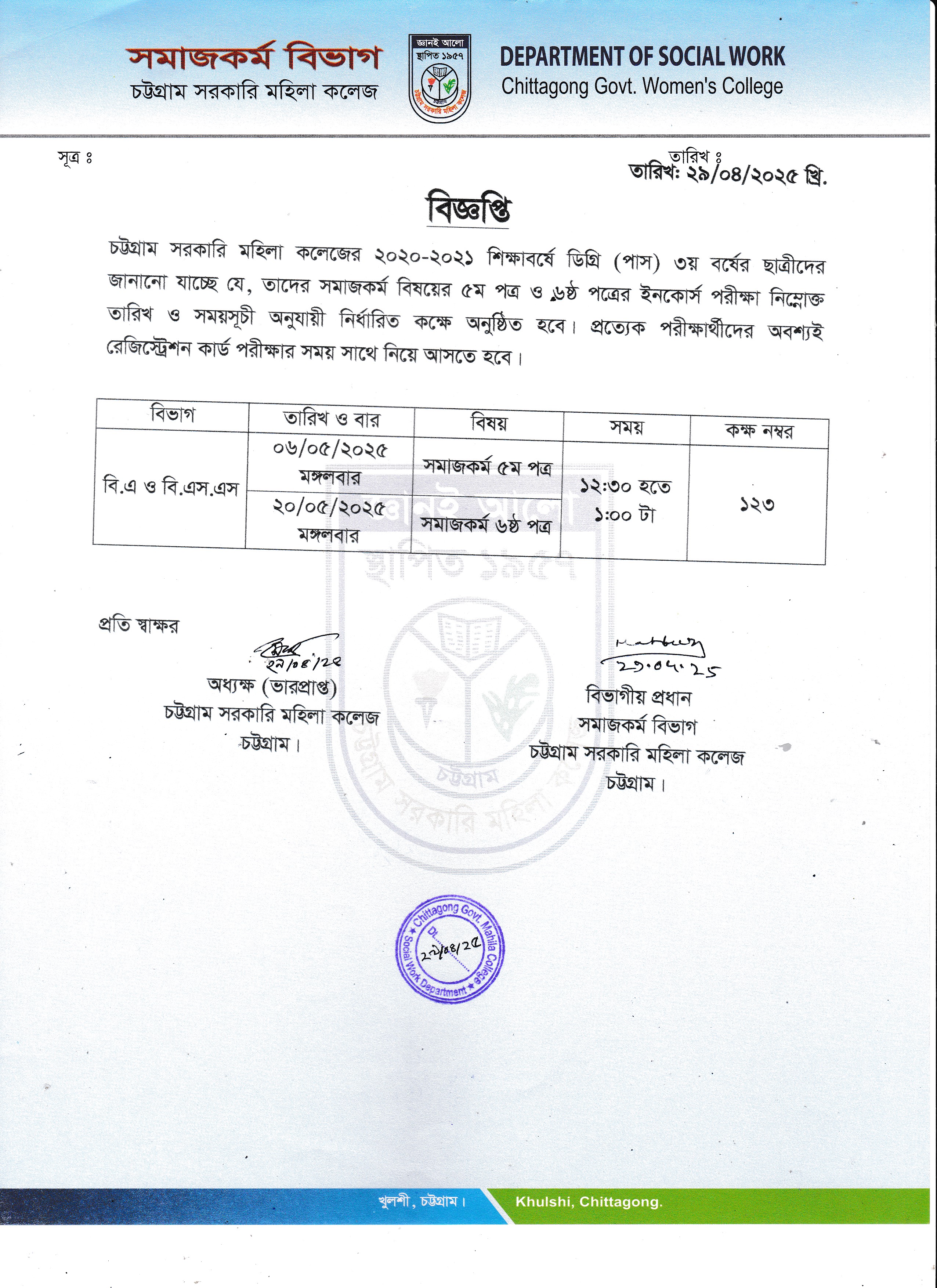 ২০২০-২০২১ শিক্ষাবর্ষে ডিগ্রি (পাস) ৩য় বর্ষের সমাজকর্ম বিষয়ের ইনকোর্স পরীক্ষা সংক্রান্ত বিজ্ঞপ্তি (২৯/০৪/২০২৫)
