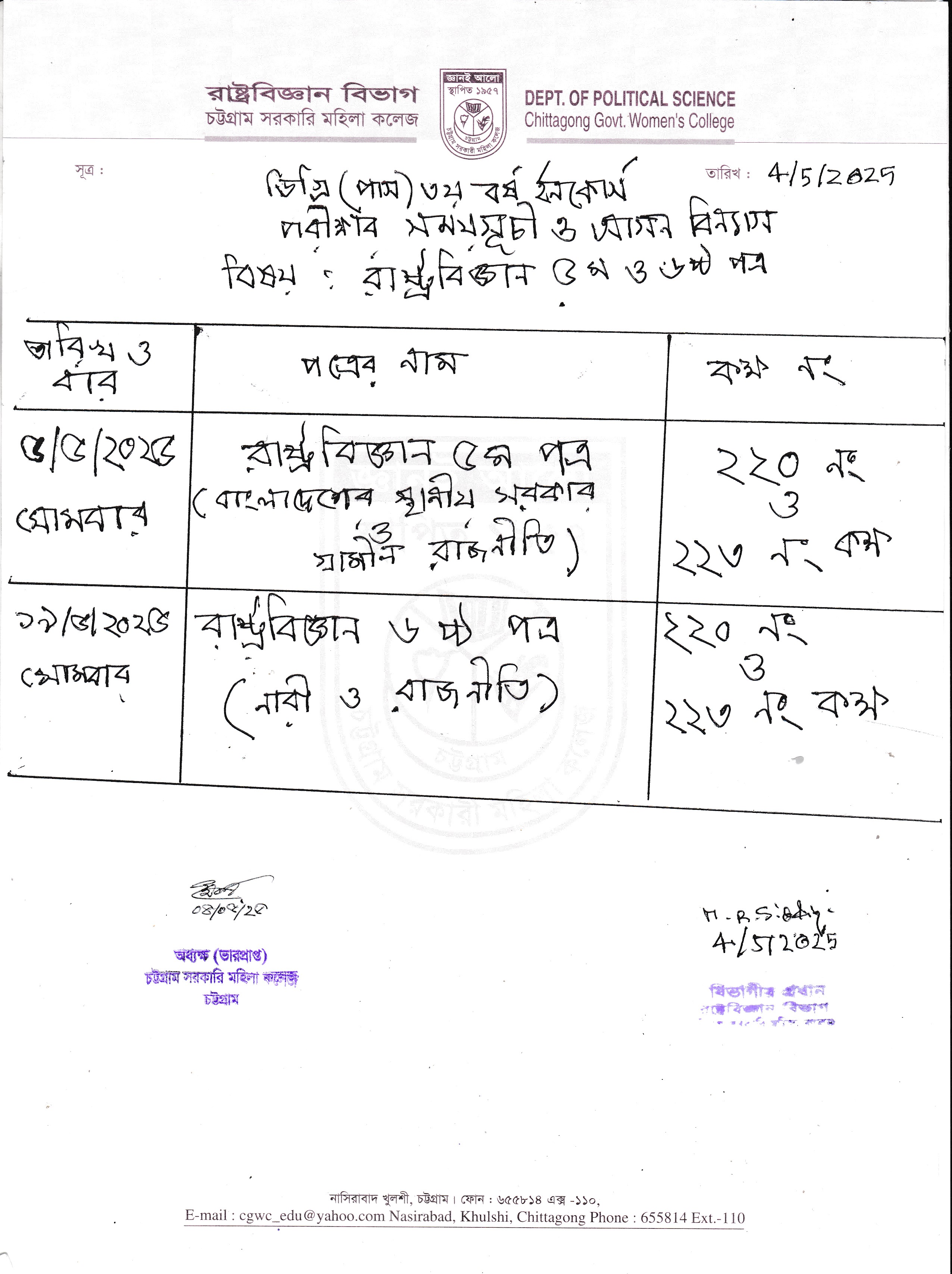 ডিগ্রি (পাস) শ্রেণির ক্লাস রুটিন (০৪/০৫/২০২৫)
