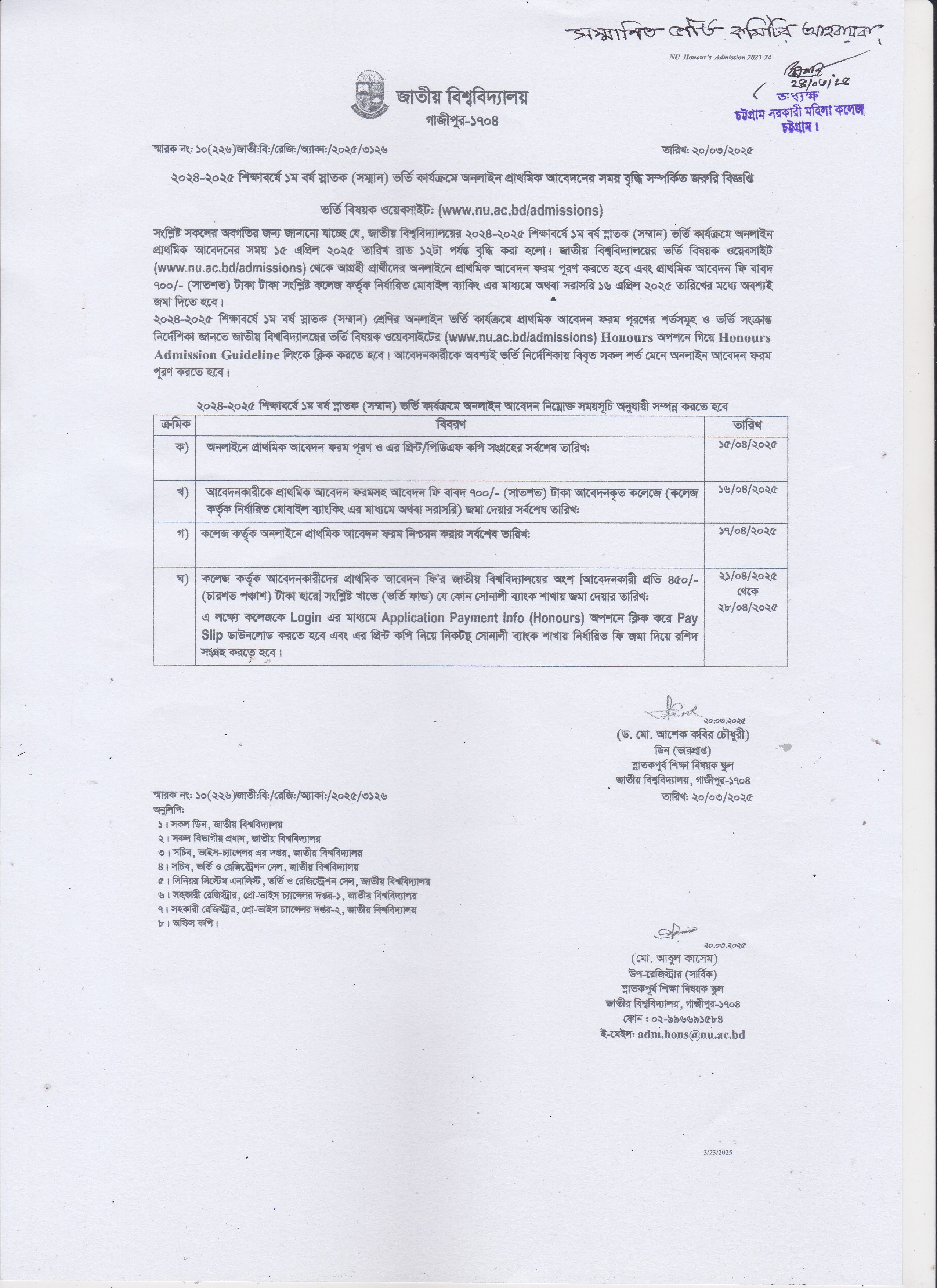 ২০২৪-২০২৫ শিক্ষাবর্ষে অনার্স ১ম বর্ষে ভর্তির প্রাথমিক আবেদনের সময় পুনঃ বৃদ্ধি সংক্রান্তত বিজ্ঞপ্তি (২৪/০৩/২০২৫)
