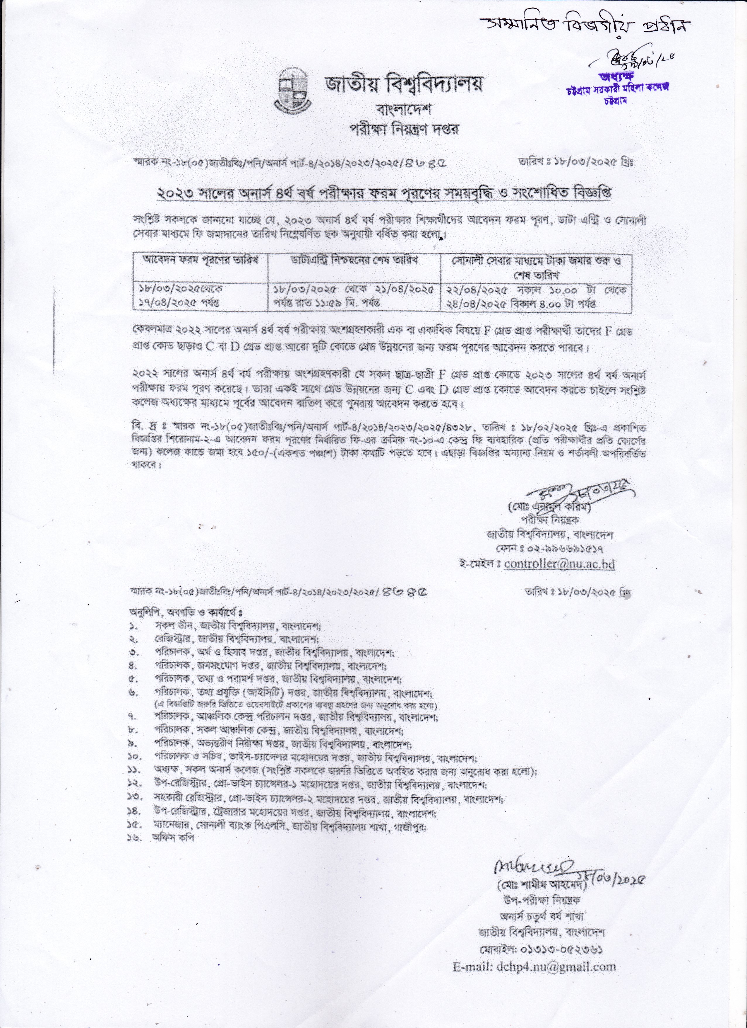 ২০২৩ সালের অনার্স ৪র্থ বর্ষের ফরম পূরণের সময় বৃদ্ধি সংক্রান্ত বিজ্ঞপ্তি