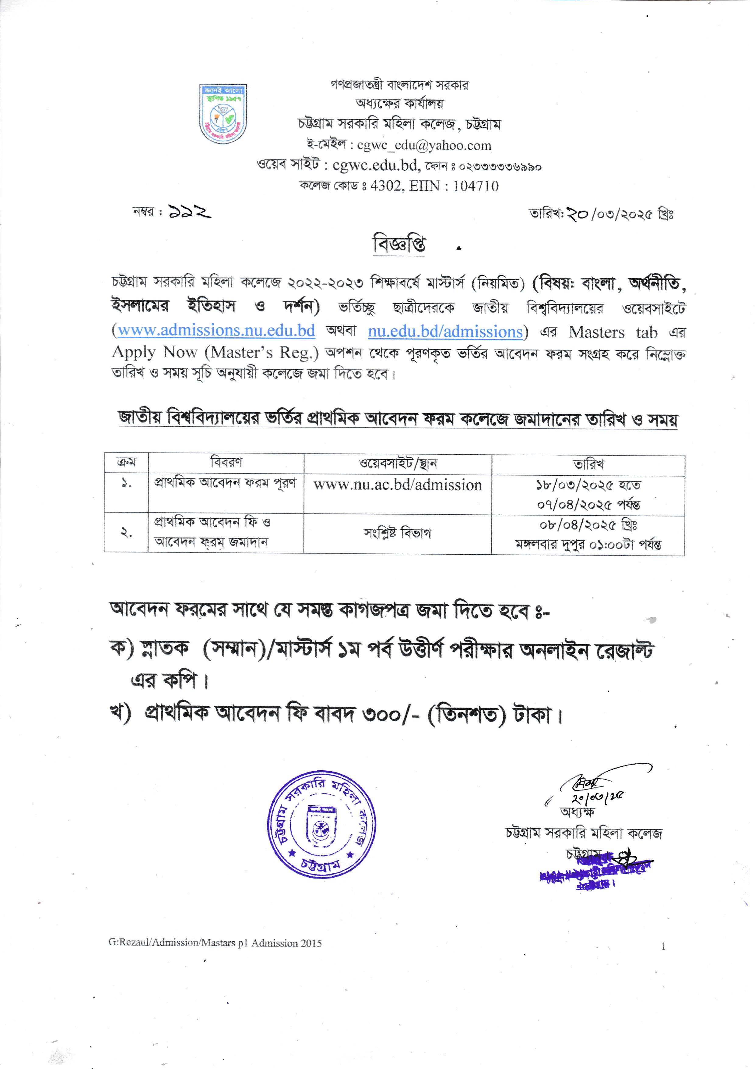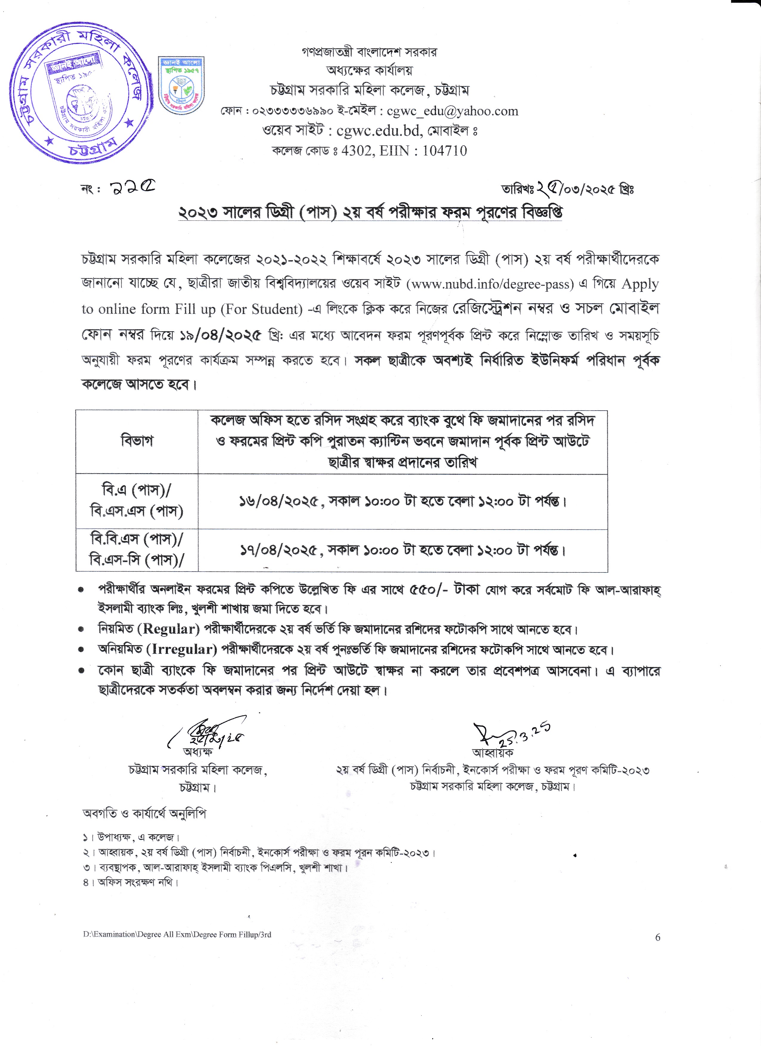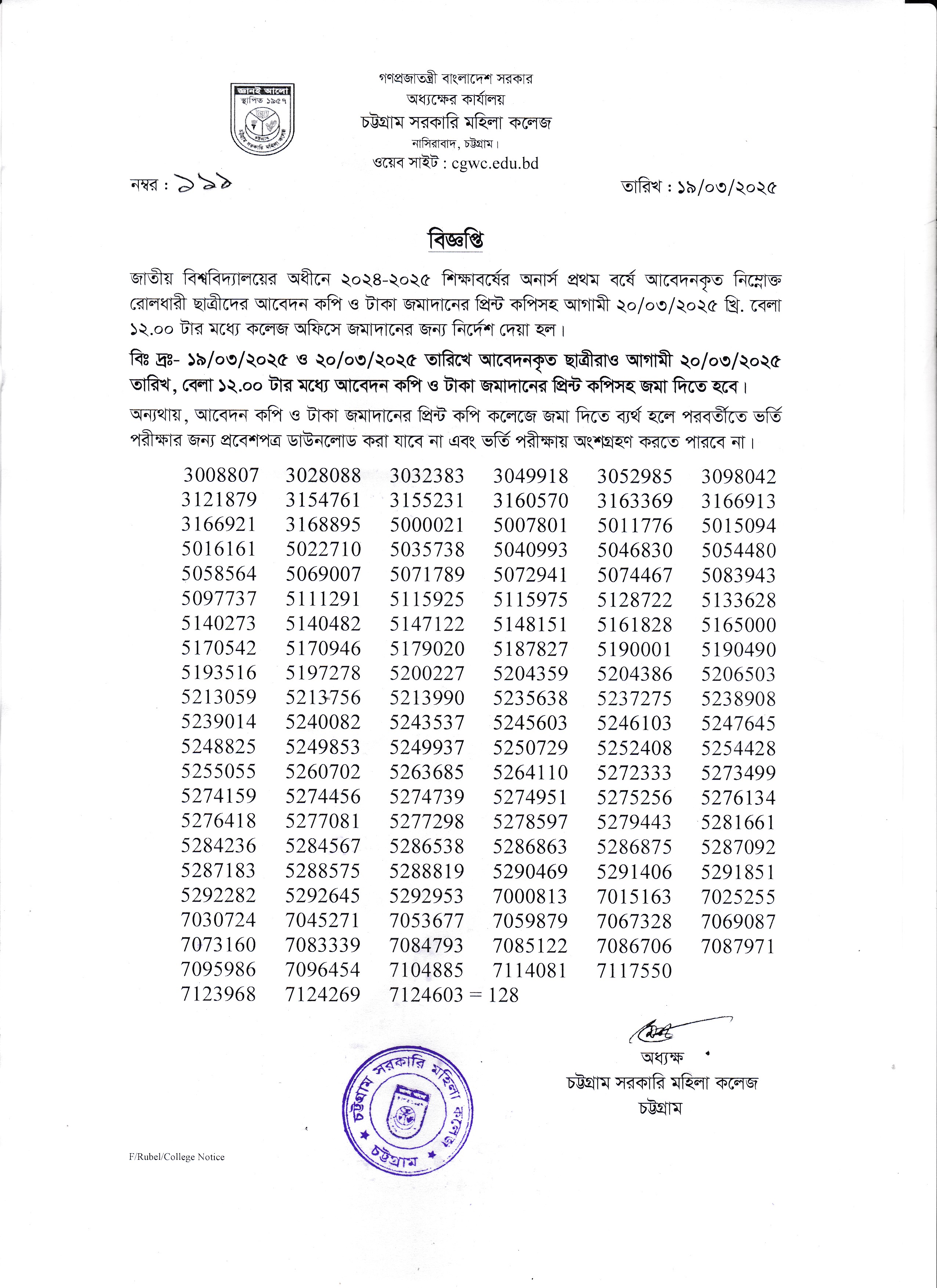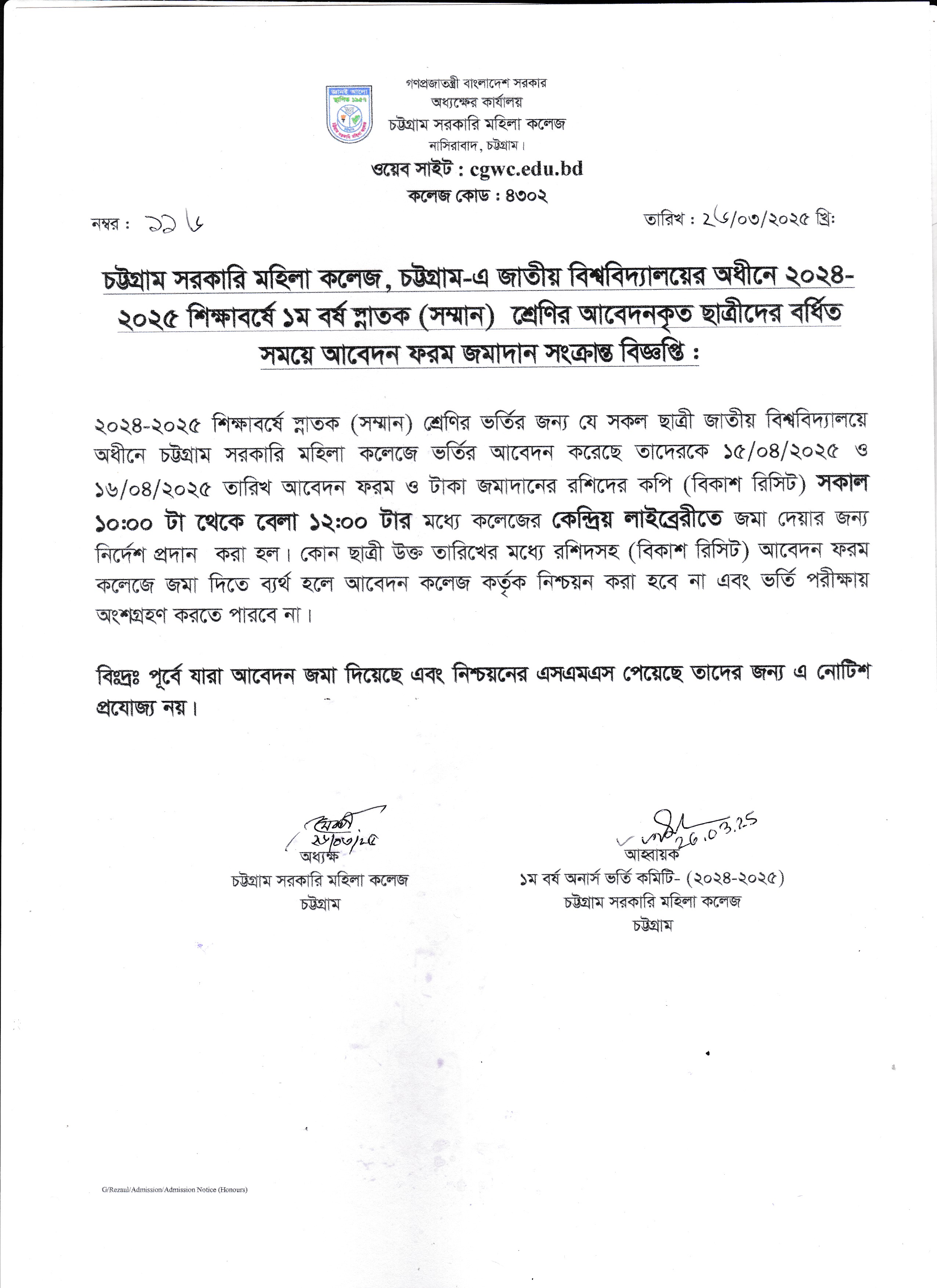 ২০২৪-২০২৫ শিক্ষাবর্ষের অনার্স প্রথম বর্ষে আবেদনকৃত ছাত্রীদের আবেদন ফরম ও টাকা জমাদানের প্রিন্ট কপি জমাদান সংক্রান্ত বিজ্ঞপ্তি