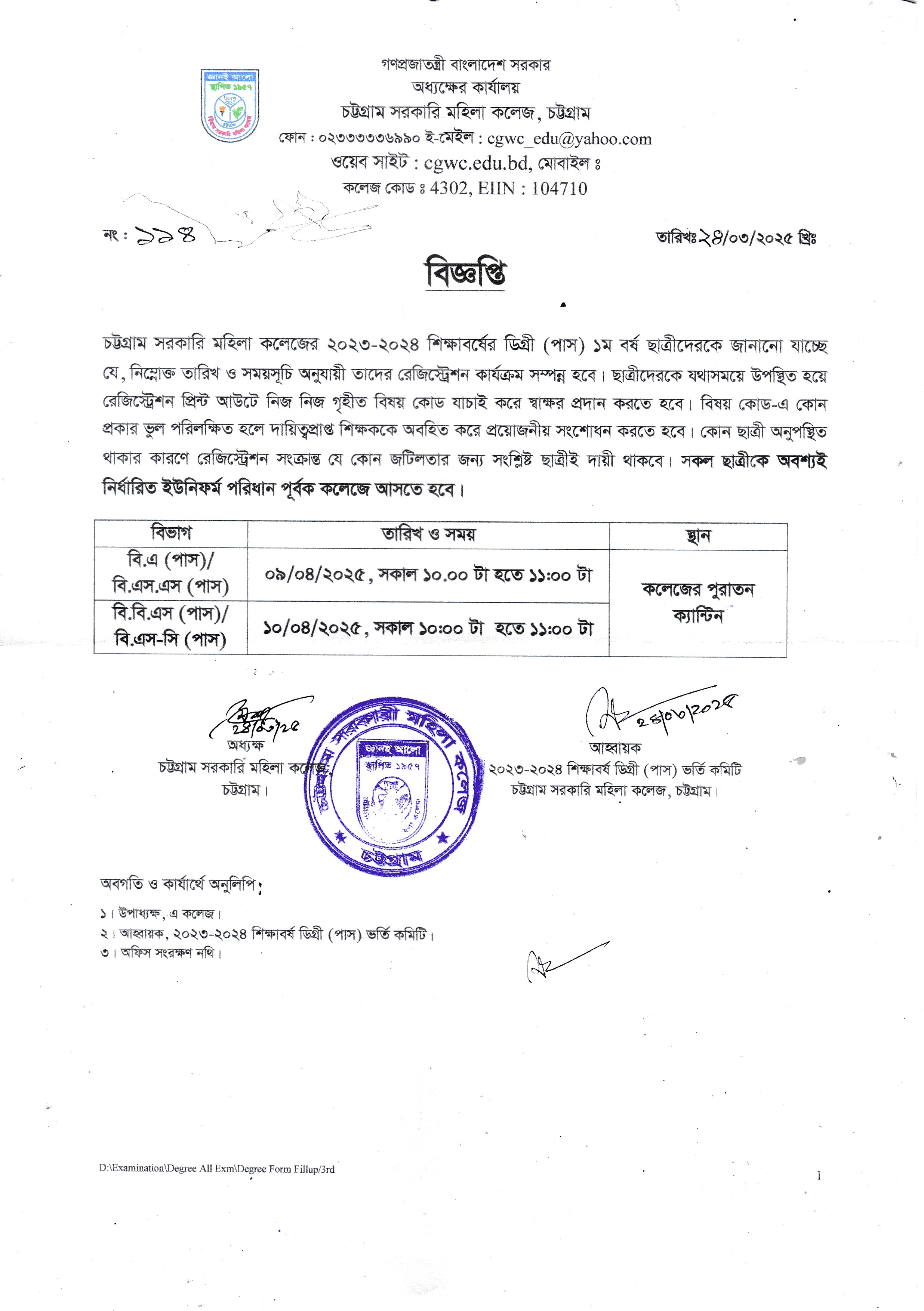 ২০২৩-২০২৪ শিক্ষাবর্ষে ডিগ্রি (পাস) ১ম বর্ষে ভর্তিকৃত ছাত্রীদের রেজিস্ট্রেশন সংক্রান্ত বিজ্ঞপ্তি (২৪/০৩/২০২৫)