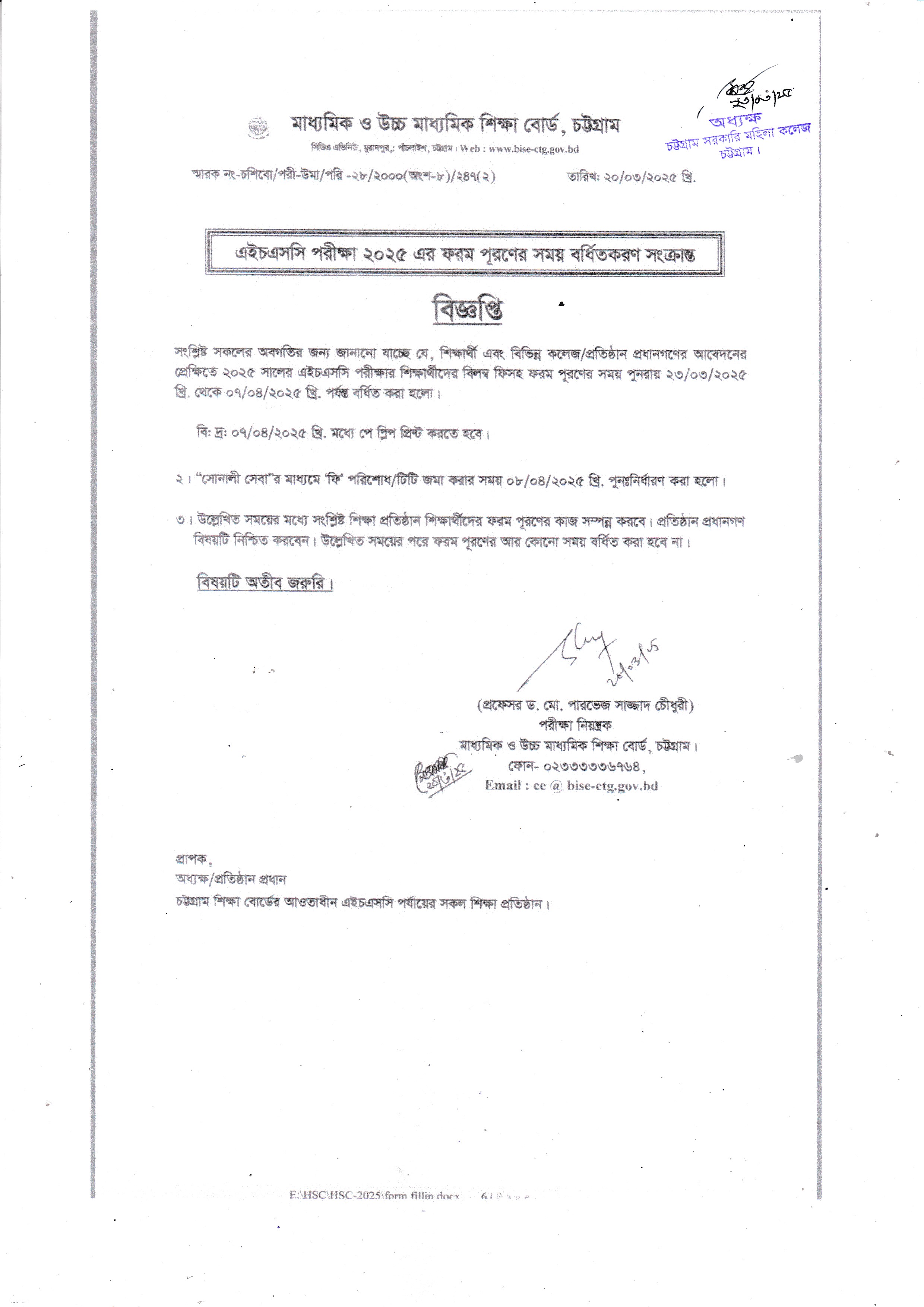 ২০২৫ সালের এইচএসসি পরীক্ষার ফরম পূরণের সময়বৃদ্ধি সংক্রান্ত বিজ্ঞপ্তি (২৩/০৩/২০২৫)