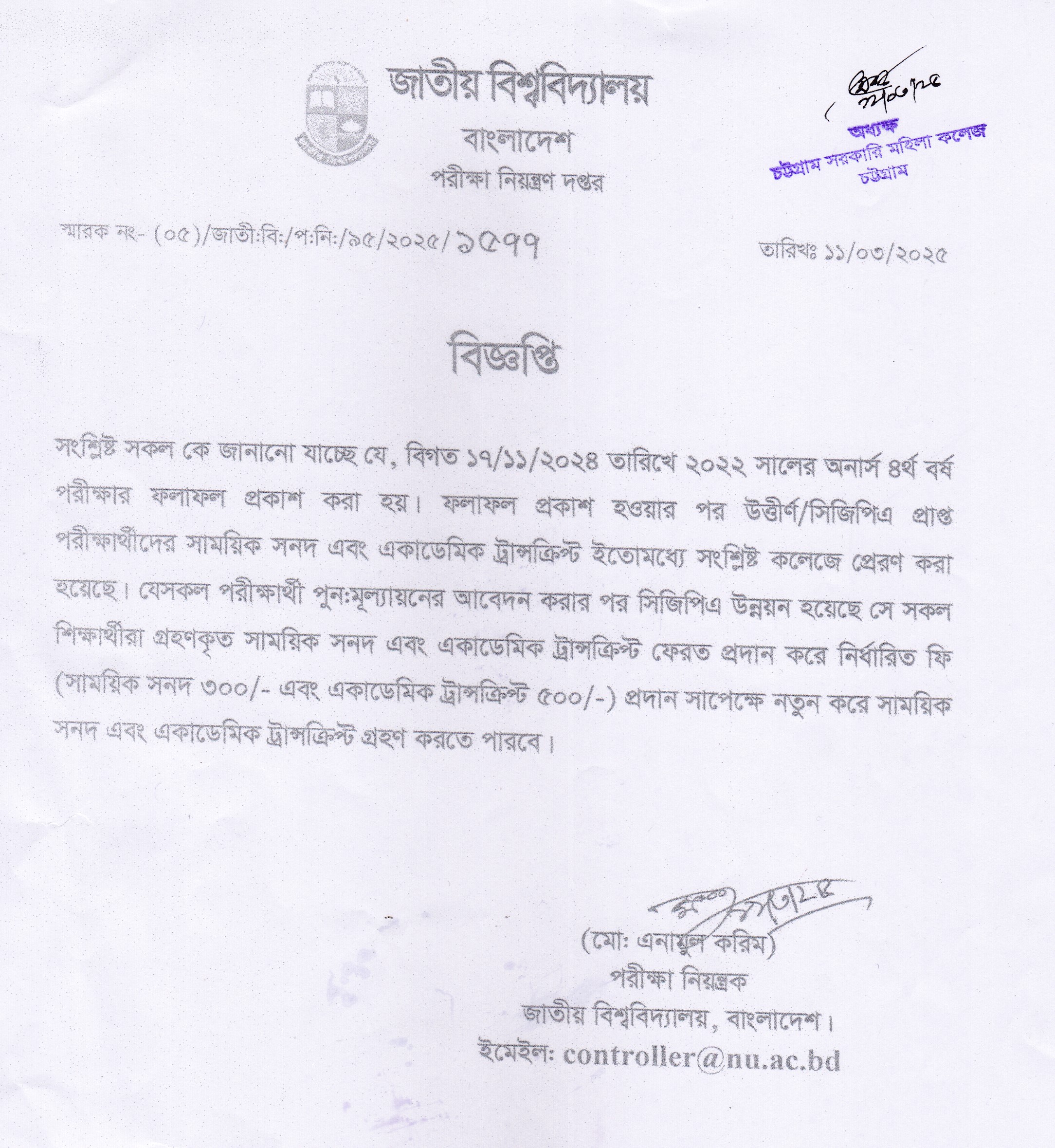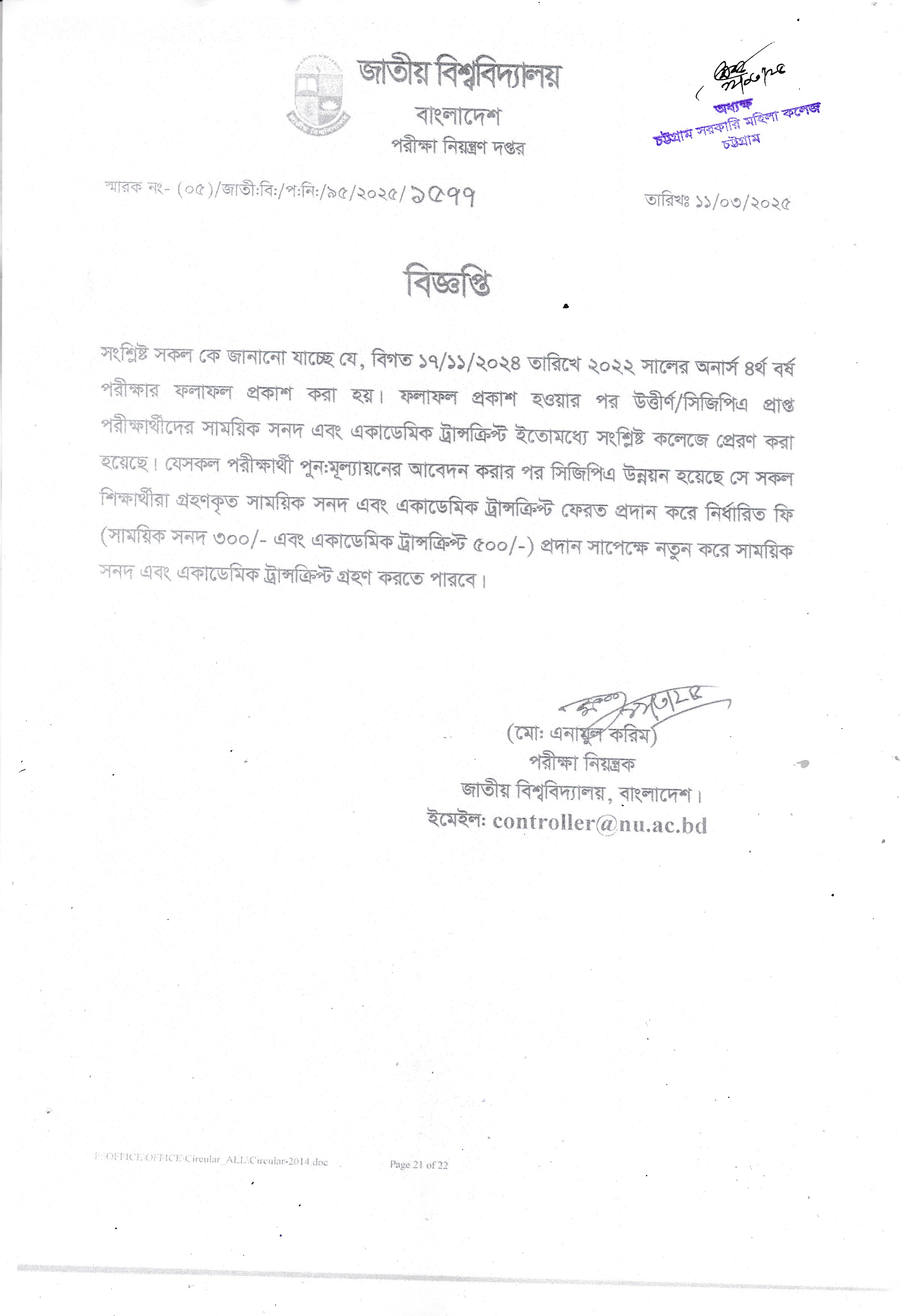 ২০২২ সালের অনার্স ৪র্থ বর্ষের সংশোধিত ফলাফলের সাময়িক সনদ ও নম্বরফর্দ গ্রহণ প্রসঙ্গে।