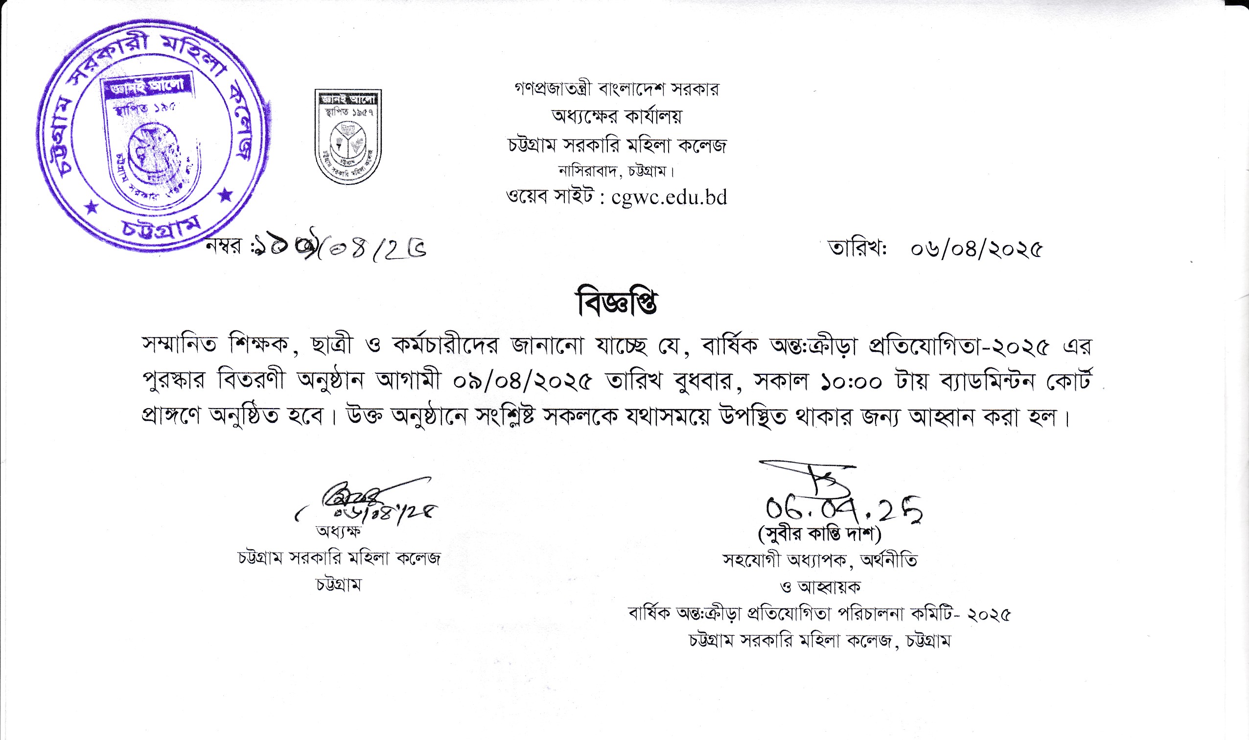 বার্ষিক অন্তঃক্রীড়া প্রতিযোগিতা-২০২৫ এর বিজ্ঞপ্তি