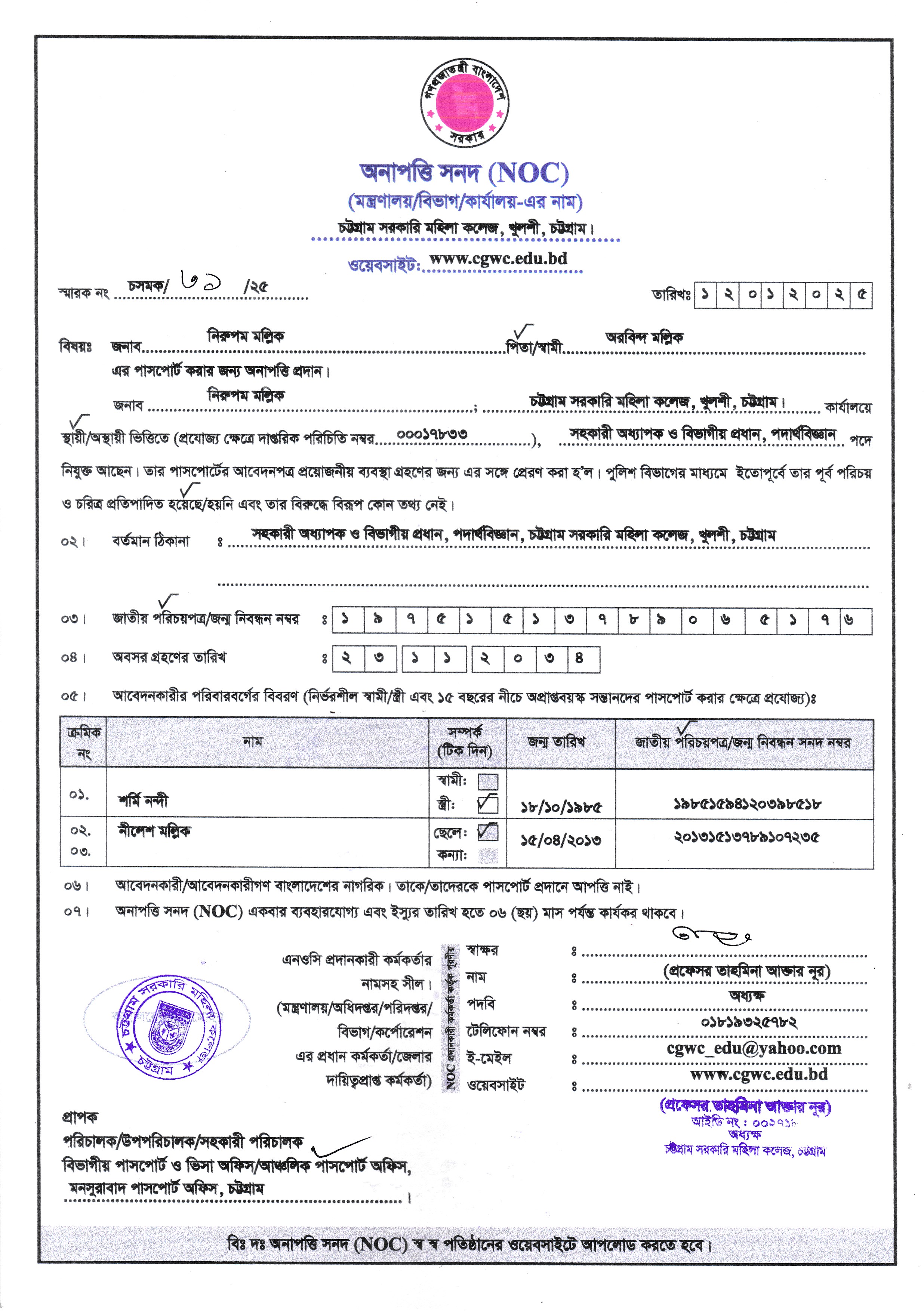 জনাব নিরুপম মল্লিক, সহকারী অধ্যাপক, পদার্থবিজ্ঞান, চট্টগ্রাম সরকারি মহিলা কলেজের NOC ফরম