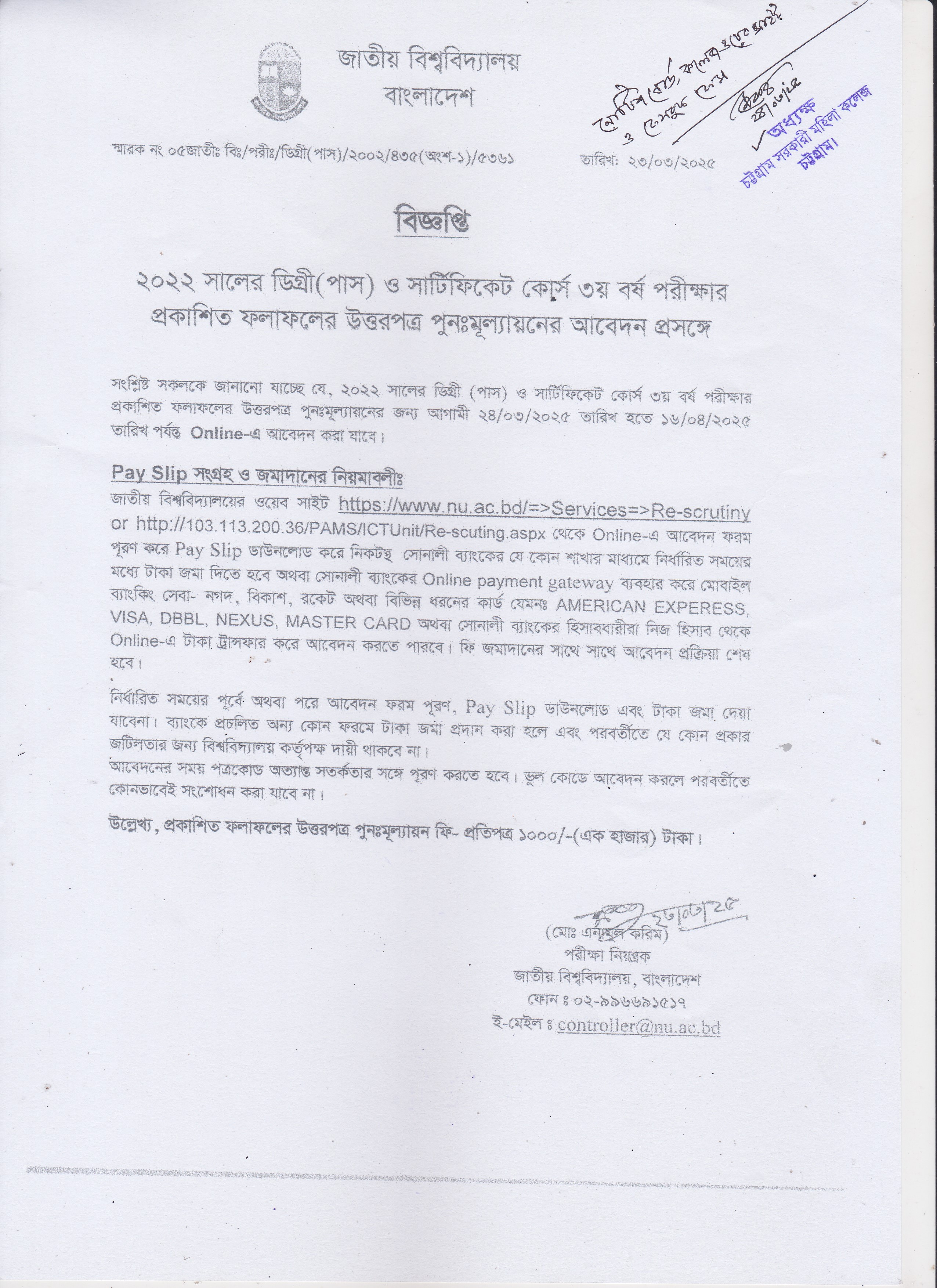 ডিগ্রি (পাস) ৩য় বর্ষ পরীক্ষা-২০২২ এর ফলাফলের উত্তরপত্র পুনঃমূল্যায়নের বিজ্ঞপ্তি (২৪/০৩/২০২৫)