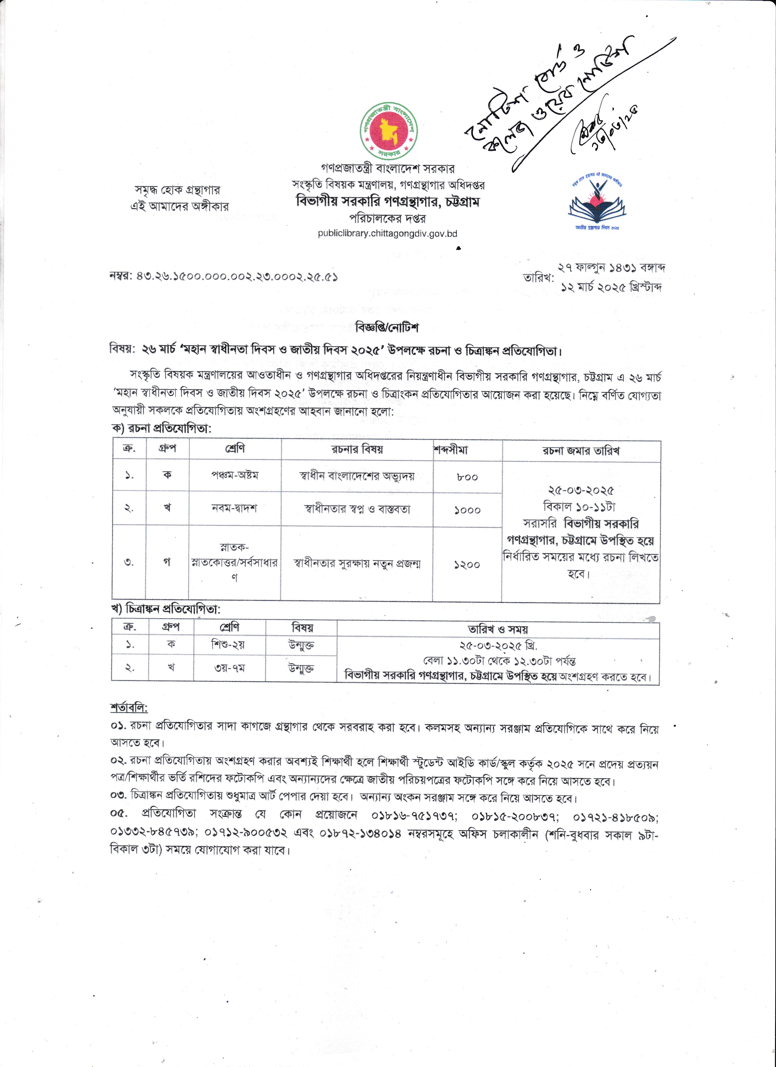 ২৬ মার্চ ‘মহান স্বাধীনতা দিবস ও জাতীয় দিবস-২০২৫’ উপলক্ষে রচনা ও চিত্রাঙ্কন প্রতিযোগিতার বিজ্ঞপ্তি (১৩/০৩/২০২৫)