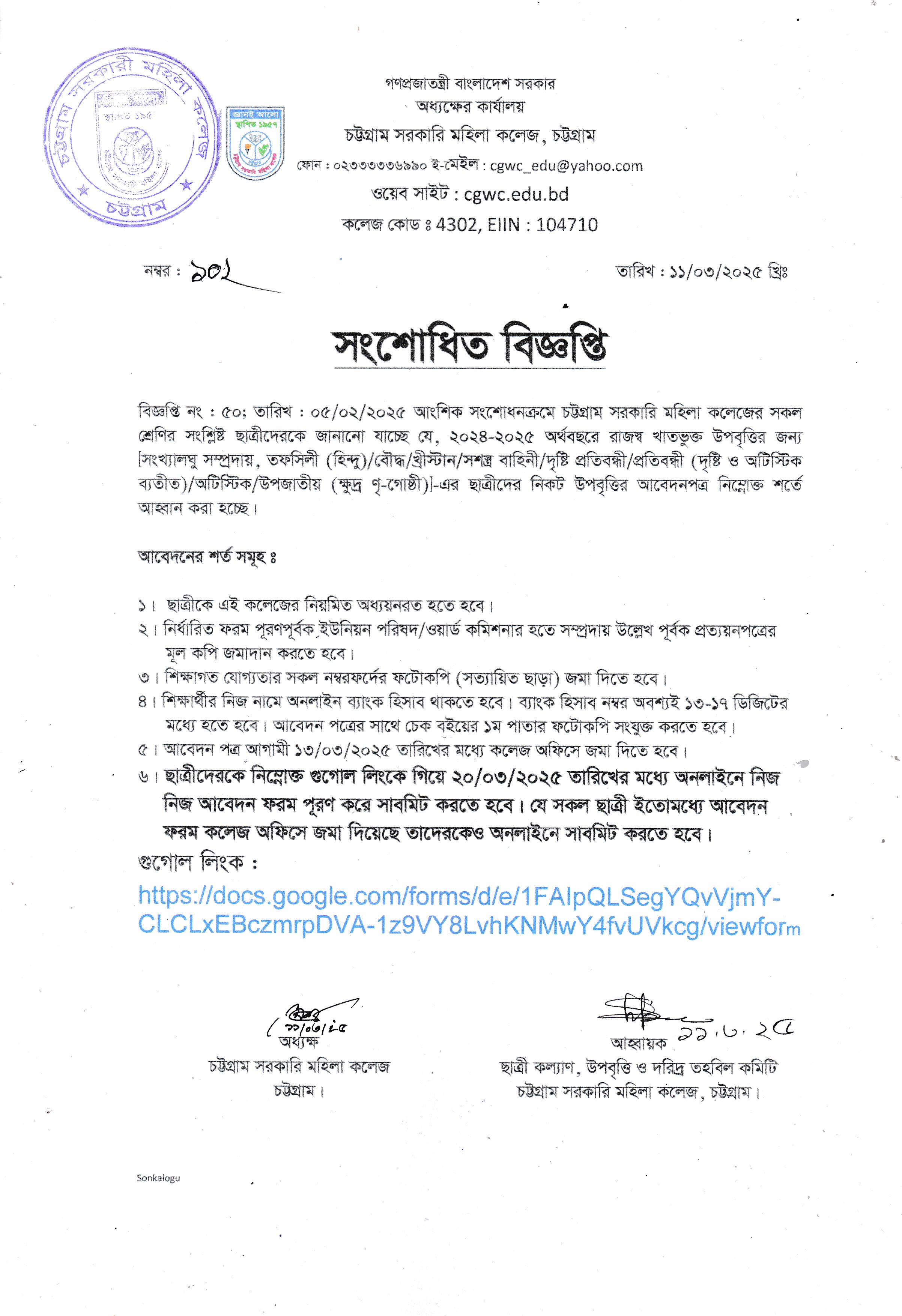 সংখ্যালঘু সম্প্রদায়, তফসিলী হিন্দু (হিন্দু)/বৌদ্ধ/খ্রীস্টান/সশস্ত্র বাহিনী/ দৃষ্টি প্রতিবন্ধী/প্রতিবন্ধী/অটিস্টিক/ উপজাতীয় (ক্ষুদ্র ণৃ-গোষ্ঠী) ছাত্রীদের উপবৃত্তি সংক্রান্ত সংশোধিত বিজ্ঞপ্তি (১১/০৩/২০২৫)