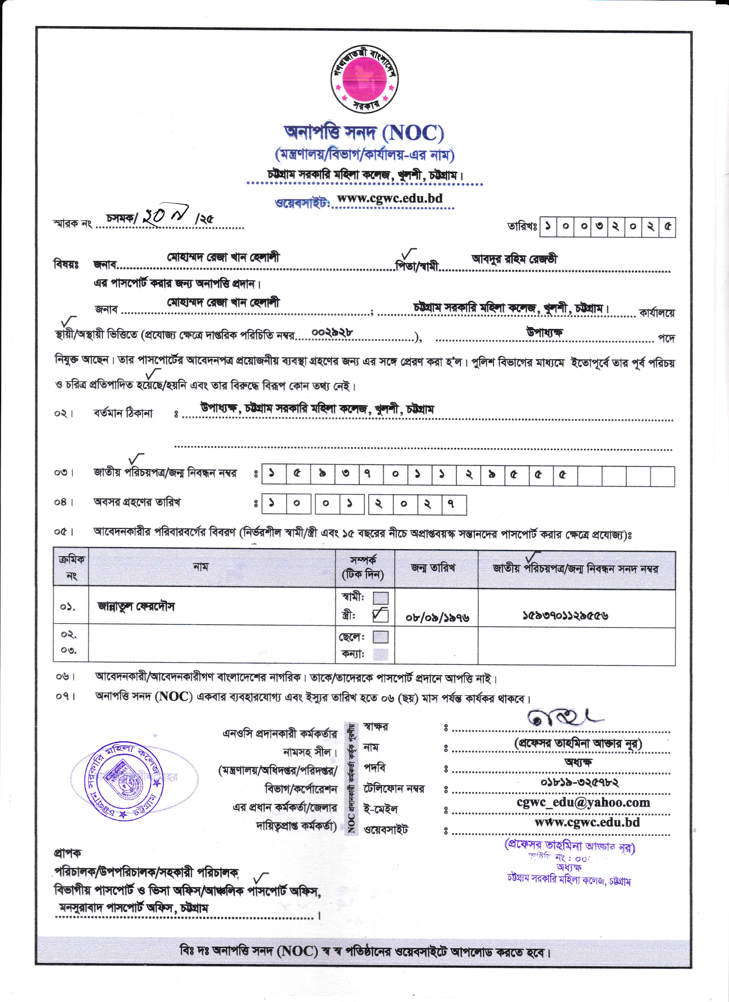 প্রফেসর মোহাং রেজা খান হেলালী, উপাধ্যক্ষ, চট্টগ্রাম সরকারি মহিলা কলেজের NOC ফরম