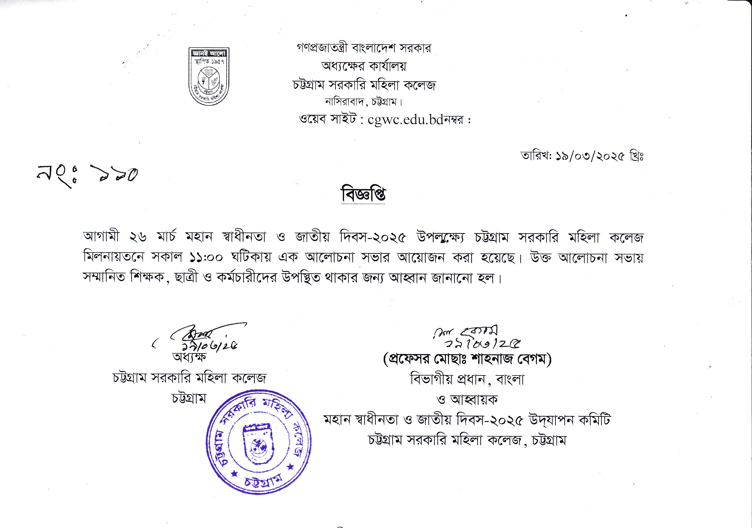 ২৬ মার্চ মহান স্বাধীনতা ও জাতীয় দিবস-২০২৫ উপলক্ষে আলোচনা সভার বিজ্ঞপ্তি।