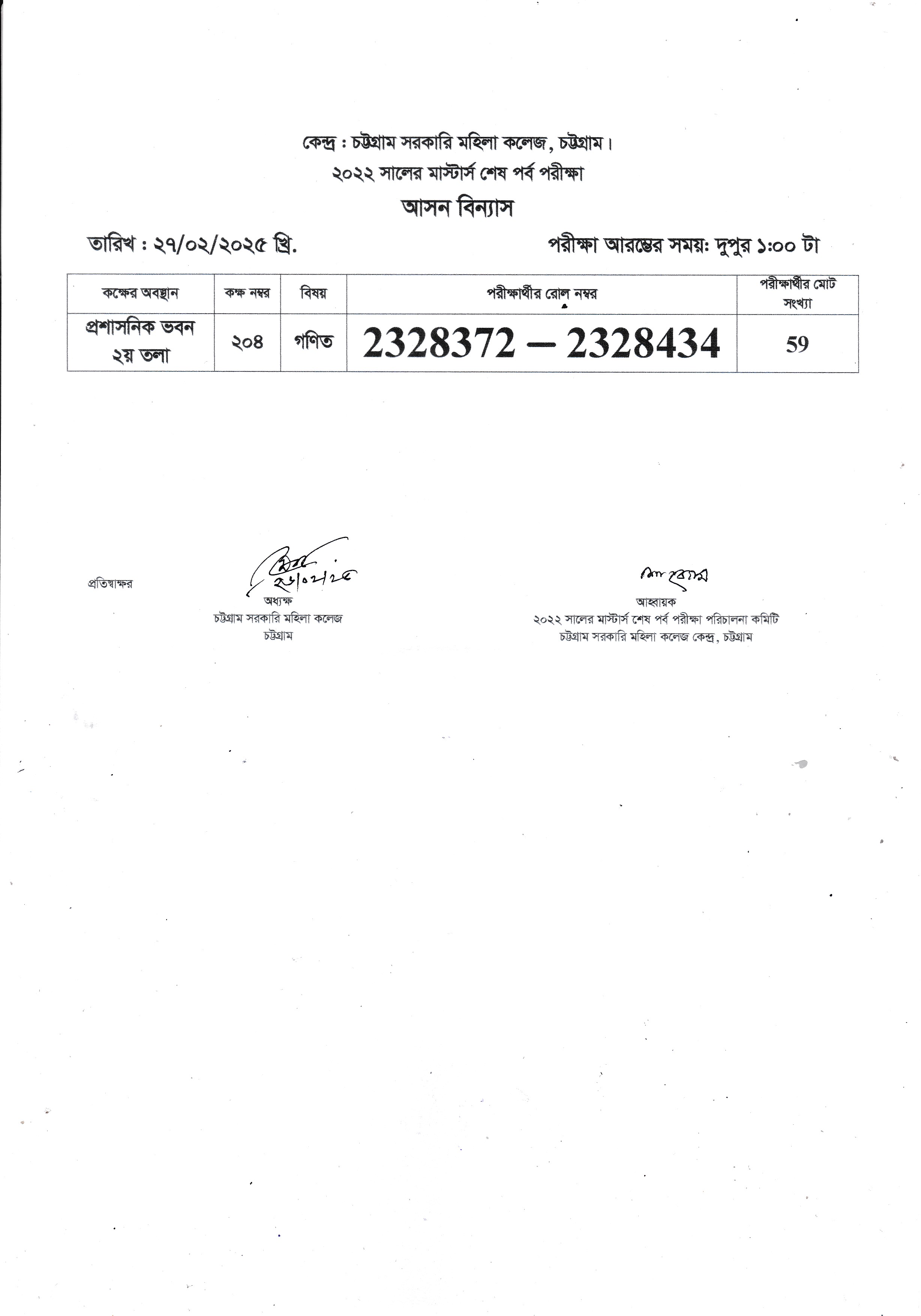মাস্টার্স শেষপর্ব পরীক্ষা-২০২২ এর আগামী ২৭/০২/২০২৫ তারিখের পরীক্ষার আসন বিন্যাস
