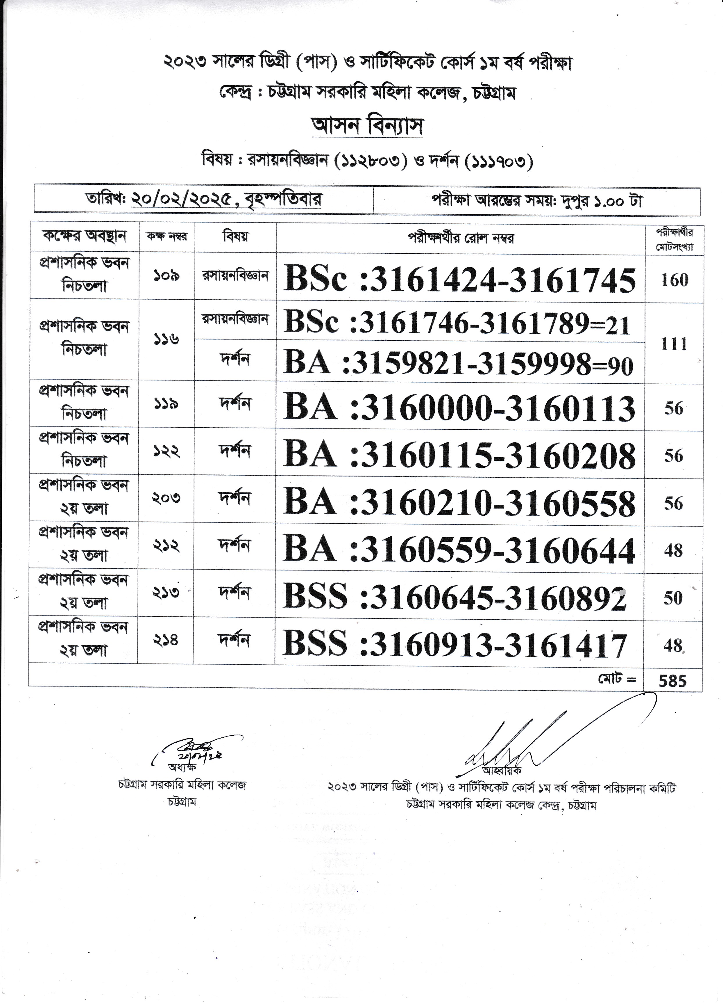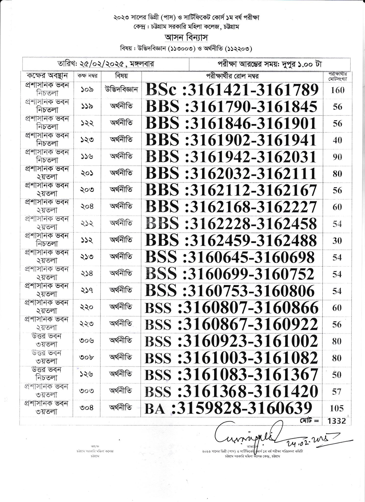 ডিগ্রি (পাস) ১ম বর্ষ পরীক্ষা-২০২৩ এর আগামী ২৫/০২/২০২৫ তারিখের পরীক্ষার আসন বিন্যাস