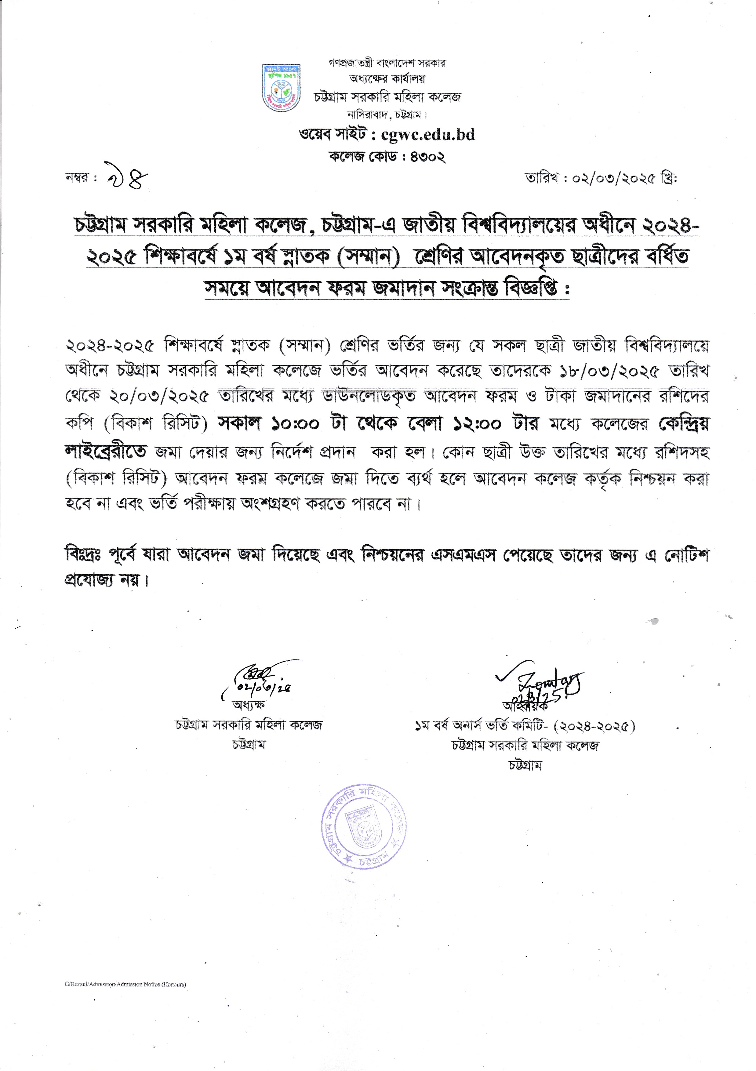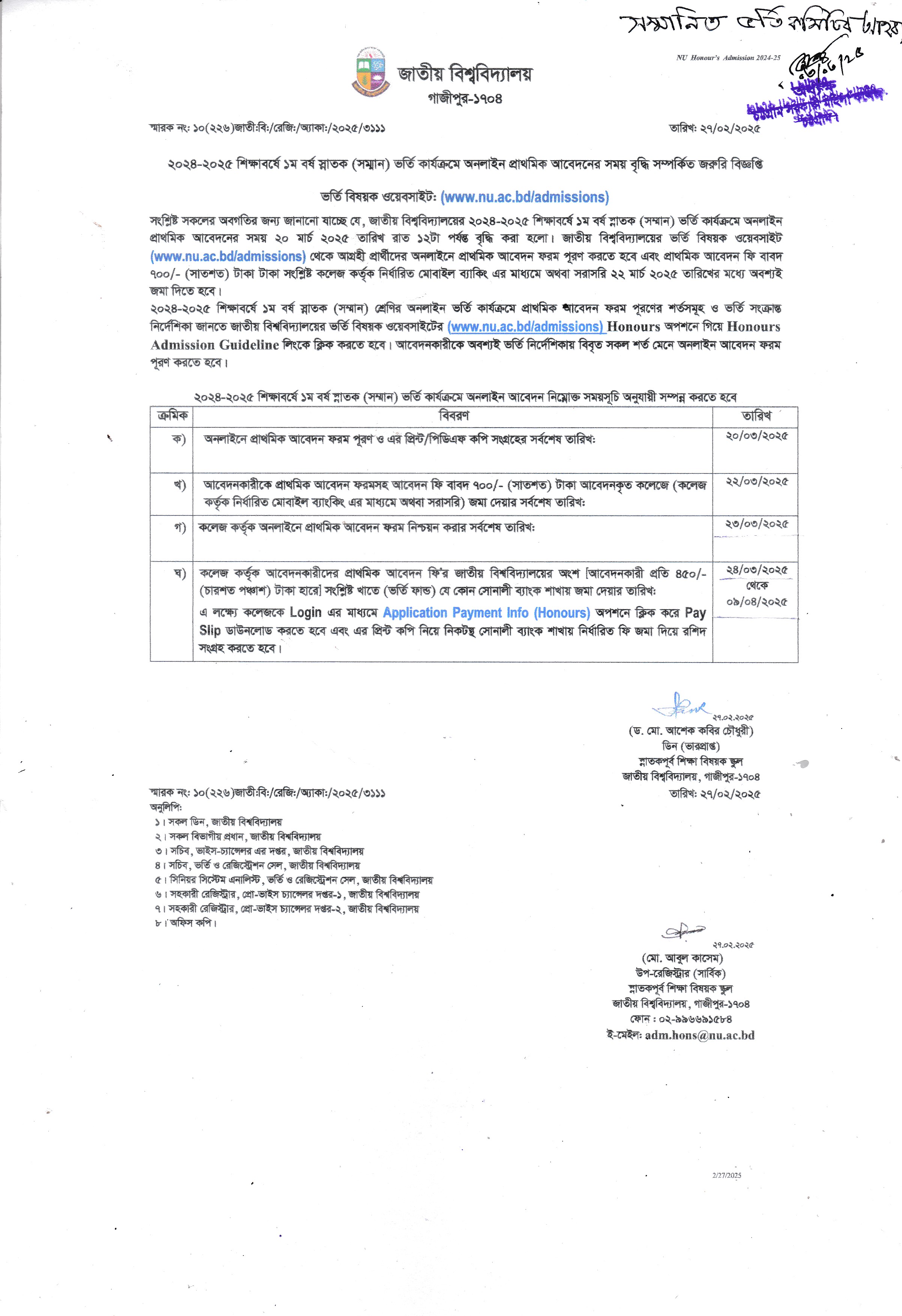 ২০২৪-২০২৫ শিক্ষাবর্ষে অনার্স ১ম বর্ষে ভর্তির প্রাথমিক আবেদনের সময় বৃদ্ধি সংক্রান্তত বিজ্ঞপ্তি (০৯/০৩/২০২৫)