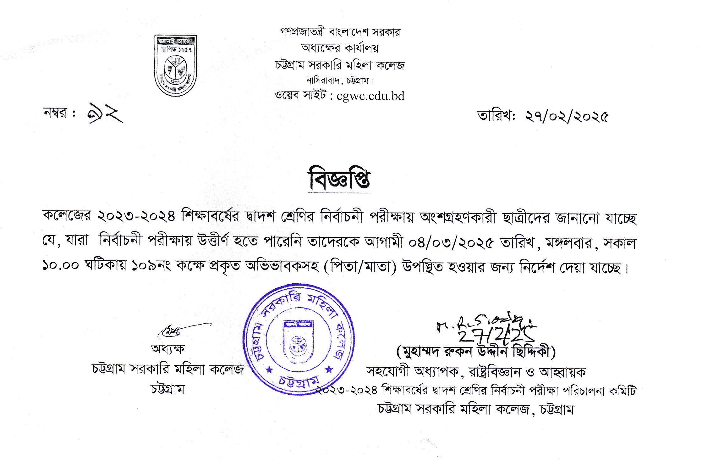 ২০২৩-২০২৪ শিক্ষাবর্ষের দ্বাদশ শ্রেণির নির্বাচনী পরীক্ষায় অনুত্তীর্ণ ছাত্রীদের বিজ্ঞপ্তি