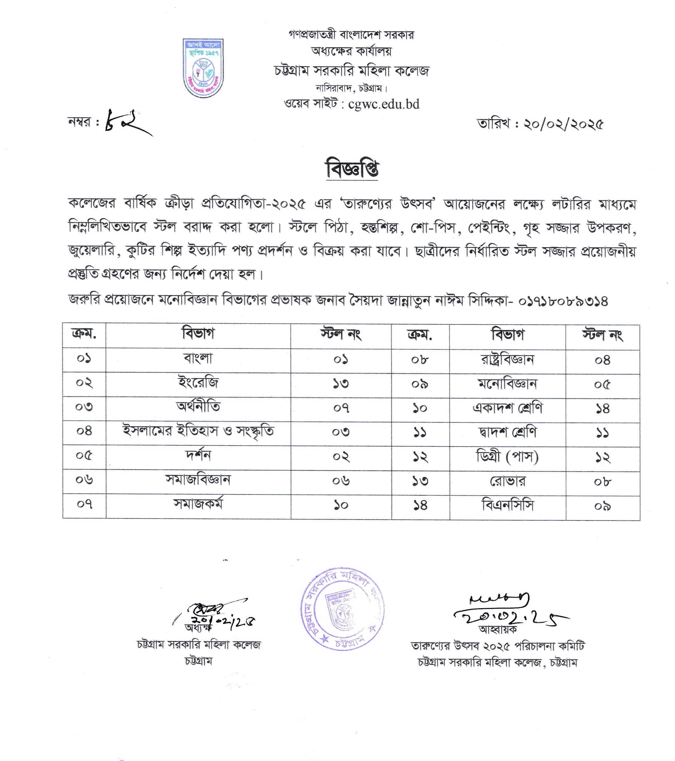 কলেজের বার্ষিক ক্রীড়া প্রতিযোগিতা-২০২৫ এর স্টল বরাদ্দ সংক্রান্ত বিজ্ঞপ্তি